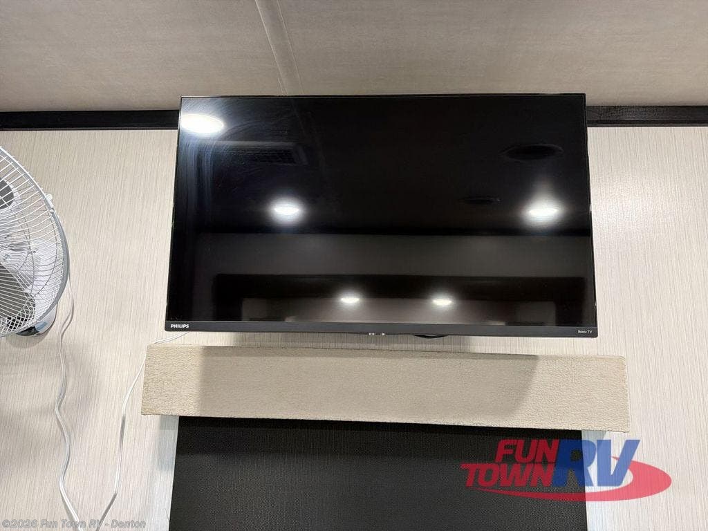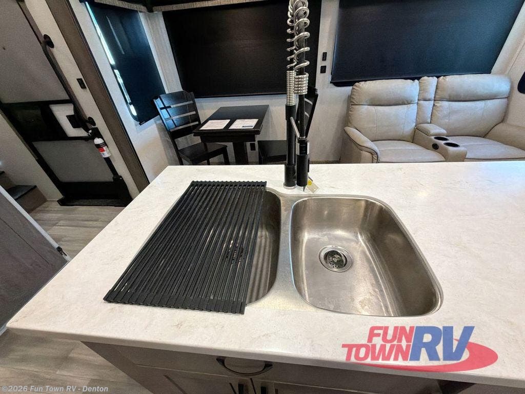 With two bedrooms in this fifth wheel, the whole family can camp together! The front private bedroom has a king bed slide to lay your head at night, a dresser with a TV, and a front wardrobe with storage shelves to keep your clothes looking nice. The second bedroom has a 91" x 64- 3/4" loft above a tri-fold sofa slide that is across from an area for a TV and wardrobe, and you could even switch out the sofa for an optional 73" desk to get some work done while you are away. Everyone can freshen up in the full bathroom with a shower with a seat and their bellies full with a kitchen island and 20 cu. ft. stainless steel refrigerator with ice maker. And for easy clean up add the optional dishwasher to the kitchen island. You can even cook your meals while breathing in some fresh air with the exterior camp kitchen. After a fun day outdoors, head to the rear living area and relax on either the hide-a-bed sofa or the power theater seating across from the fireplace and 50" flat screen TV!