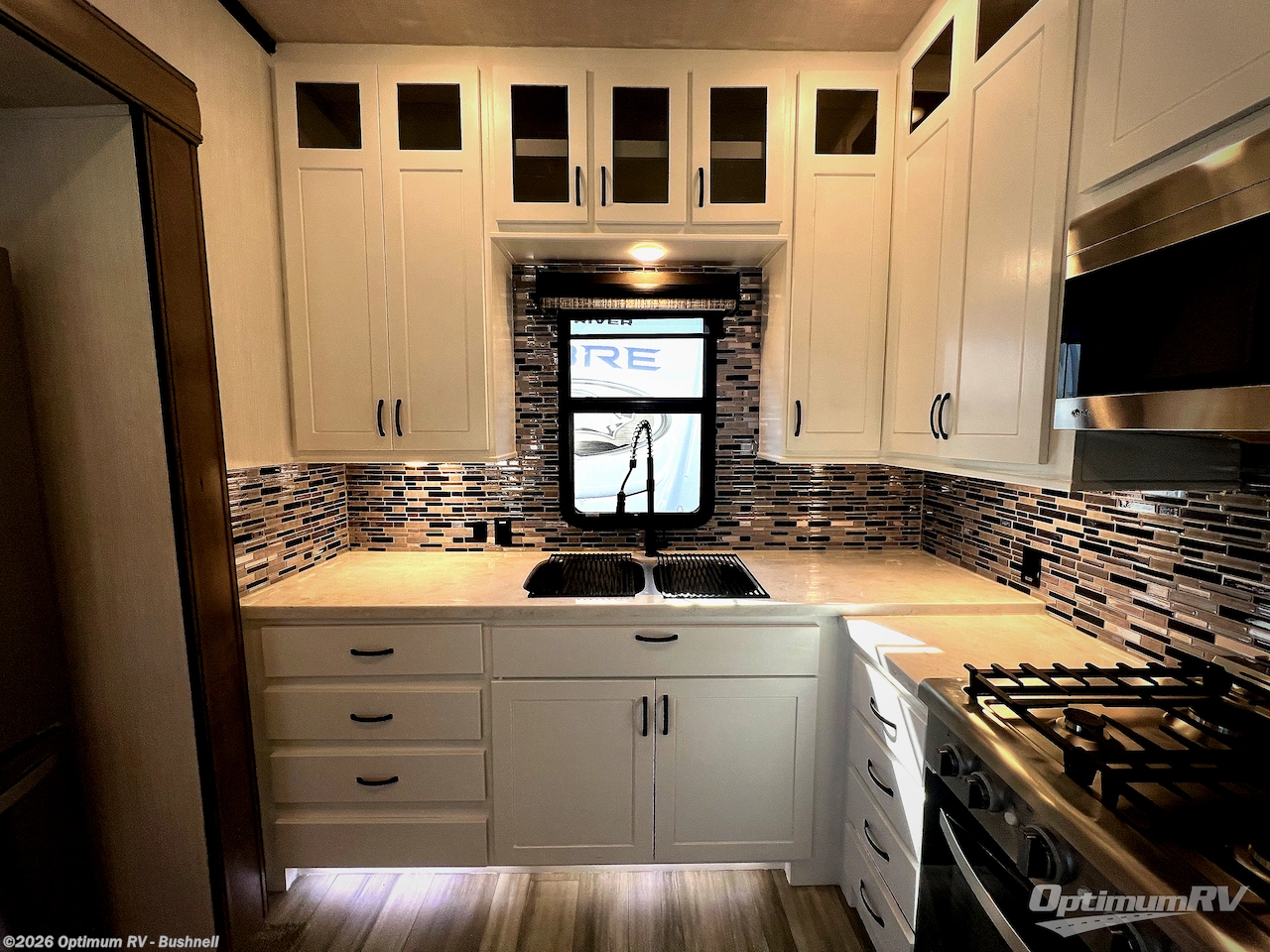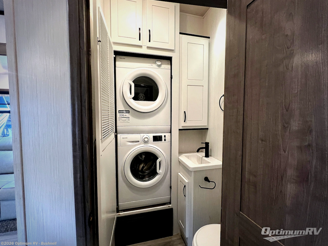 If you need to get some work done while you are camping in this fifth wheel then you will appreciate the desk with a chair! The rear kitchen has plenty of countertop space and a free standing 24" gas range for you to prepare your best meals, a 20 cu. ft. stainless steel electric refrigerator with ice maker to store any leftovers, and a free standing table to enjoy your meals then play card games. The hide-a-bed sofa slide opens up the living area which also has power theater seating with USB charging across from an entertainment center with a fireplace and 50" flat screen TV to watch your favorite movies. The half bathroom has an area prepped to add an optional washer and dryer so you can have clean clothes throughout your entire trip. Inside the master suite is a king bed slide and access to the front full bathroom which has a walk-in closet with a bench, a 48" x 30" shower with a seat, and a dual sink vanity for two to get ready at once. You can even choose to add the optional pull-out kitchen to cook your meals while breathing in fresh air!