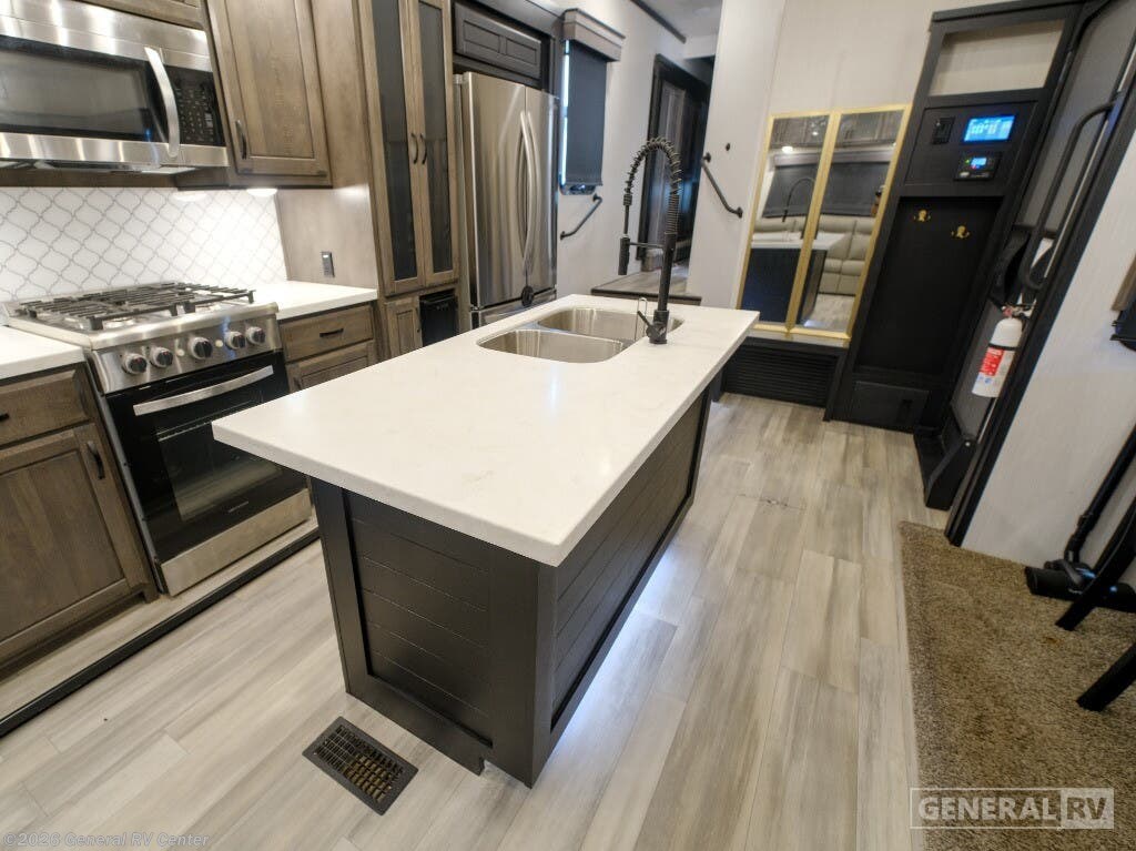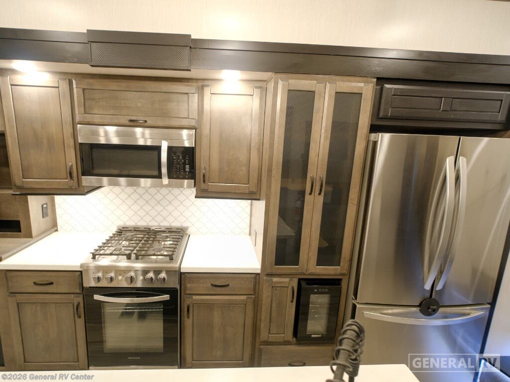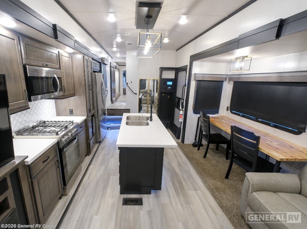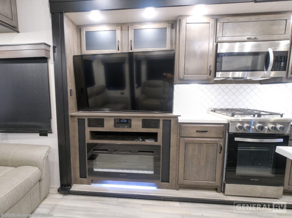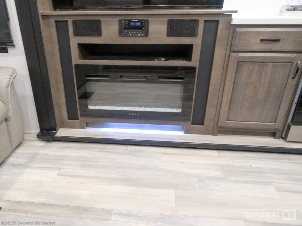 Experience the epitome of luxury travel with the 2022 Forest River Cedar Creek Champagne Edition 38EBS. This fifth wheel is designed to provide a home-like comfort while you explore the great outdoors. With its expansive 43-foot length and four slide-outs, it offers a spacious living area perfect for entertaining or relaxing. The rear living room features power theater seats and a cozy fireplace, creating an inviting atmosphere for movie nights or quiet evenings. The center kitchen, equipped with a full-size electric refrigerator and a four-burner cooktop, is a chef's delight, offering ample space and convenience for preparing your favorite meals. The front bedroom is a sanctuary of comfort, featuring a king-sized bed with abundant storage options, including a step-down dresser and a spacious wardrobe. The center bath boasts a 48-inch shower, ensuring a refreshing start to your day. Outside, the 21-foot powered retractable awning extends your living space, providing shade and comfort for outdoor gatherings. With a robust cargo capacity and all the amenities you need, the Cedar Creek Champagne Edition 38EBS is your perfect companion for unforgettable adventures. For more details, visit your nearest General RV Dealership.