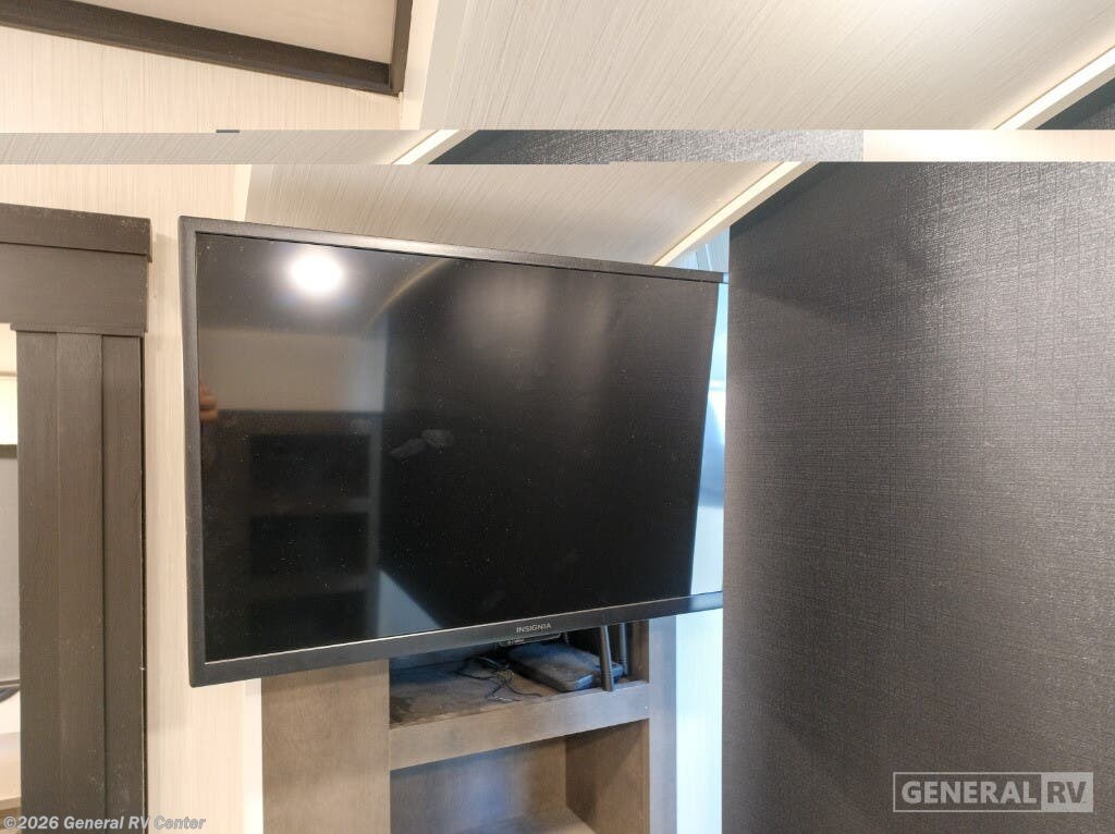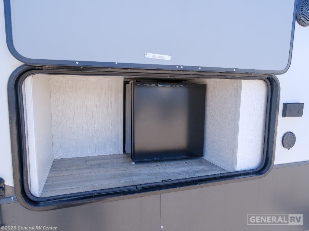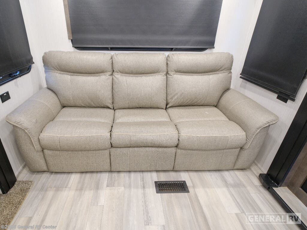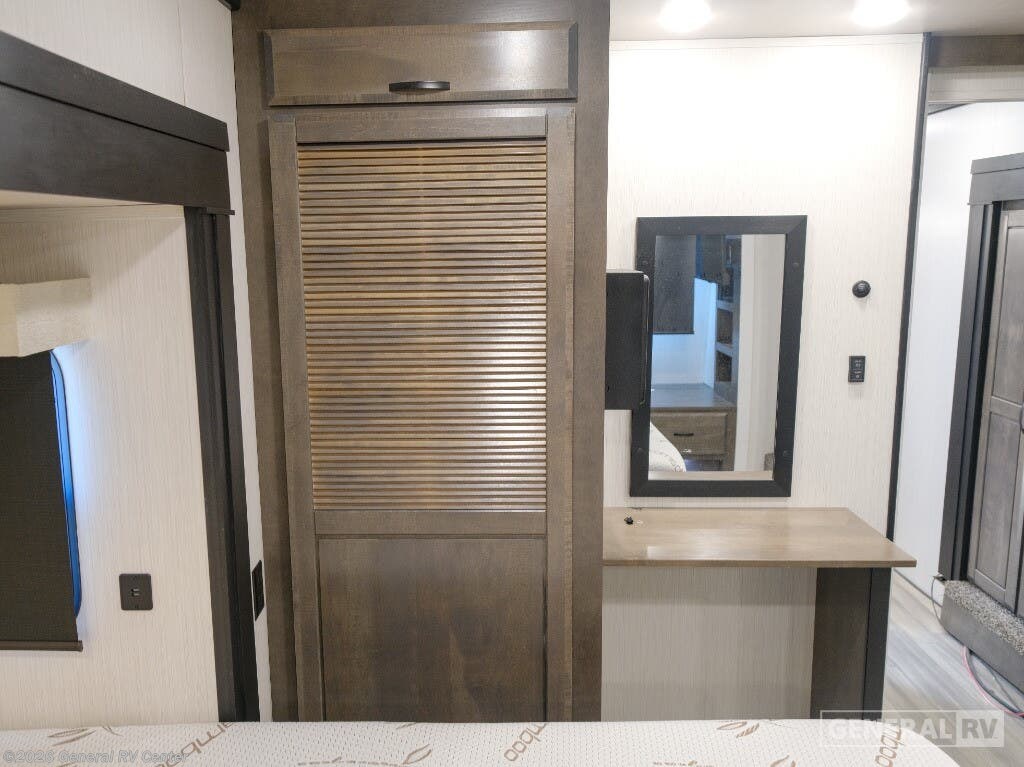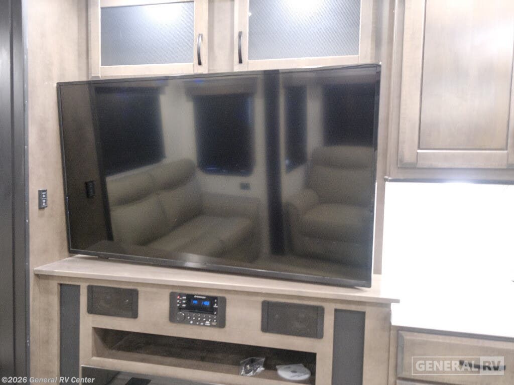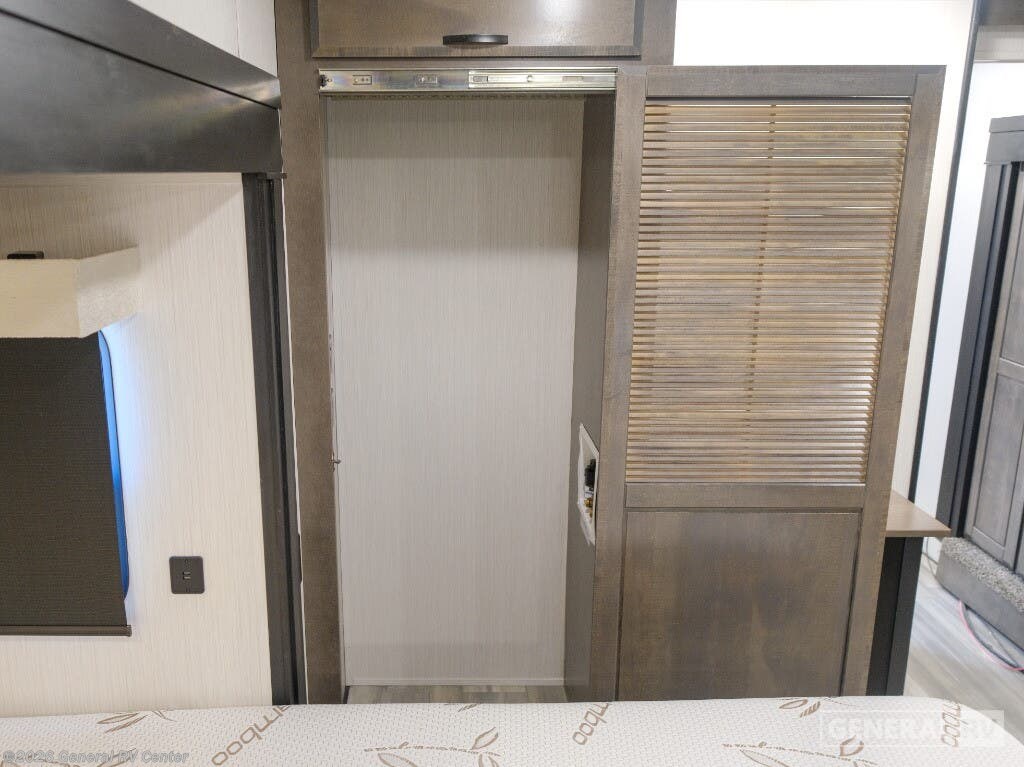 Experience the epitome of luxury travel with the 2022 Forest River Cedar Creek Champagne Edition 38EBS. This fifth wheel is designed to provide a home-like comfort while you explore the great outdoors. With its expansive 43-foot length and four slide-outs, it offers a spacious living area perfect for entertaining or relaxing. The rear living room features power theater seats and a cozy fireplace, creating an inviting atmosphere for movie nights or quiet evenings. The center kitchen, equipped with a full-size electric refrigerator and a four-burner cooktop, is a chef's delight, offering ample space and convenience for preparing your favorite meals. The front bedroom is a sanctuary of comfort, featuring a king-sized bed with abundant storage options, including a step-down dresser and a spacious wardrobe. The center bath boasts a 48-inch shower, ensuring a refreshing start to your day. Outside, the 21-foot powered retractable awning extends your living space, providing shade and comfort for outdoor gatherings. With a robust cargo capacity and all the amenities you need, the Cedar Creek Champagne Edition 38EBS is your perfect companion for unforgettable adventures. For more details, visit your nearest General RV Dealership.