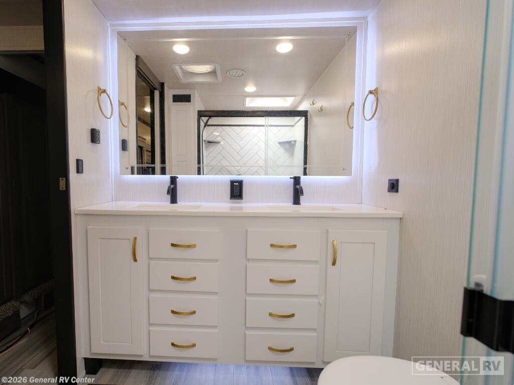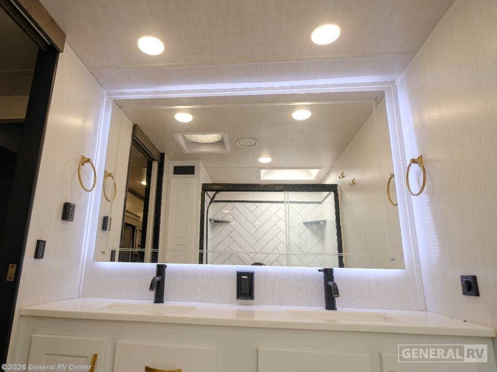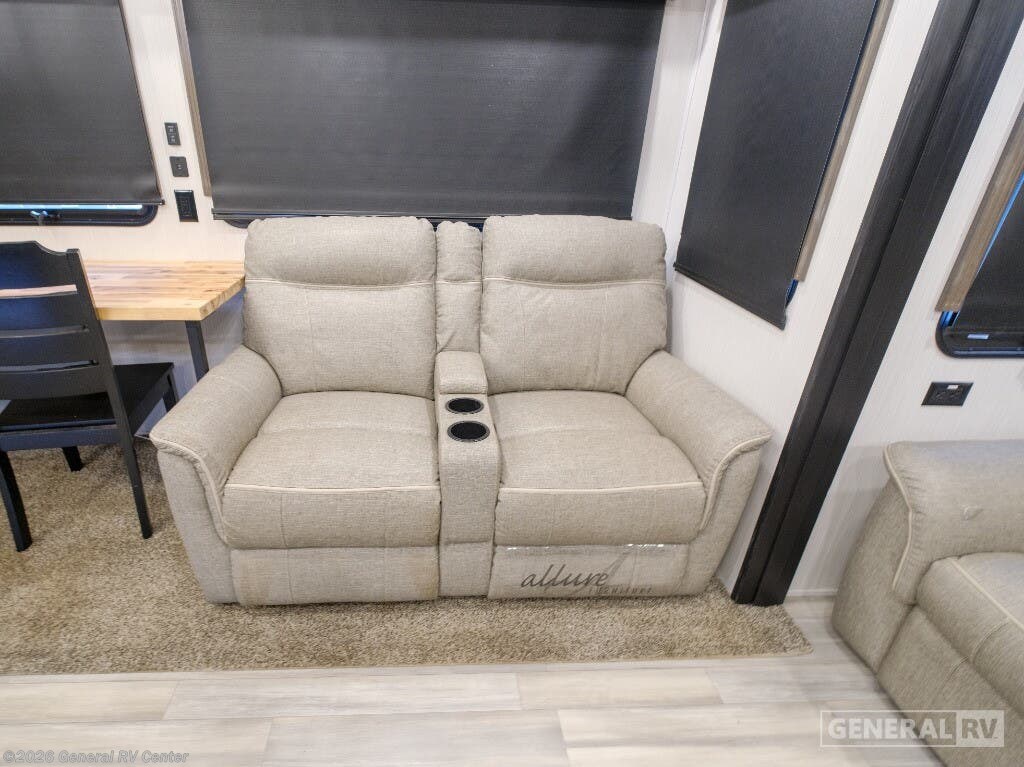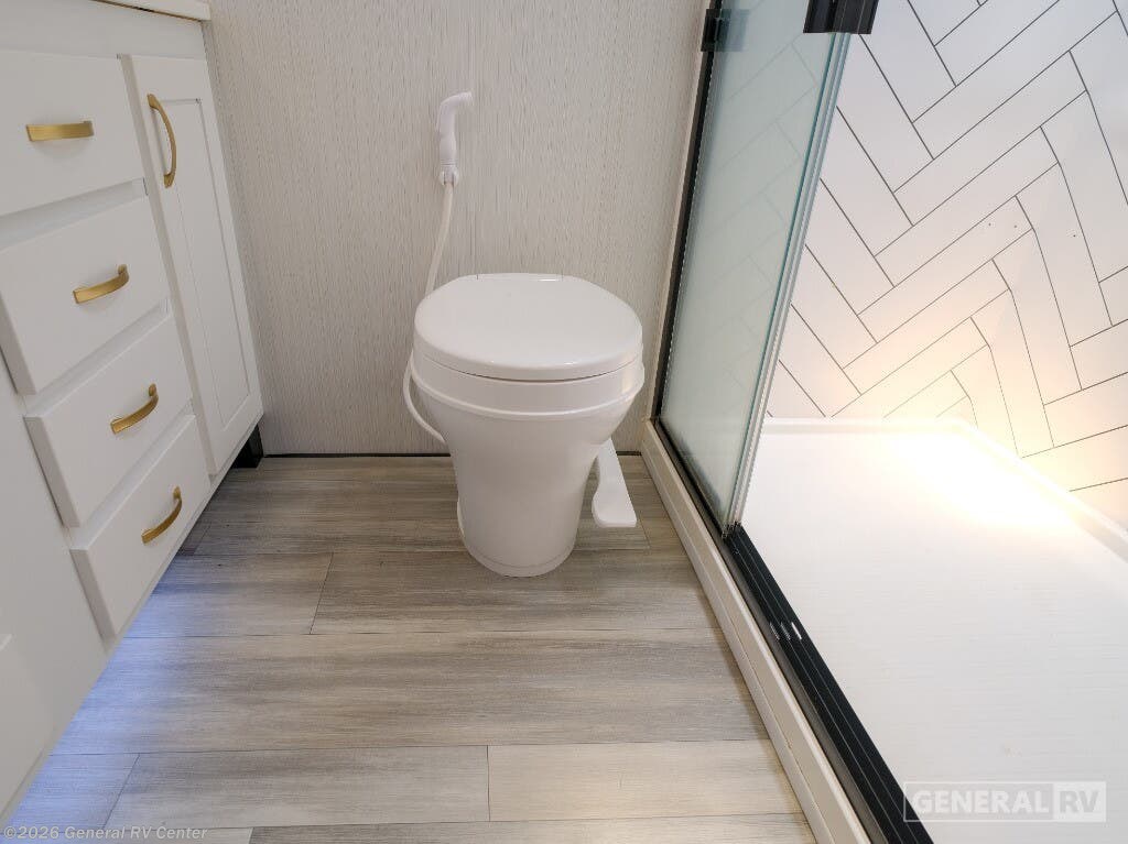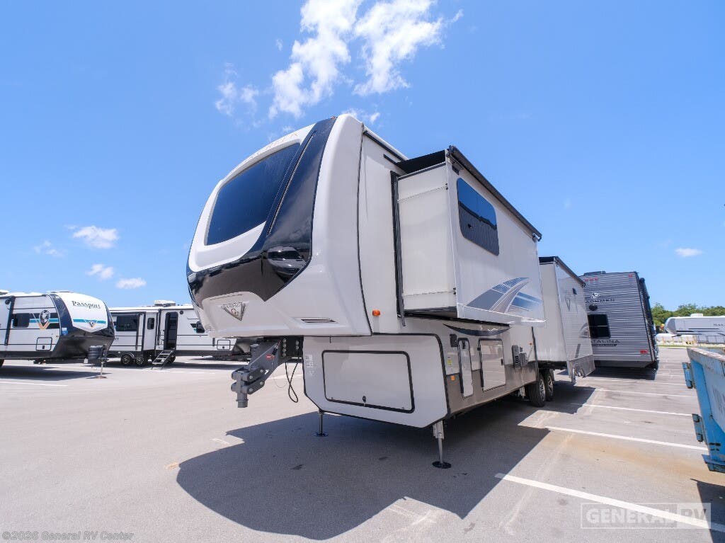Experience the epitome of luxury travel with the 2022 Forest River Cedar Creek Champagne Edition 38EBS. This fifth wheel is designed to provide a home-like comfort while you explore the great outdoors. With its expansive 43-foot length and four slide-outs, it offers a spacious living area perfect for entertaining or relaxing. The rear living room features power theater seats and a cozy fireplace, creating an inviting atmosphere for movie nights or quiet evenings. The center kitchen, equipped with a full-size electric refrigerator and a four-burner cooktop, is a chef's delight, offering ample space and convenience for preparing your favorite meals. The front bedroom is a sanctuary of comfort, featuring a king-sized bed with abundant storage options, including a step-down dresser and a spacious wardrobe. The center bath boasts a 48-inch shower, ensuring a refreshing start to your day. Outside, the 21-foot powered retractable awning extends your living space, providing shade and comfort for outdoor gatherings. With a robust cargo capacity and all the amenities you need, the Cedar Creek Champagne Edition 38EBS is your perfect companion for unforgettable adventures. For more details, visit your nearest General RV Dealership.