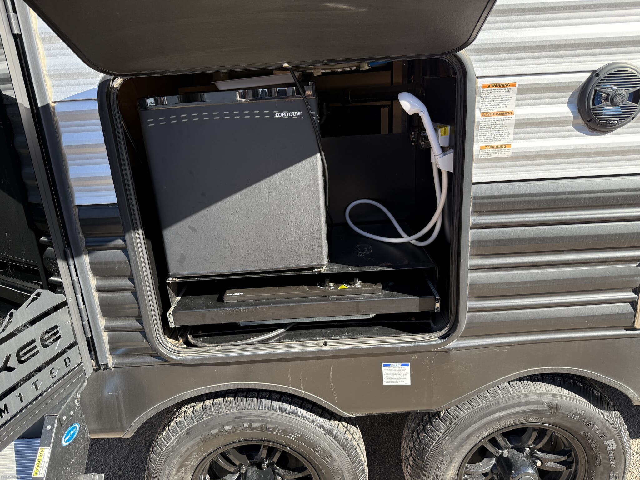 Electric Jack, Enclosed Underbelly, Exterior Refrigerator, External Shower, Hitch, Leveling Jacks, Outside Kitchen, Power Awning, Screen Door, Skylight, Slideout, Tinted Windows -
