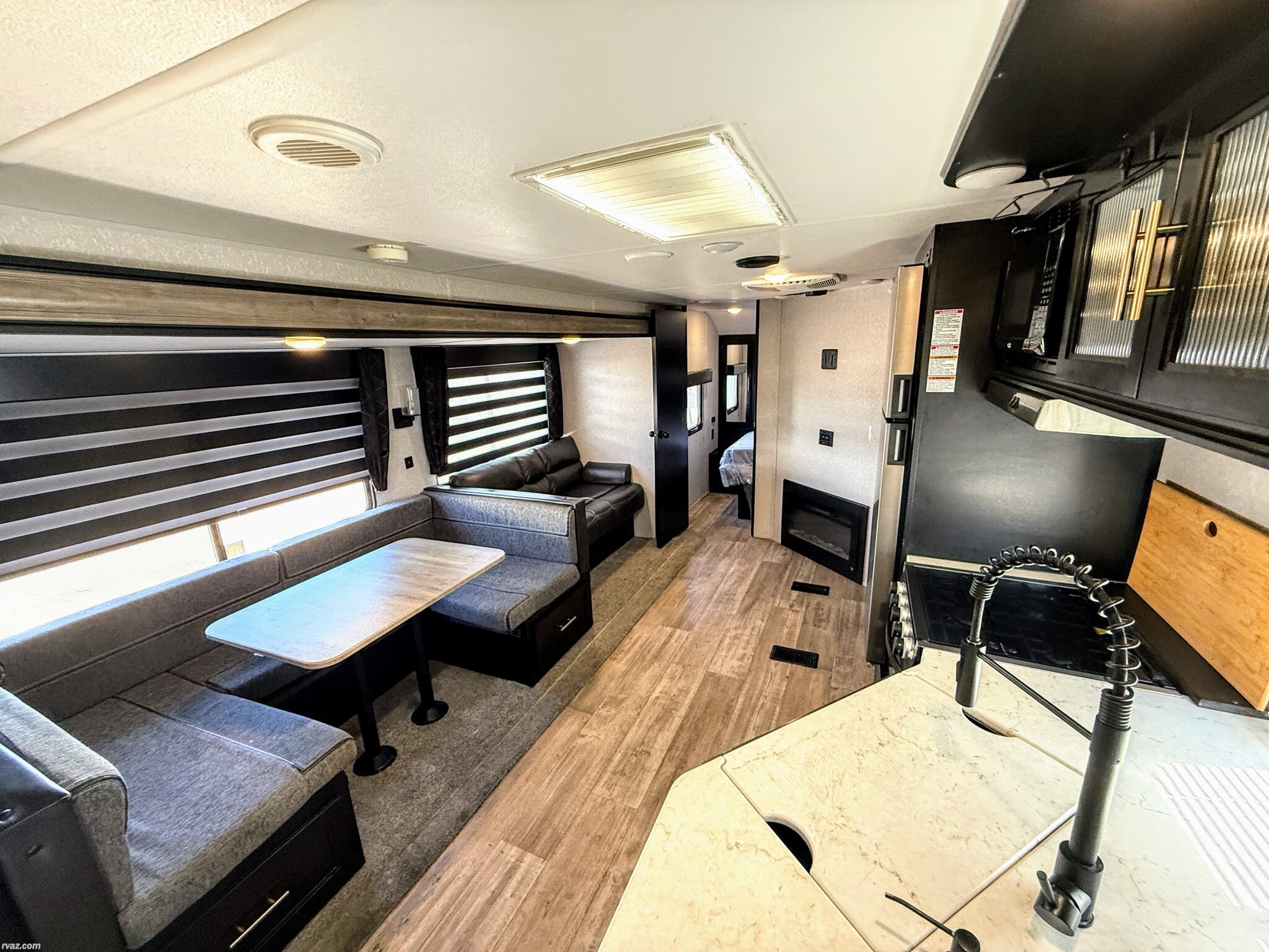 Bunk Beds, Bunkhouse, Dinette Bed, Fireplace, Kitchen Sink, Medicine Cabinet, Non-Smoking Unit, Pantry, Pet Friendly, Queen Bed, Self Contained, Shower, Sofa Bed, Toilet, U-Shaped Dinette