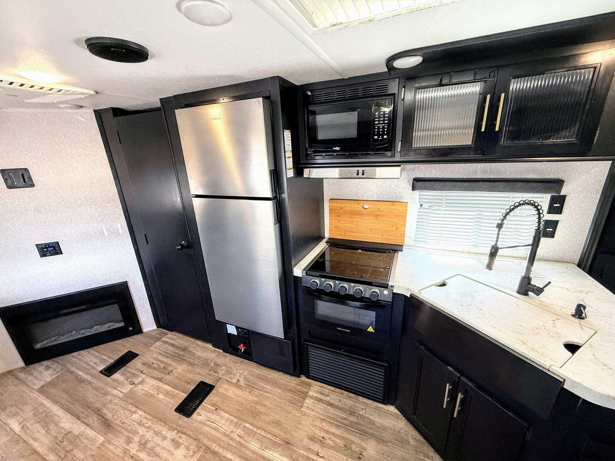 Enclosed Water Tank, Furnace, Microwave, Oven, Refrigerator, Refrigerator (12V), Stove Top Burner, Water Heater -