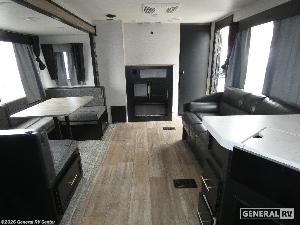 Forest River Cherokee travel trailer 274BRB highlights: Bunk Beds Sofa Front Private Bedroom Outside Storage Outside Kitchen You won't believe all that is included with this travel trailer! Starting with the dual entry doors for a smooth flow of traffic to the outside storage areas, the outside TV mount, the outside kitchen, and the rear storage rack. The kiddos or guests can sleep on the set of double bunk beds with a ladder which are conveniently next to the rear corner bathroom that has a tub/shower and an entrance/exit door. The U-shaped dinette and sofa can also transform into extra sleeping spaces if needed. Lay your head at night on the walk around queen bed with wardrobes on either side, a TV mount area, and a linen closet for your clothes. There is even a fireplace below the TV mount at the entertainment center for a cozy evening indoors! If the open road is calling your name, then answer it with one of these Forest River Cherokee travel trailers or toy haulers! A seamless roofing membrane with heat reflectivity covers these units and an armored underbelly tank enclosure protects it from road debris. The Power Gear frame technology holds them together and also comes with a space saver rail design. An outside shower with hot and cold water helps to keep the dirt outside where it belongs. With the Campfire package, you will get a beautiful entertainment center to watch your favorite movies, a sink cover for more prepping space, and a 6 gallon DSI gas/electric water heater for hot showers each morning. The Cherokee Total Control app and remote control system allows you to control your unit at the touch of a finger. A few other features you will appreciate include a super kitchen, USB charging station, and light filtering sheer shading premium blackout zebra shades for added privacy. Come find your favorite model today!