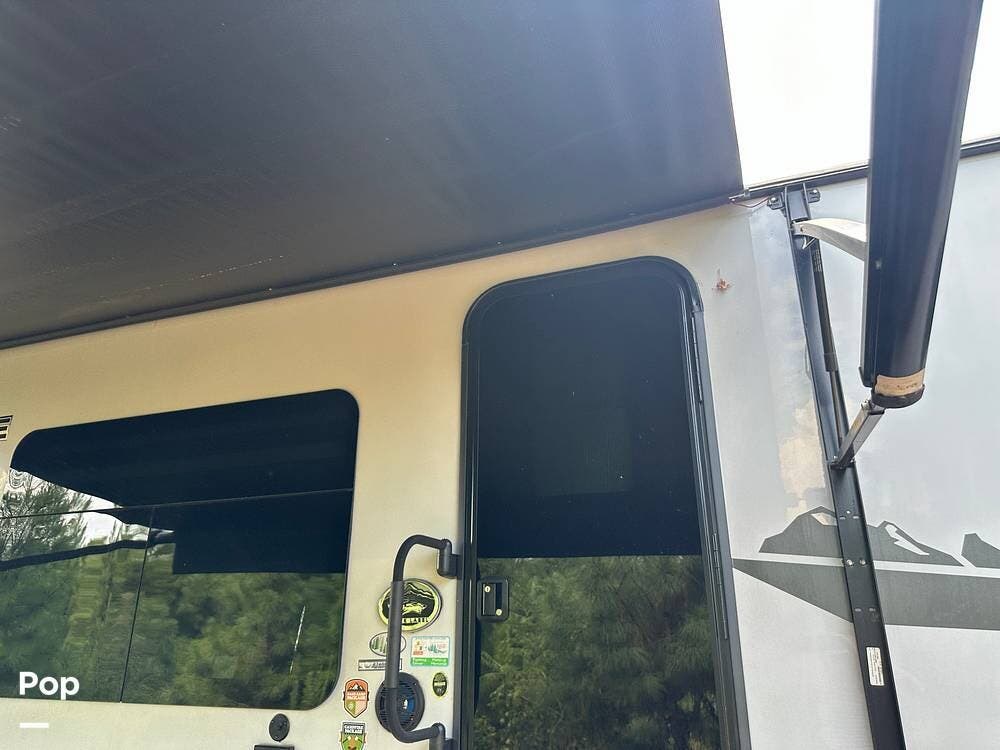Outside, you have a power awning that will help you enjoy the outdoor kitchen, and there is a large front storage with tons of space for all your gear for those long trips.