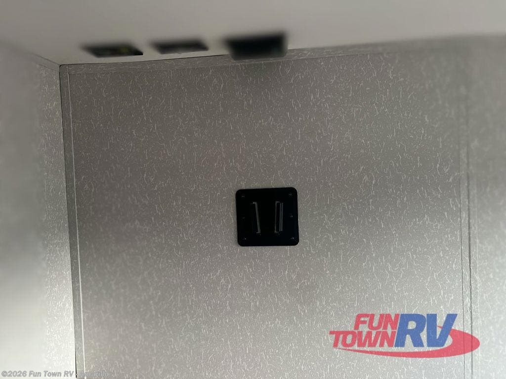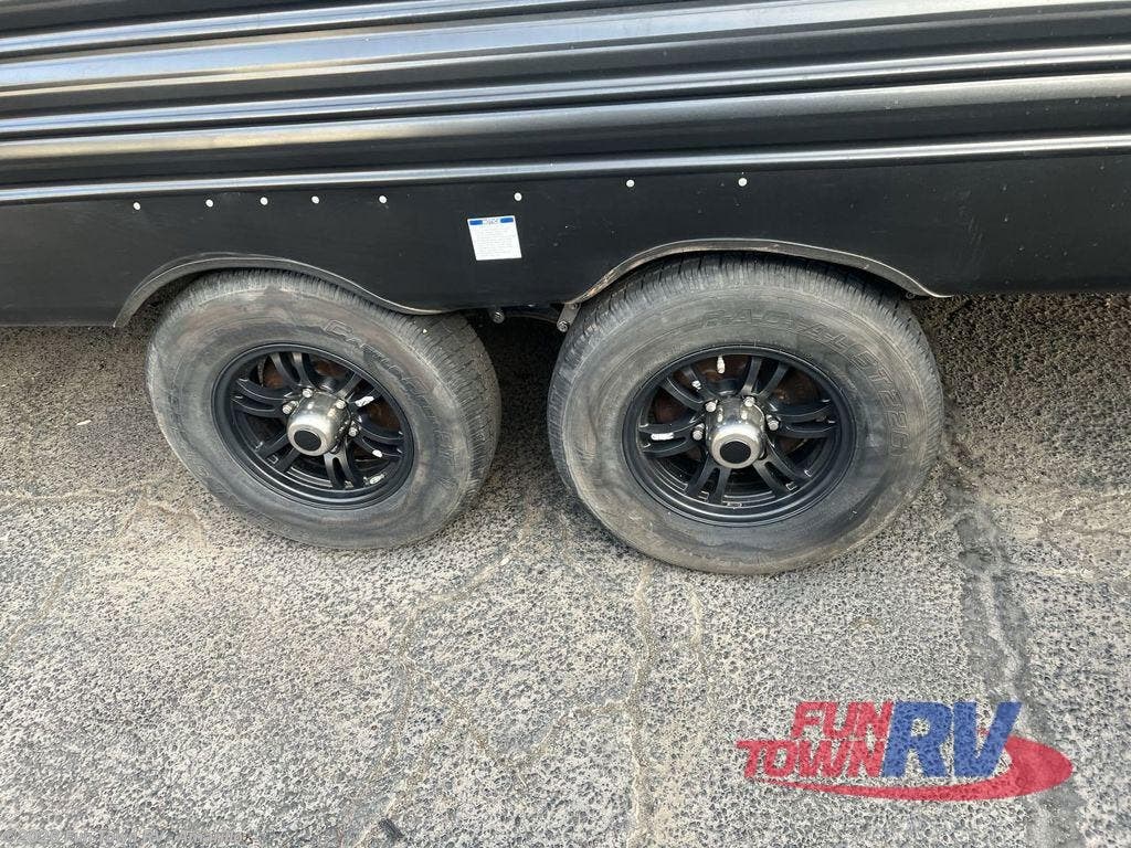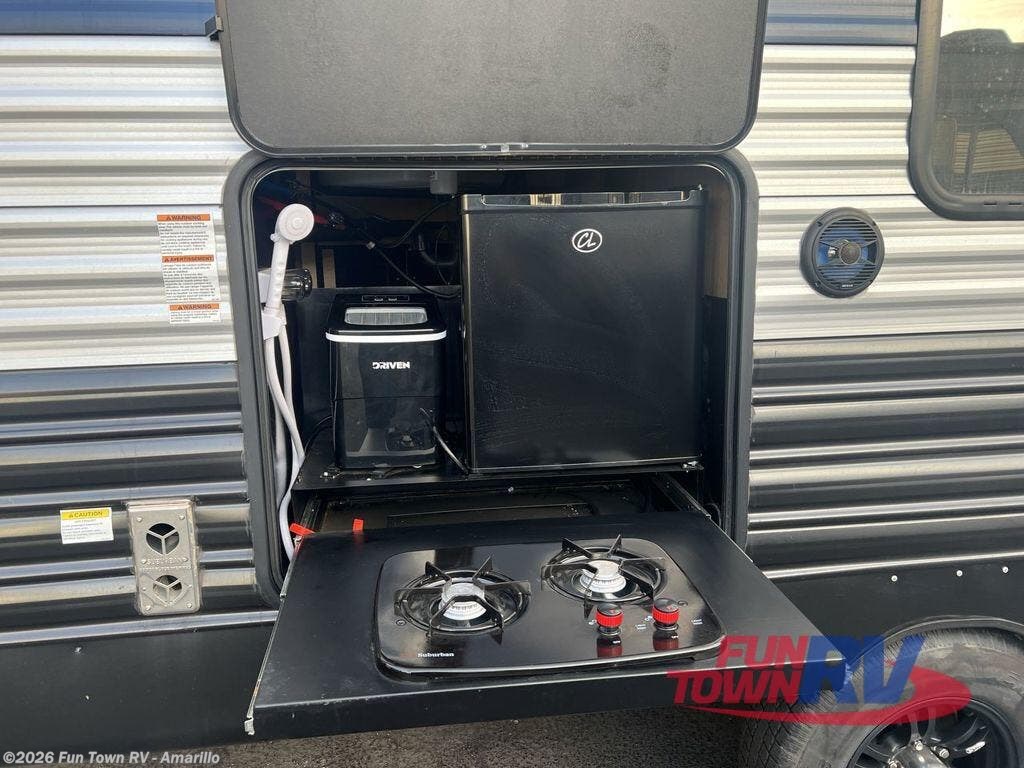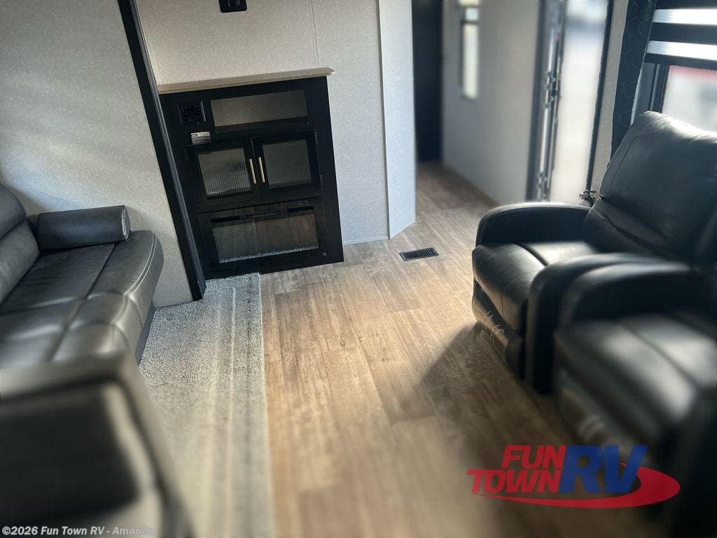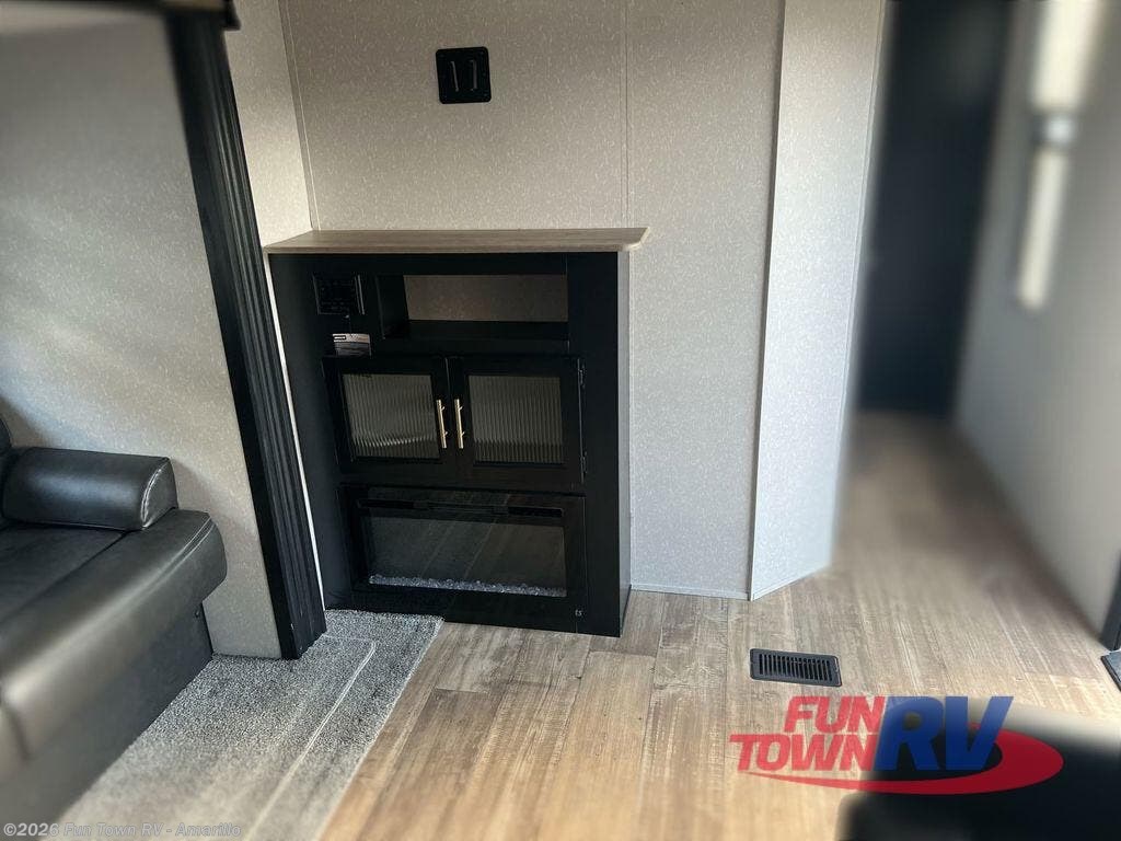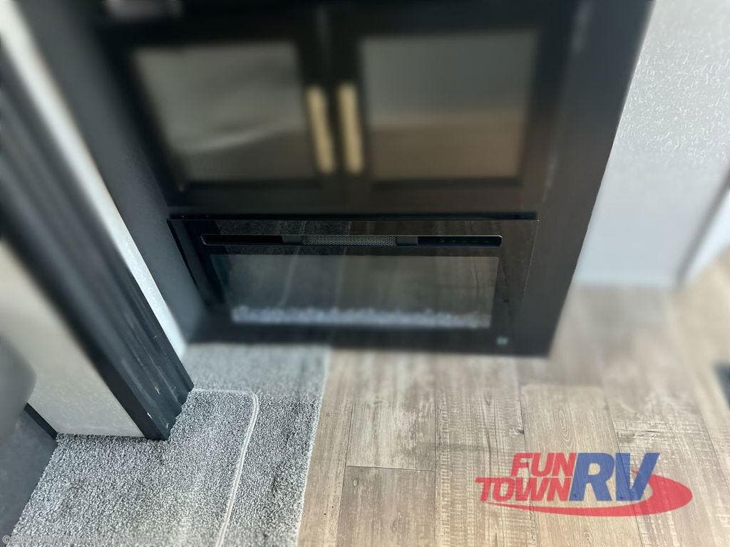 The chef will love cooking in this travel trailer! It not only has a rear kitchen with a large pantry, three burner cooktop with oven, and a Cannon high efficiency 11 cu. ft. refrigerator with travel lock, but also an outside kitchen with a two burner cooktop, a refrigerator, and a sink for clean up. The two recliners and sofa have a good view of the entertainment center with a TV mount and fireplace to enjoy at night. The booth dinette offers a comfortable place to enjoy meals and even transform into an extra sleeping space, plus it has two 40" storage drawers to store games, blankets, and extra cooking essentials. The dual entry bathroom has a radius shower to freshen up in, a linen closet to keep your towels close by, and an entrance into the front private bedroom which has a walk around queen bed with wardrobes on either side to hang your clothes!