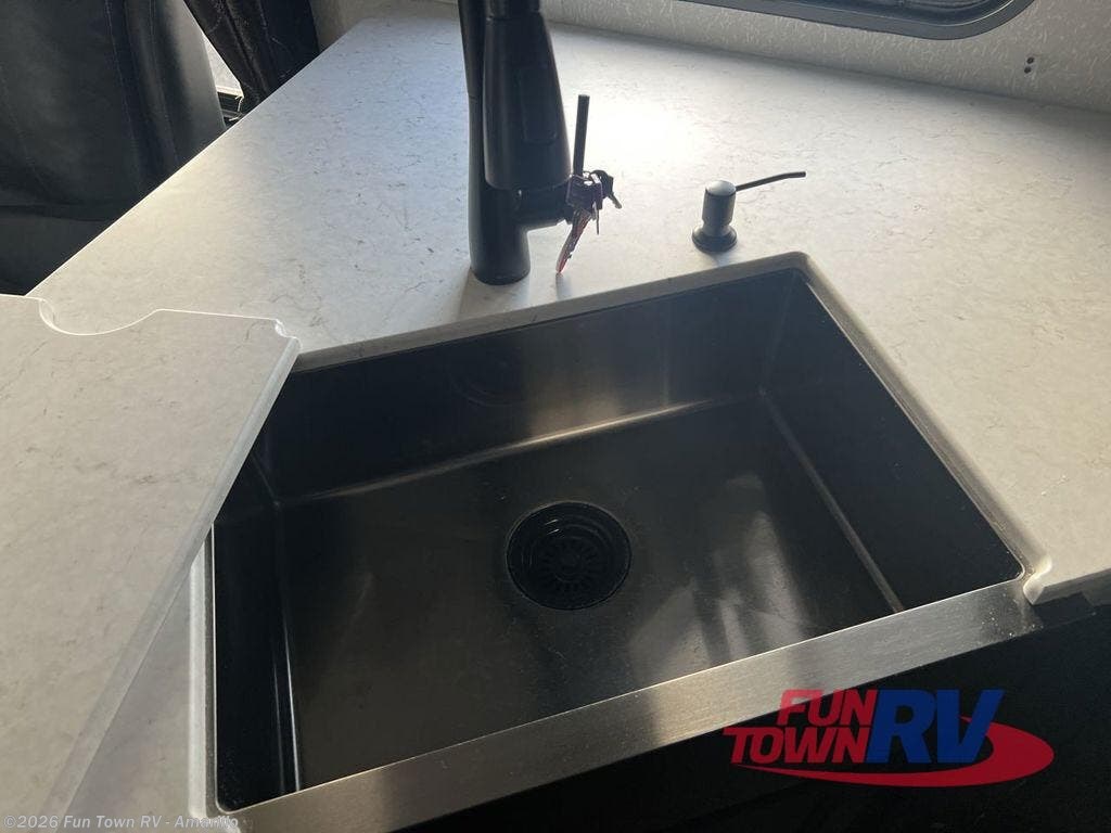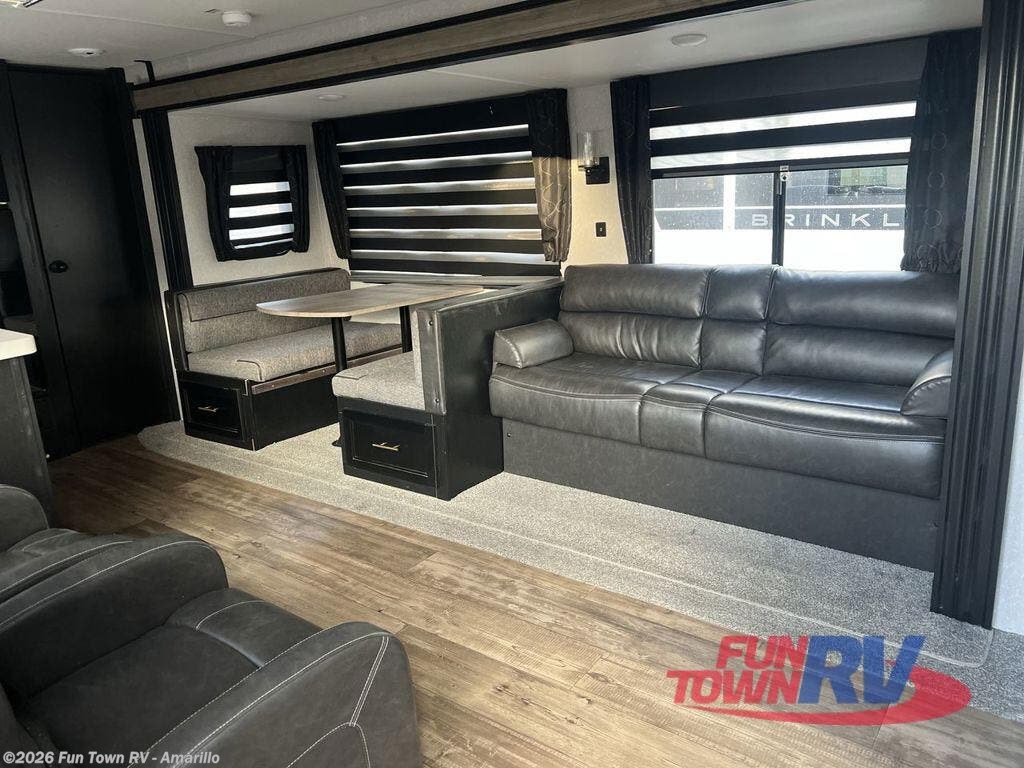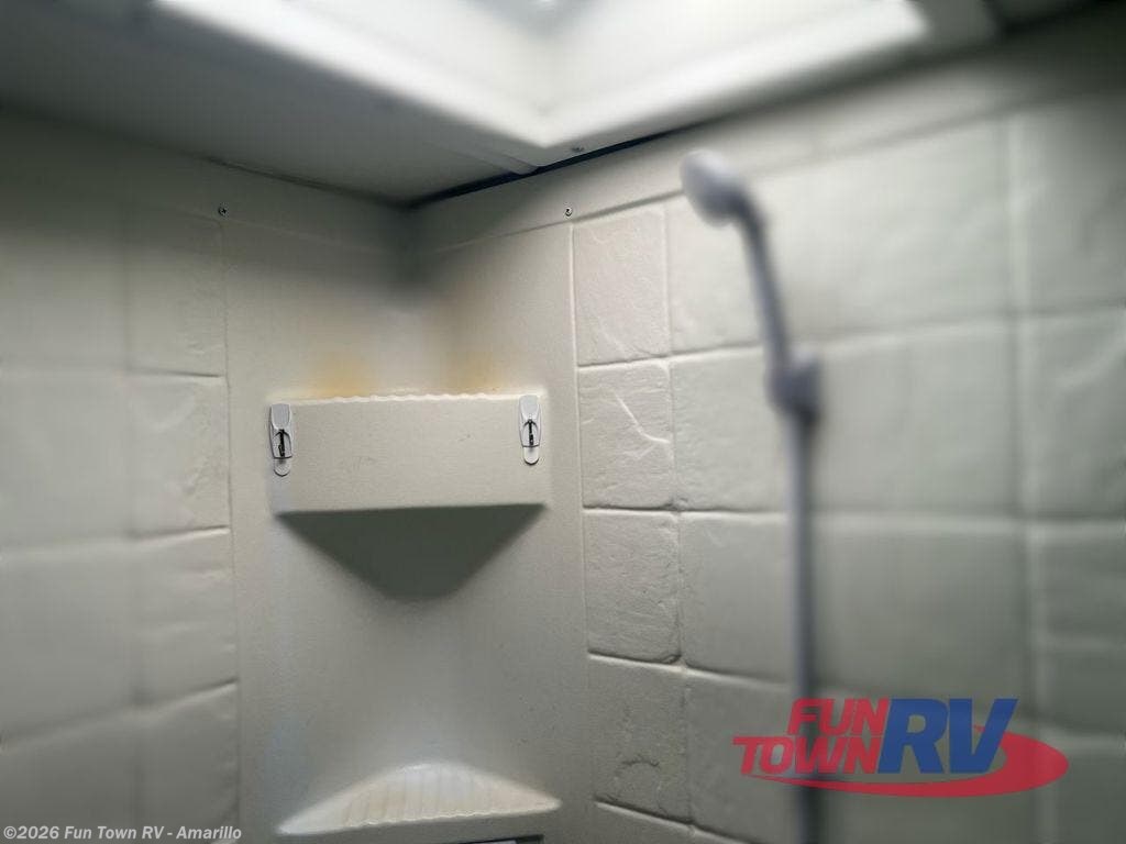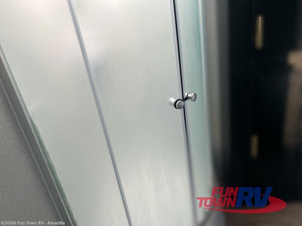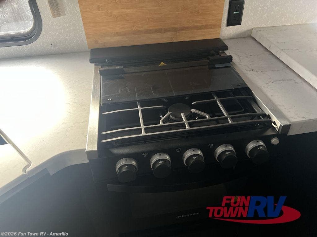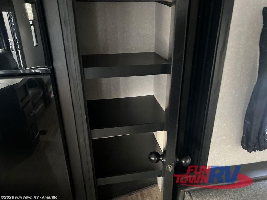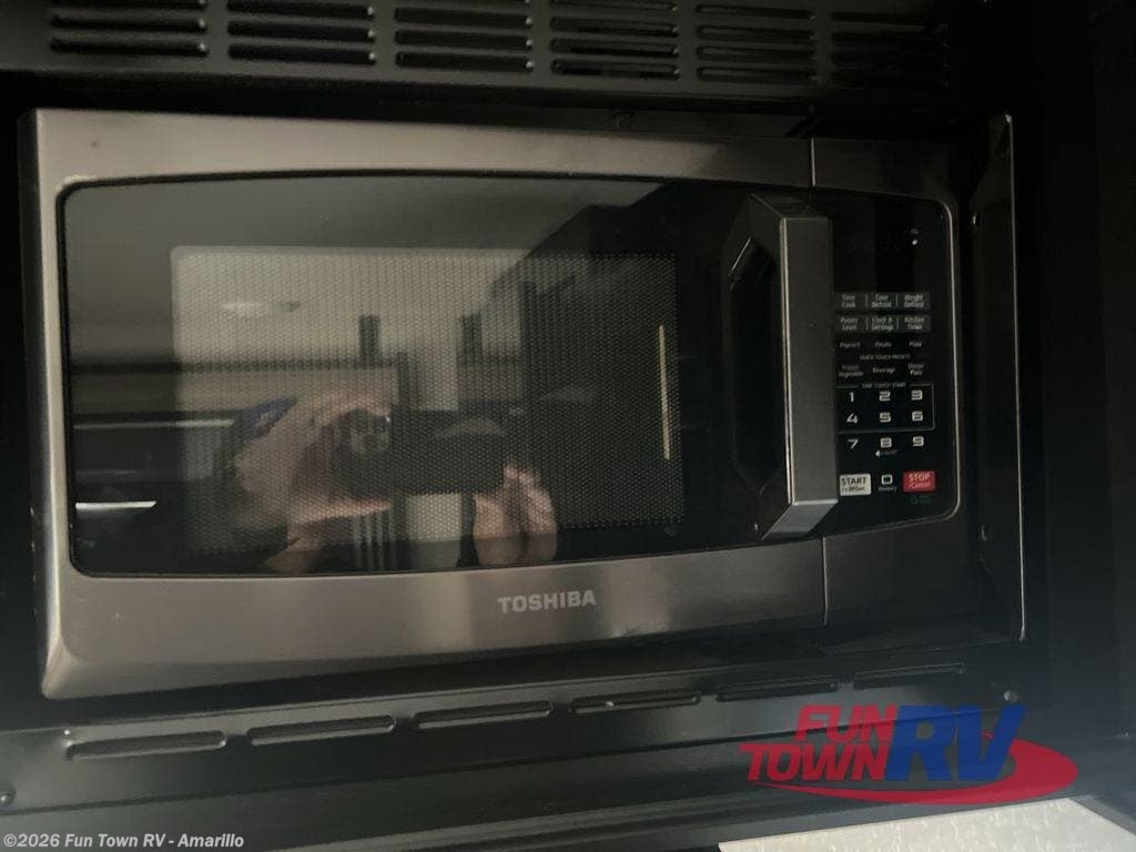 The chef will love cooking in this travel trailer! It not only has a rear kitchen with a large pantry, three burner cooktop with oven, and a Cannon high efficiency 11 cu. ft. refrigerator with travel lock, but also an outside kitchen with a two burner cooktop, a refrigerator, and a sink for clean up. The two recliners and sofa have a good view of the entertainment center with a TV mount and fireplace to enjoy at night. The booth dinette offers a comfortable place to enjoy meals and even transform into an extra sleeping space, plus it has two 40" storage drawers to store games, blankets, and extra cooking essentials. The dual entry bathroom has a radius shower to freshen up in, a linen closet to keep your towels close by, and an entrance into the front private bedroom which has a walk around queen bed with wardrobes on either side to hang your clothes!
