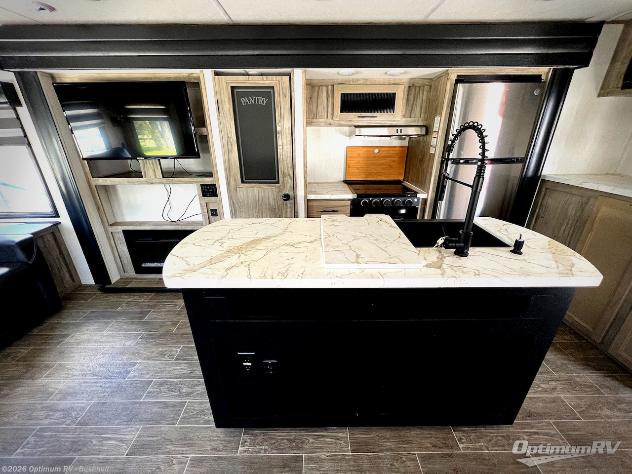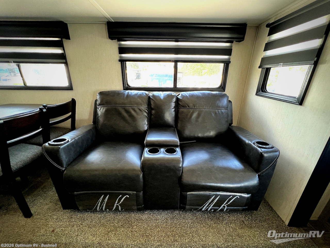 This trailer has it all for maximum comfort and convenience as well as entertainment! The rear living area includes a deluxe tri-fold hide-a-bed sofa with a panoramic rear window for great views of your campsite, and dual opposing slides widen this area so you can visit with friends while sitting on the home theatre seats with heat, light, and massage function with cupholders, and/or the free-standing table with two fixed and two folding chairs. Enjoy the fireplace on a cool night or when you want a little ambiance while seated inside. In the kitchen, the island will be handy for food prep and serving, and the unique coffee bar will be a favorite as well. Two patio awnings will provide an outdoor living area, just grab your camping chairs from the full pass-through storage. When you call it a night, fall quickly to sleep on the queen bed in the front bedroom with easy access to a dual entry bathroom which offers a radius shower with opaque glass doors.