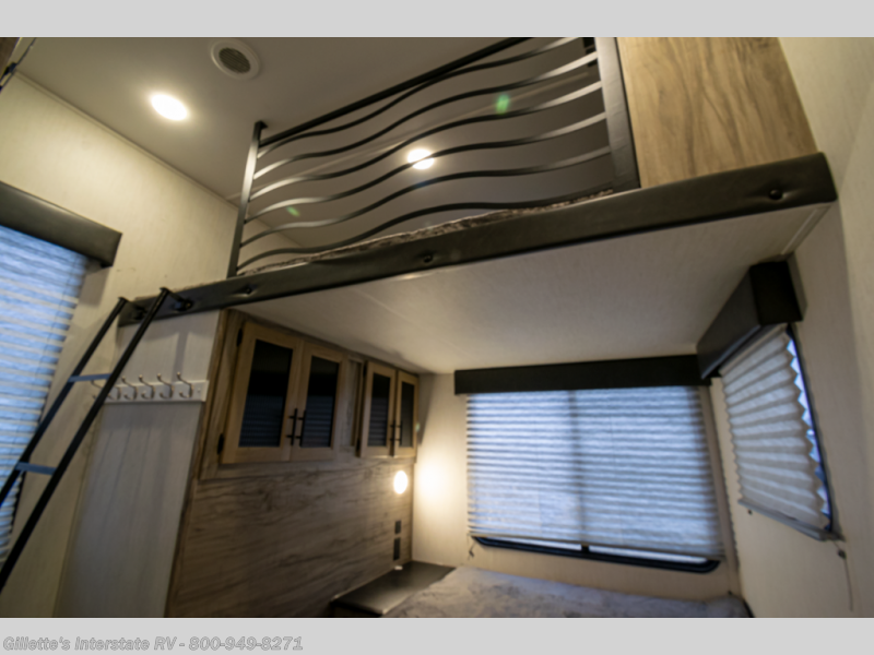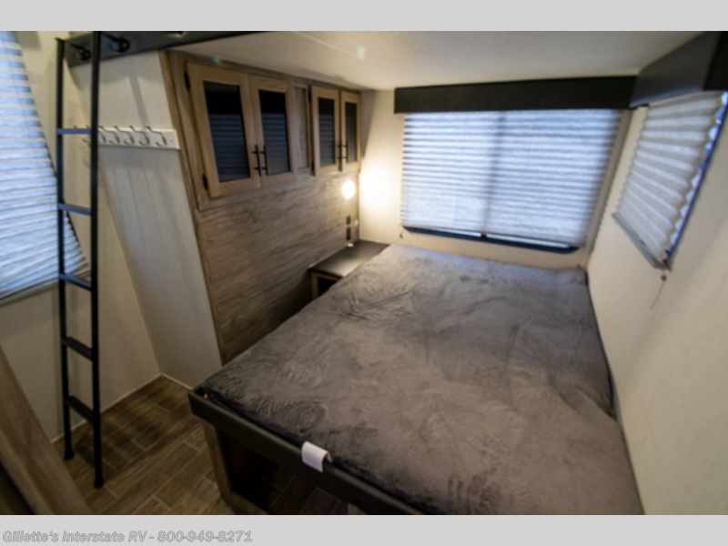 This Cherokee Arctic Wolf Suite fifth wheel is an excellent choice if you have a large family that wants to get away! Not only is there a private bedroom up front for you, but there is also a bedroom suite in the back. This suite has a 54" x 74" bed next to some wardrobe storage, a 60" x 80" loft above the bed with a ladder, a half bathroom all to itself, and the second exterior entry door. What a space! You'll also be highly impressed with the living area because it has a large slide that holds two sets of home theater seating with removable tables in front. Now you can sit down and enjoy dinner while you watch the optional residential-size LED TV that you added above the fireplace. The large pantry is another feature you'll appreciate since it can store all of the food needed to feed your group, and the Juice Pack 50W solar panel will help your unit stay powered wherever you camp.