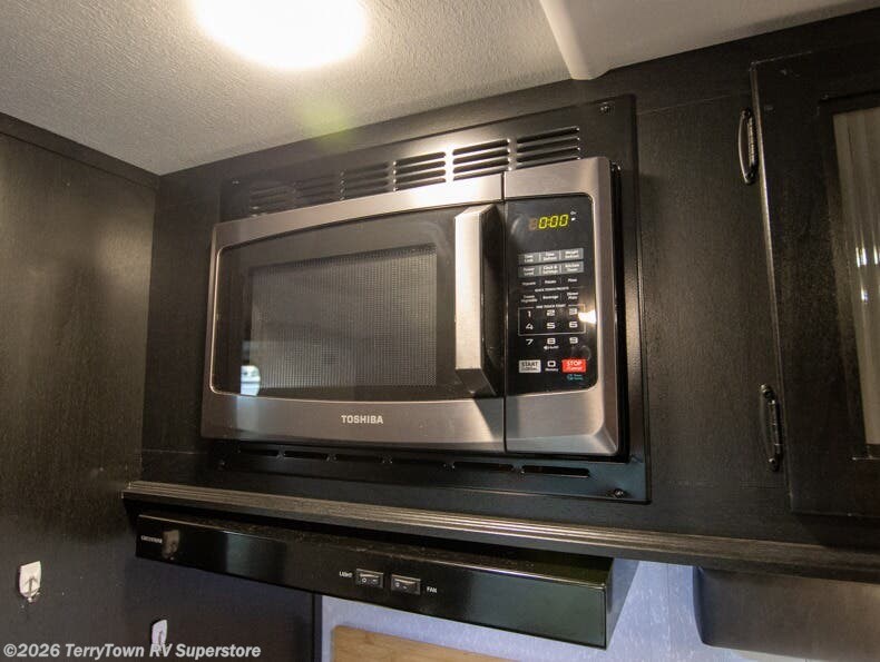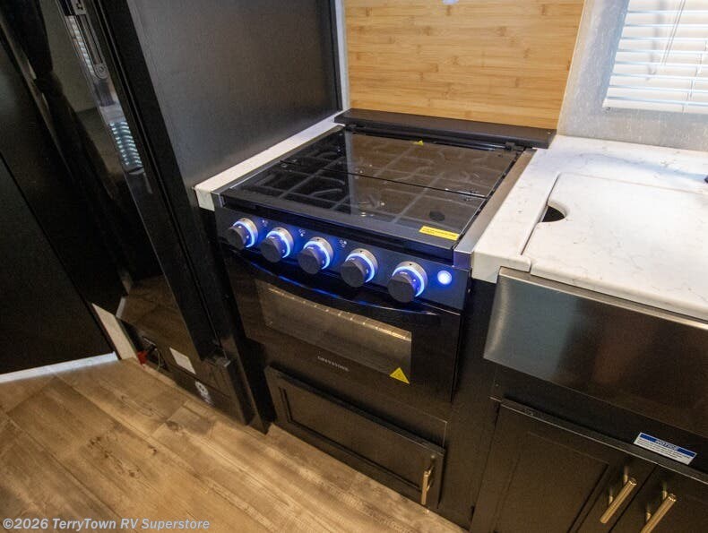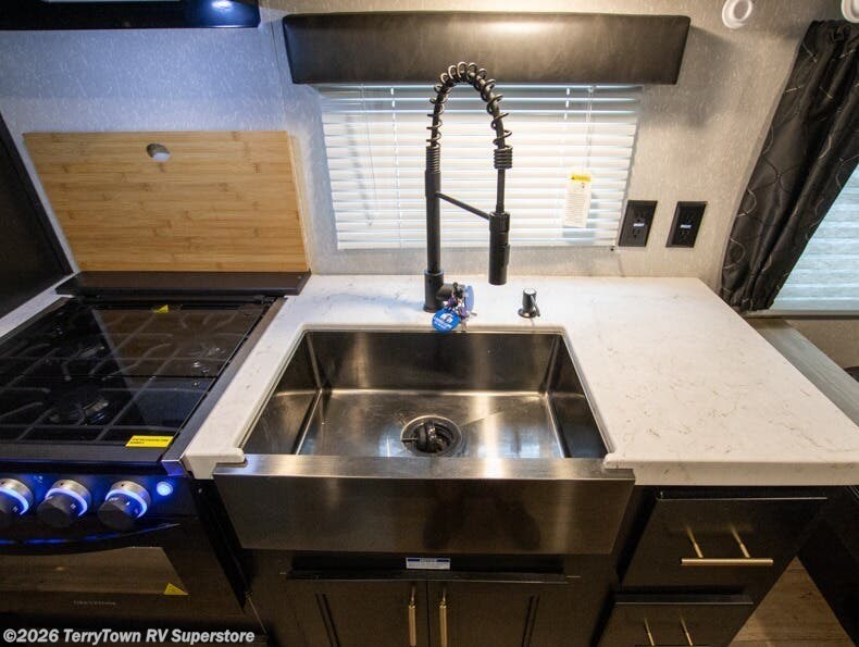 Enjoy cooking for nine in this Cherokee Grey Wolf travel trailer. With a three-burner cooktop, an overhead microwave, and an oven, you can easily cook just like home. The residential farm-style stainless steel sink makes cleaning your larger pots and pans quite simple, and the large overhead cabinets make storage an easy task as well. There is plenty of seating for the whole gang with the sofa and the booth dinette to play a game or two after you have enjoyed your delicious meal. Your kiddos are sure to love having their own set of double-size bunks conveniently located next to the rear bath, and you will love having your own front semi-private bedroom when you close the privacy curtain. You can also create some outdoor living space beneath the 15' power awning so that you can enjoy the great outdoors whether rain or shine!