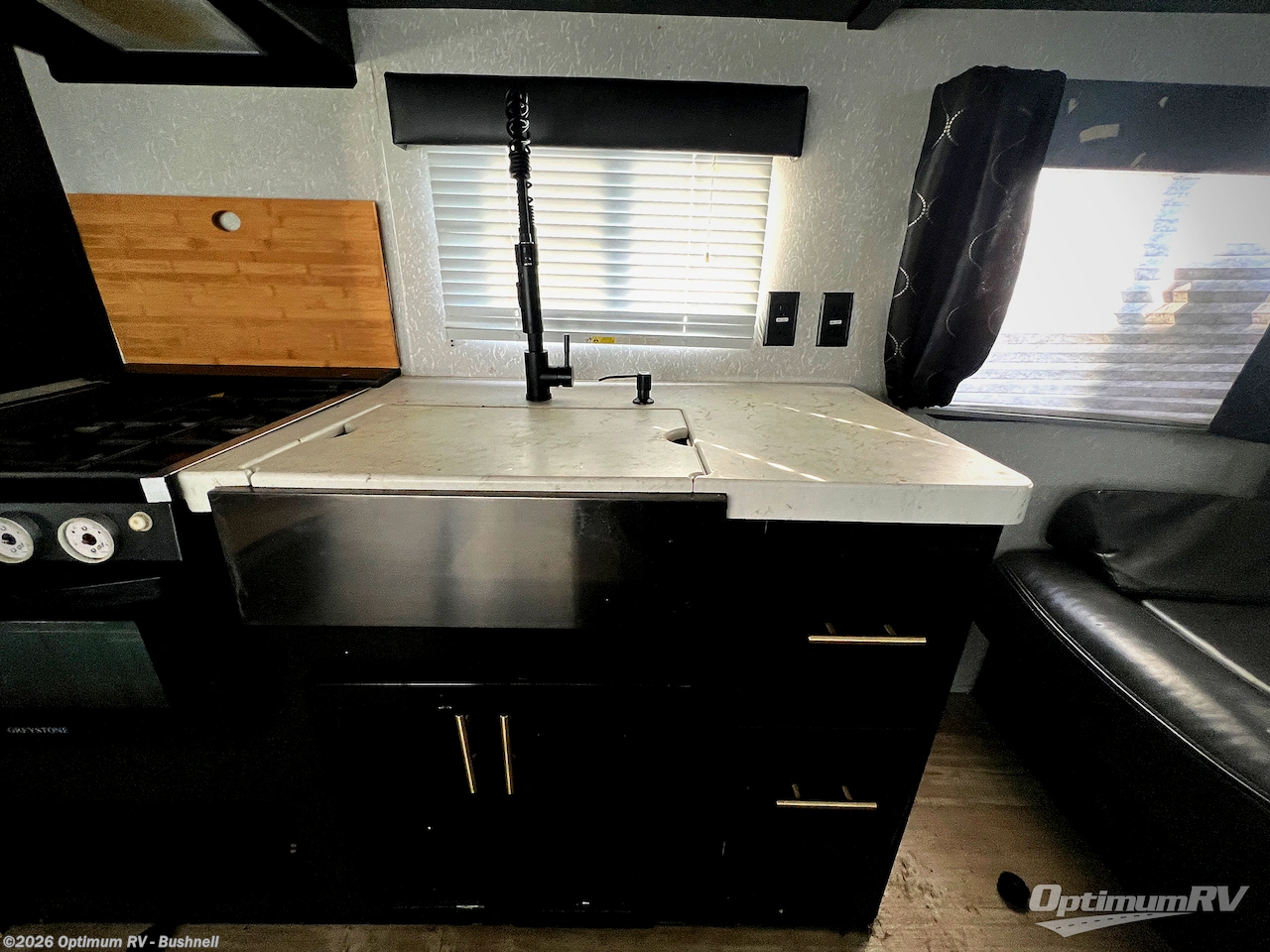 Enjoy cooking for nine in this Cherokee Grey Wolf travel trailer. With a three-burner cooktop, an overhead microwave, and an oven, you can easily cook just like home. The residential farm-style stainless steel sink makes cleaning your larger pots and pans quite simple, and the large overhead cabinets make storage an easy task as well. There is plenty of seating for the whole gang with the sofa and the booth dinette to play a game or two after you have enjoyed your delicious meal. Your kiddos are sure to love having their own set of double-size bunks conveniently located next to the rear bath, and you will love having your own front semi-private bedroom when you close the privacy curtain. You can also create some outdoor living space beneath the 15' power awning so that you can enjoy the great outdoors whether rain or shine!