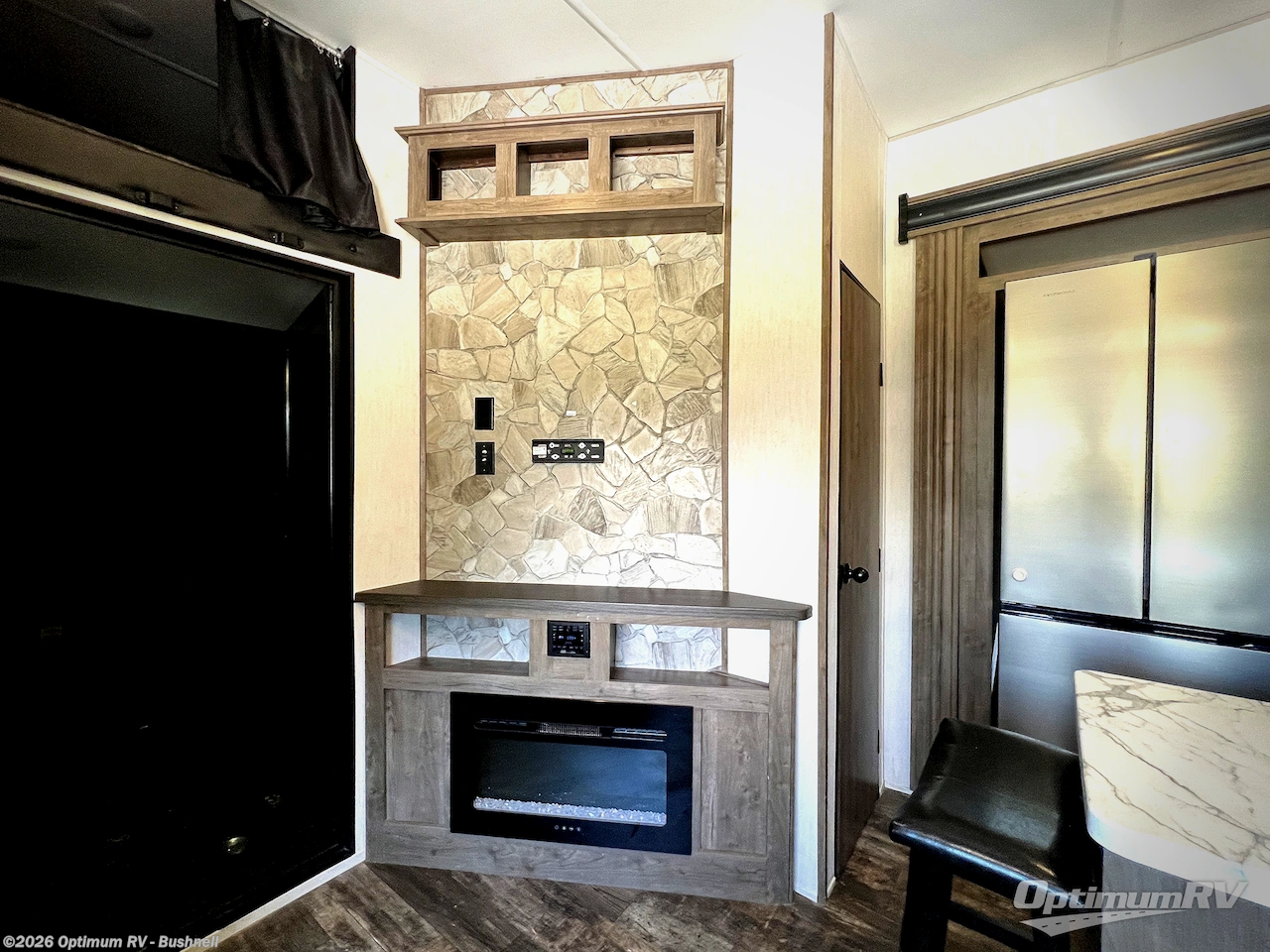 There's a comfortable sleeping spot for everyone in this toy hauler! Starting with the 67" x 74" Wolf Pack king bed in the front private bedroom which also has a wardrobe with a nightstand slide and an entrance into the dual entry bathroom. The 14' garage area has a folding dinette table below a Happijac bed lift system, a half bathroom, an area prepped to add an optional washer and dryer, and a loft above it all. You could even transform the party recliner sofa into an extra sleeping space when you aren't watching a movie or enjoying the fireplace at the entertainment center. The bar top island with stools is the perfect place to enjoy your morning coffee while reading the newspaper. A few exterior features you will enjoy include a 96" x 96" ramp door "party patio", a reverse activated light and backup camera, a front storage/generator prep area, dual entry doors, and two power awnings to protect you rain or shine!