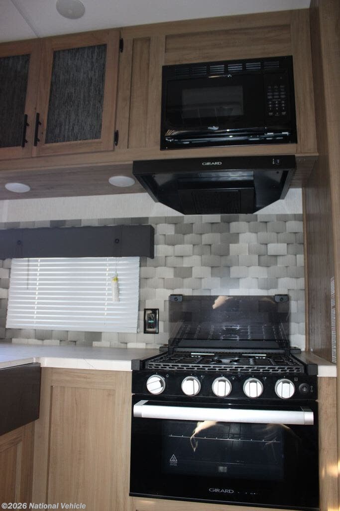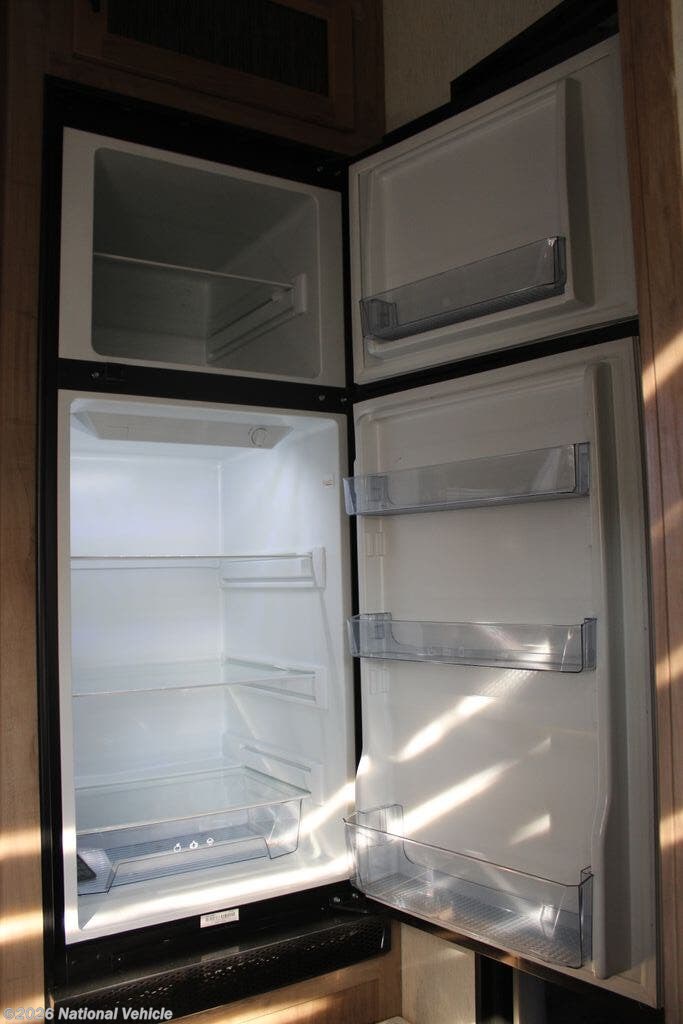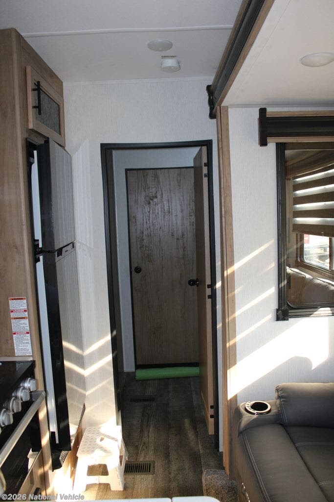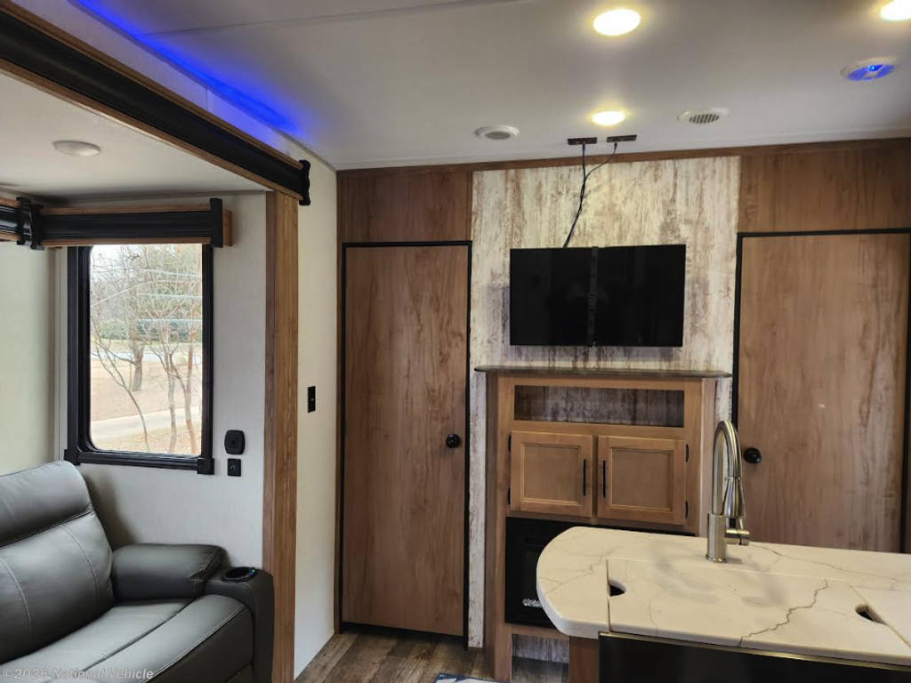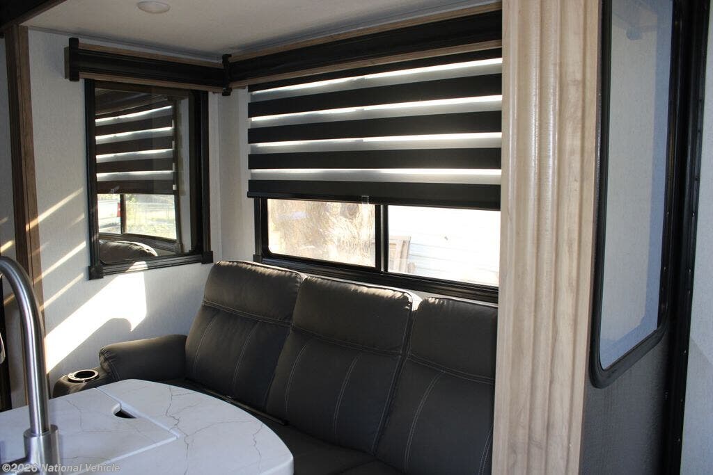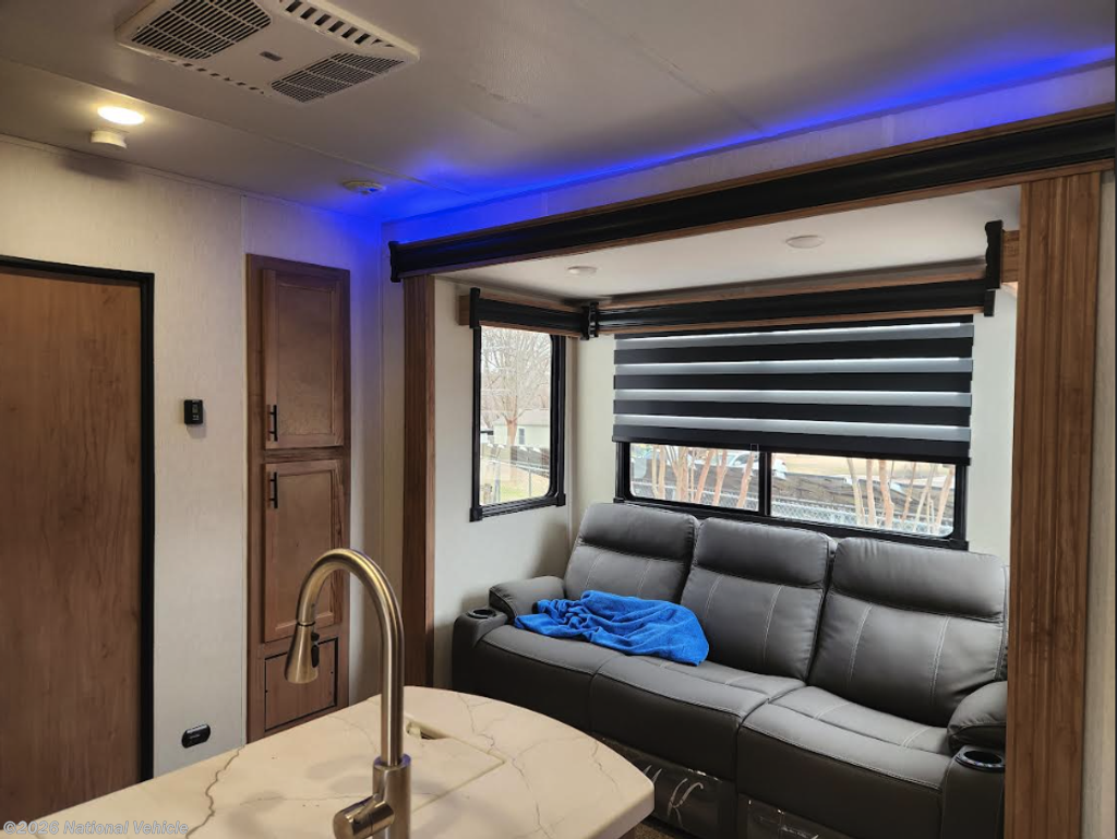 The main living area features a modern kitchen with solid-surface countertops, large sink, microwave, oven, refrigerator, and abundant storage. A slide-out opens up the living space, where you?ll find a comfortable sofa and entertainment center ideal for relaxing after a day of riding or exploring.