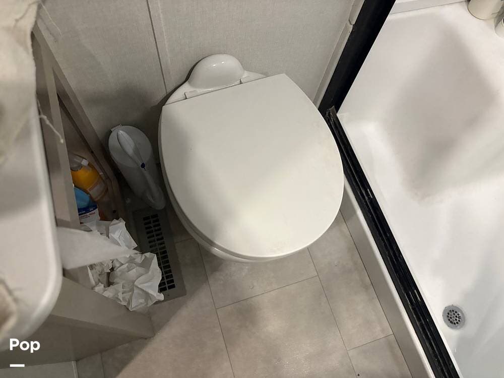 The bathroom features a spacious shower with a seat, a skylight, and elegant finishes, creating a spa-like atmosphere on the road.