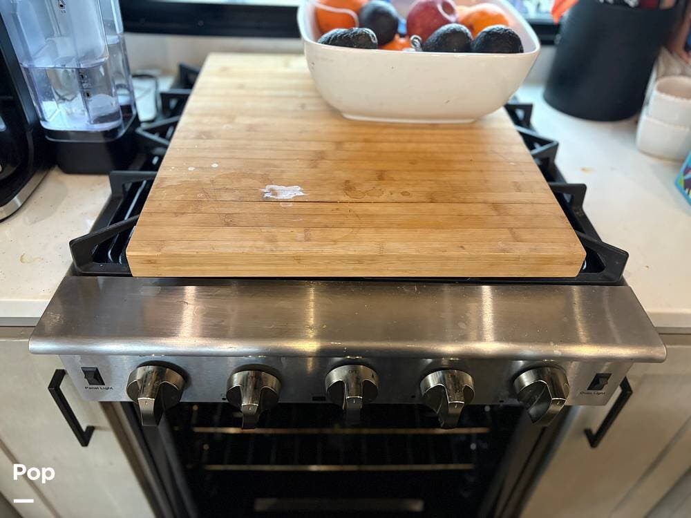 The gourmet kitchen is a dream for any chef, featuring solid-surface countertops, a full-size refrigerator, a stainless steel oven, and ample storage space.