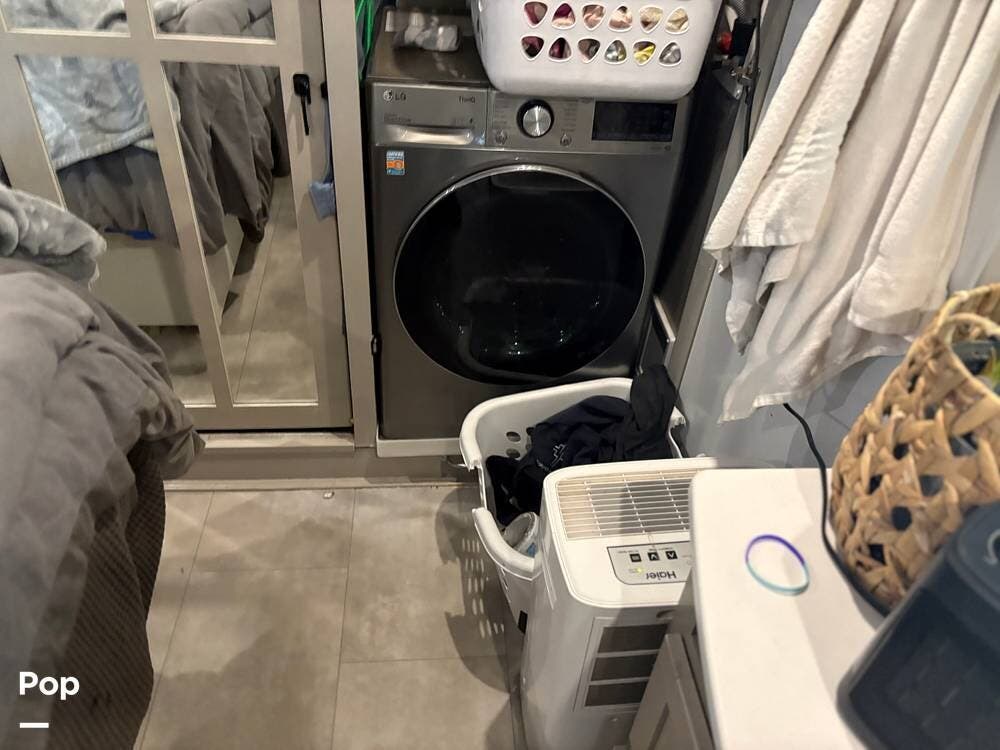 The private master bedroom boasts a king-size bed, a large wardrobe, and a washer/dryer combo unit for added convenience.
