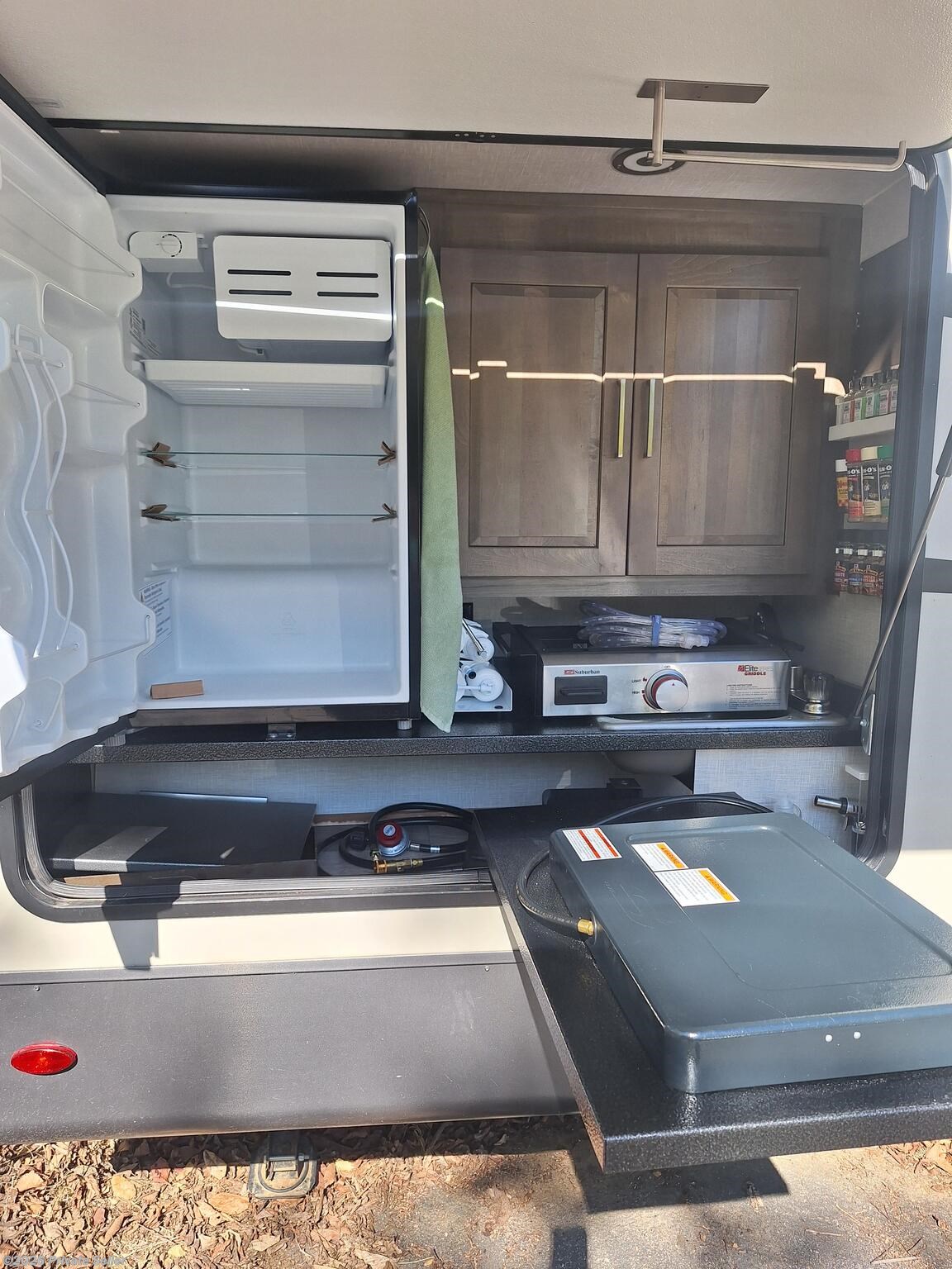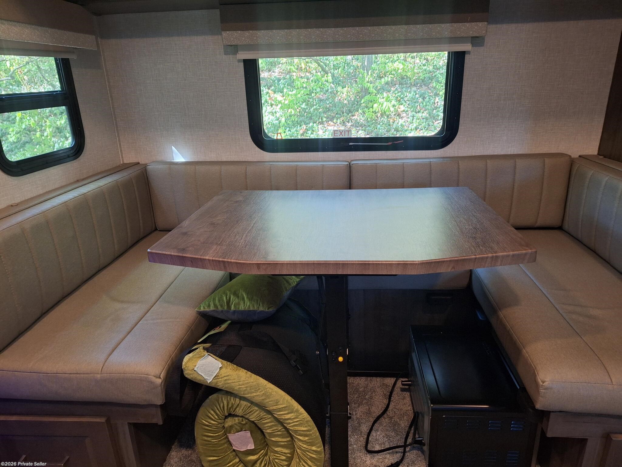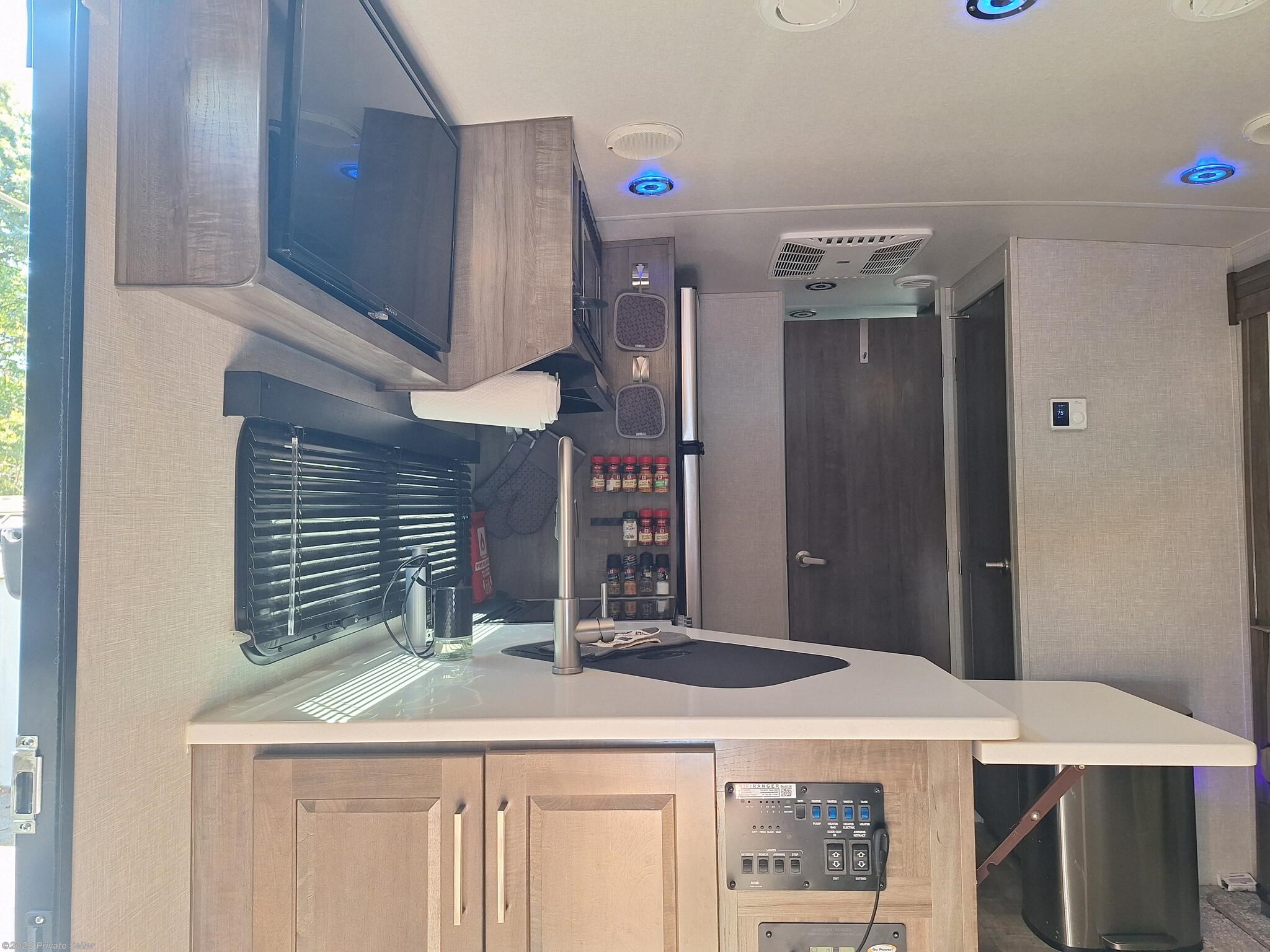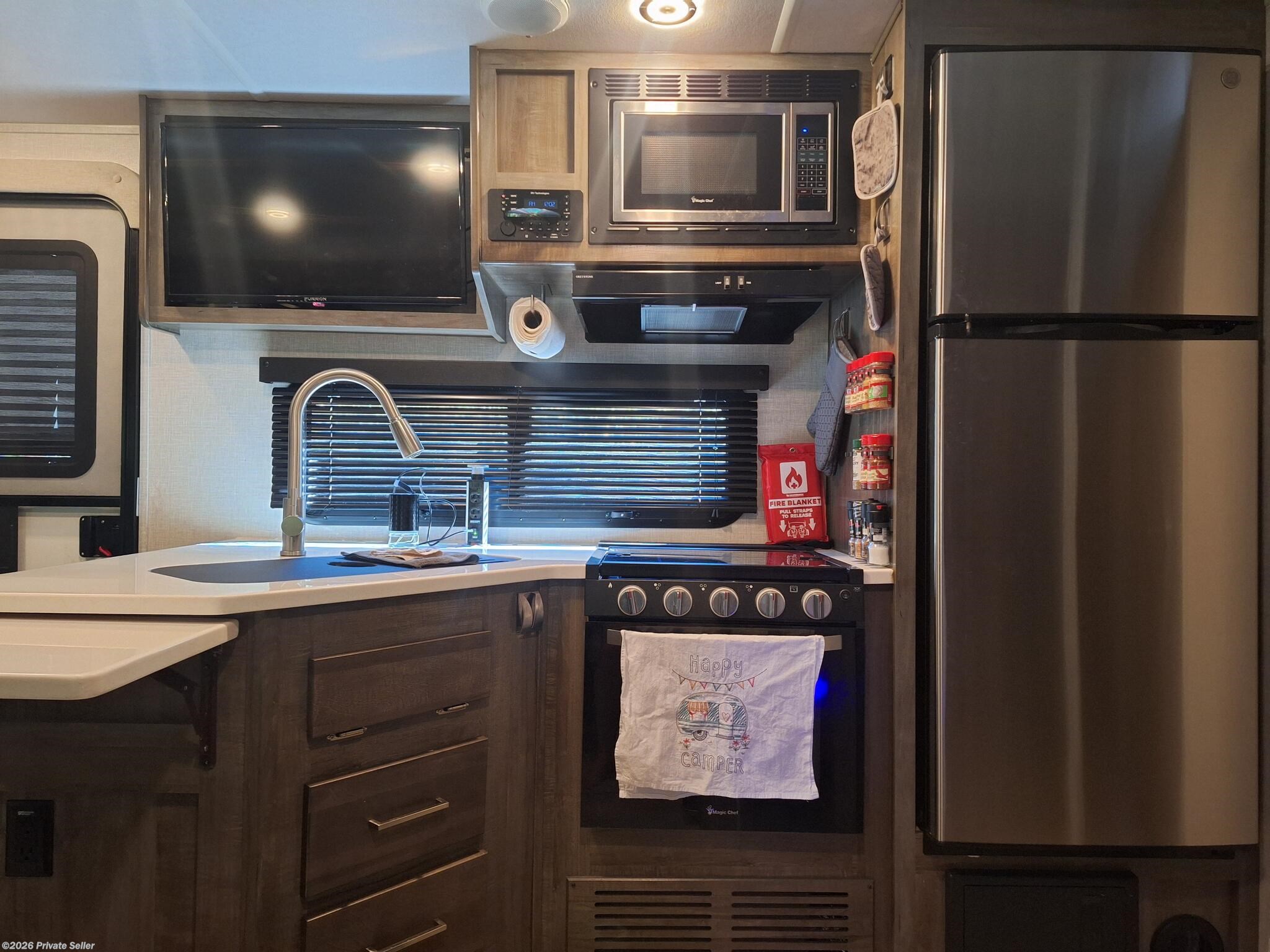 Has only been on 5 trips within 2 hours of home. Sleeps 4. Partially equipped with items such as kitchen supplies, ninja blender, toaster, fryer, Blu-ray player, etc. Some modifications done such as digital thermostat, reverse osmosis water system, backup camera with 12” monitor, dimmable soft touch lights, propane tank monitor, and Kicker speakers. All other equipment is typical for this model plus options: power stabilizer jacks, larger refrigerator, solar panel, larger air conditioner, sun black out shades with valances. 2 each 30lb propane tanks, tire monitor, outdoor kitchen with stove and griddle.