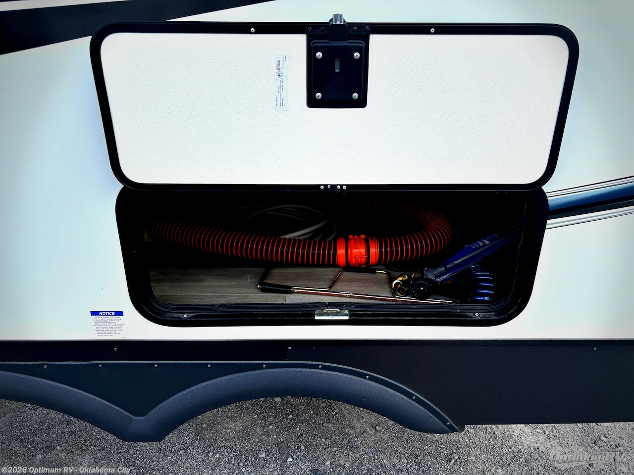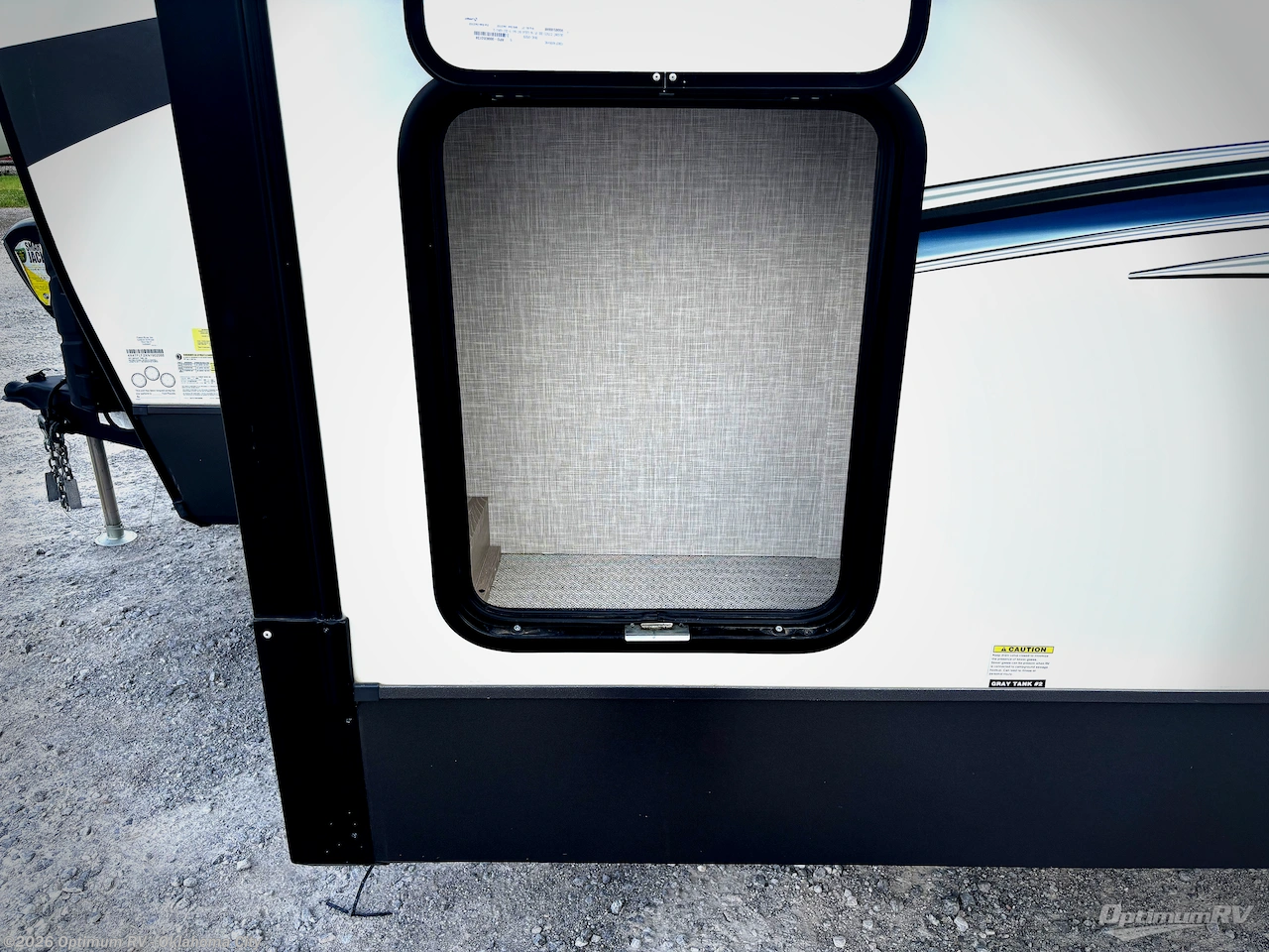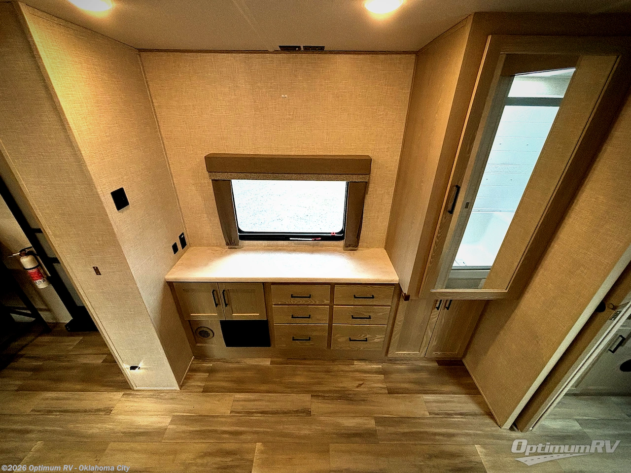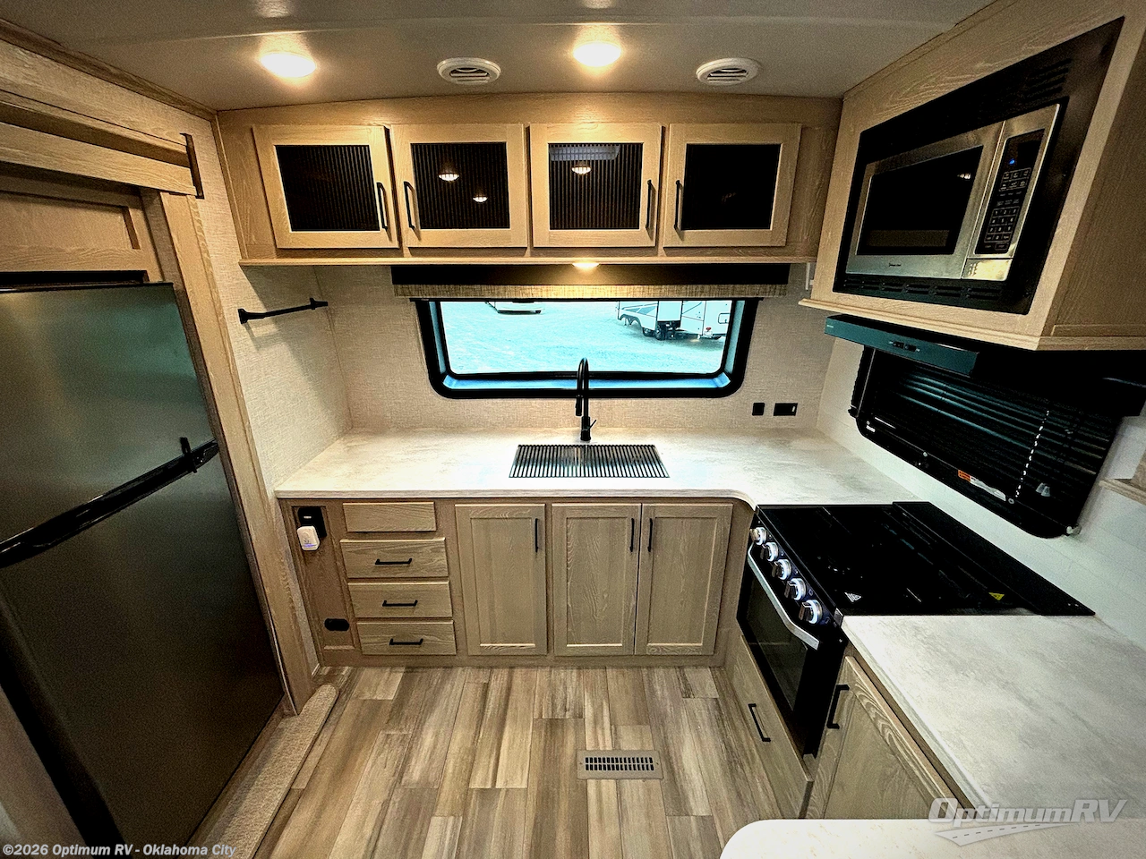 You will love how open this travel trailer will feel with the large front window that you can look out from the two-person bar top seating! The front kitchen has plenty of countertop space for you to prepare your best meals. Your nights will be spent in true relaxation with the 67" theater seating and king bed slide to lay your head. The full rear bathroom has a shower with a seat to take a nice, hot shower before bed and a dual-sink vanity for two to get ready at once in the mornings!