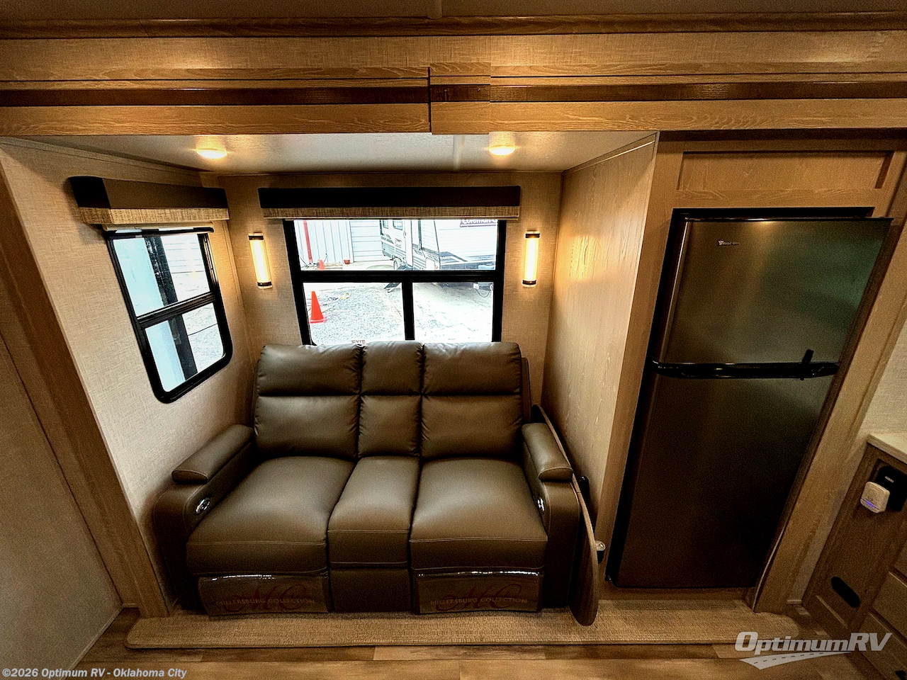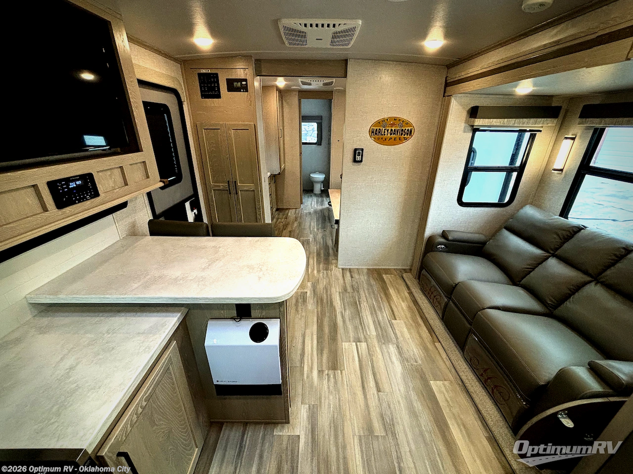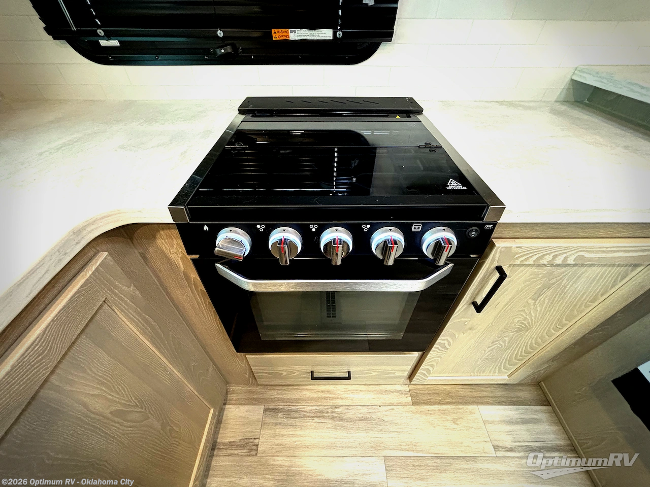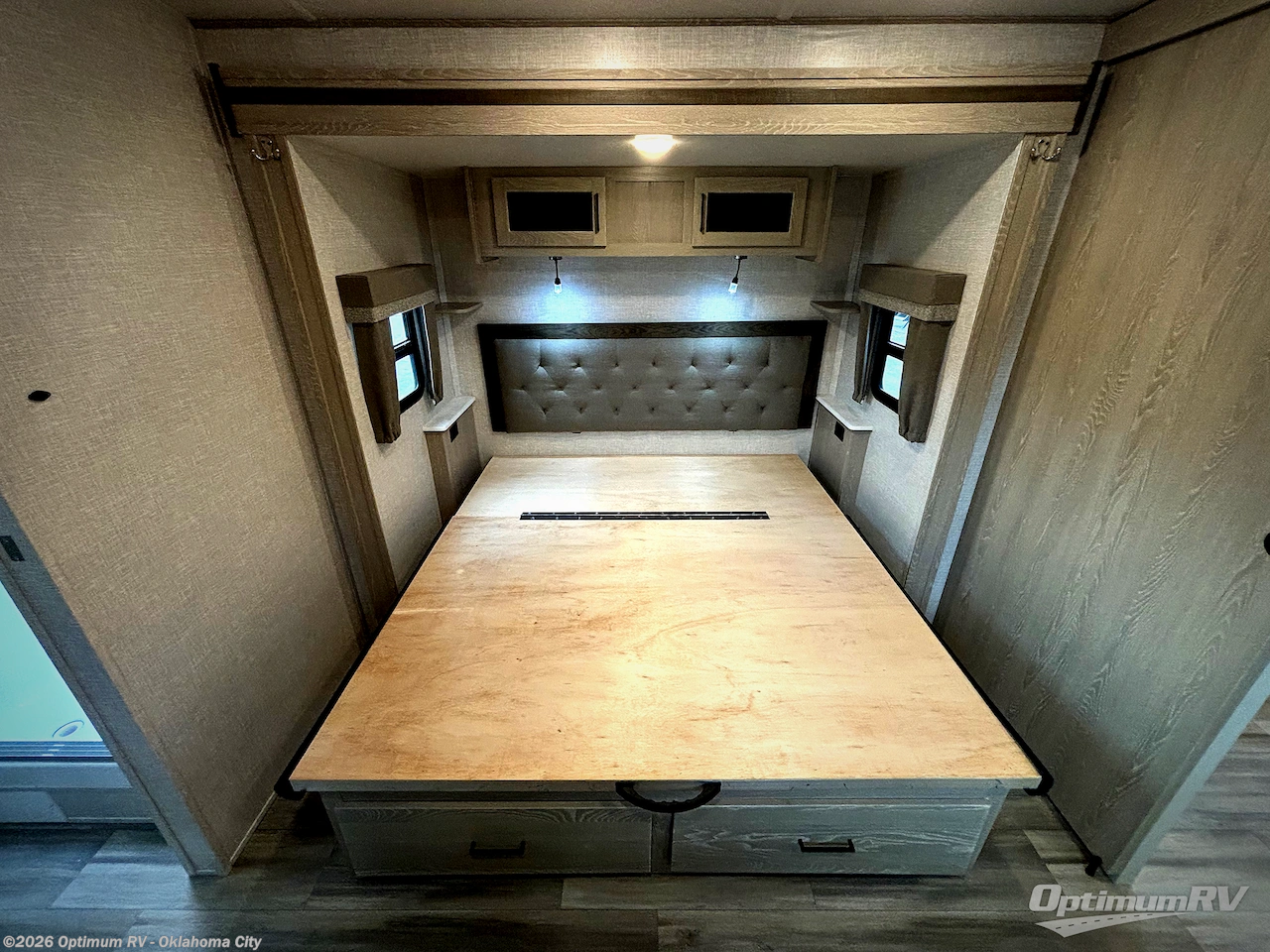 You will love how open this travel trailer will feel with the large front window that you can look out from the two-person bar top seating! The front kitchen has plenty of countertop space for you to prepare your best meals. Your nights will be spent in true relaxation with the 67" theater seating and king bed slide to lay your head. The full rear bathroom has a shower with a seat to take a nice, hot shower before bed and a dual-sink vanity for two to get ready at once in the mornings!