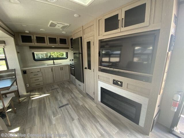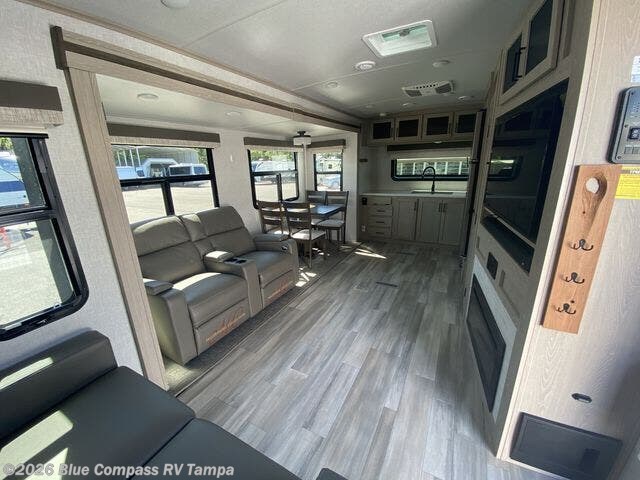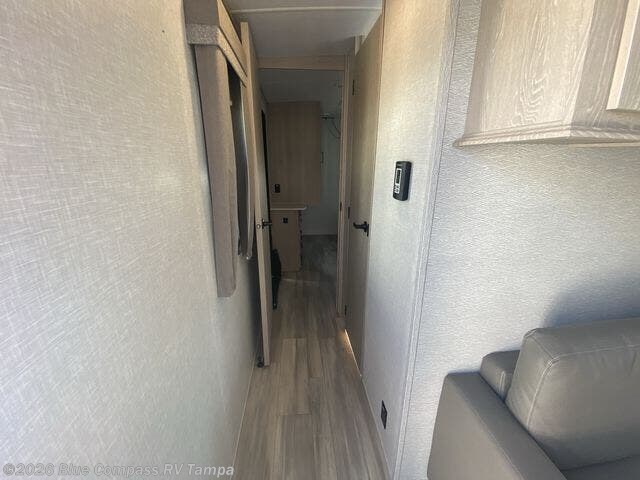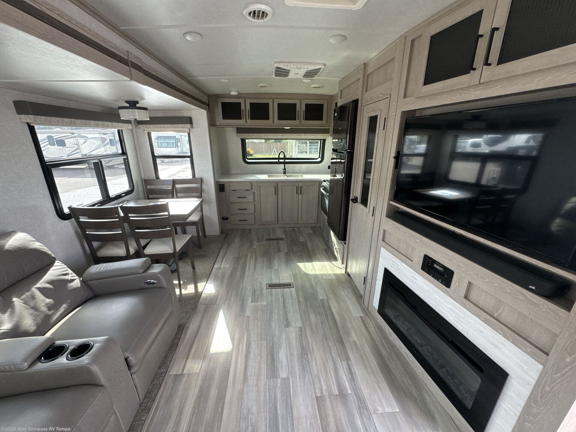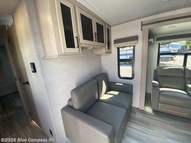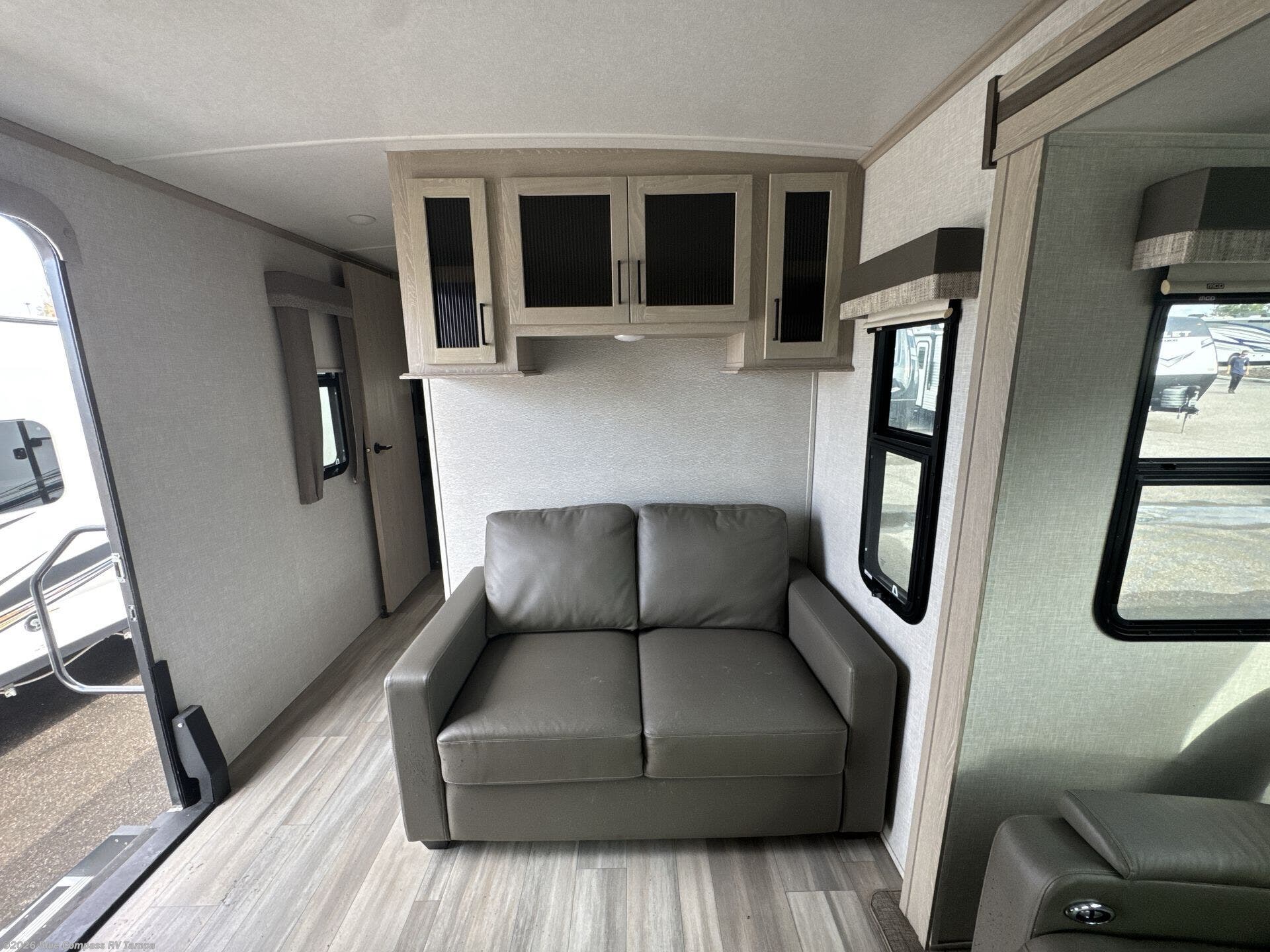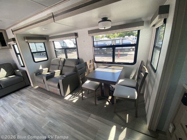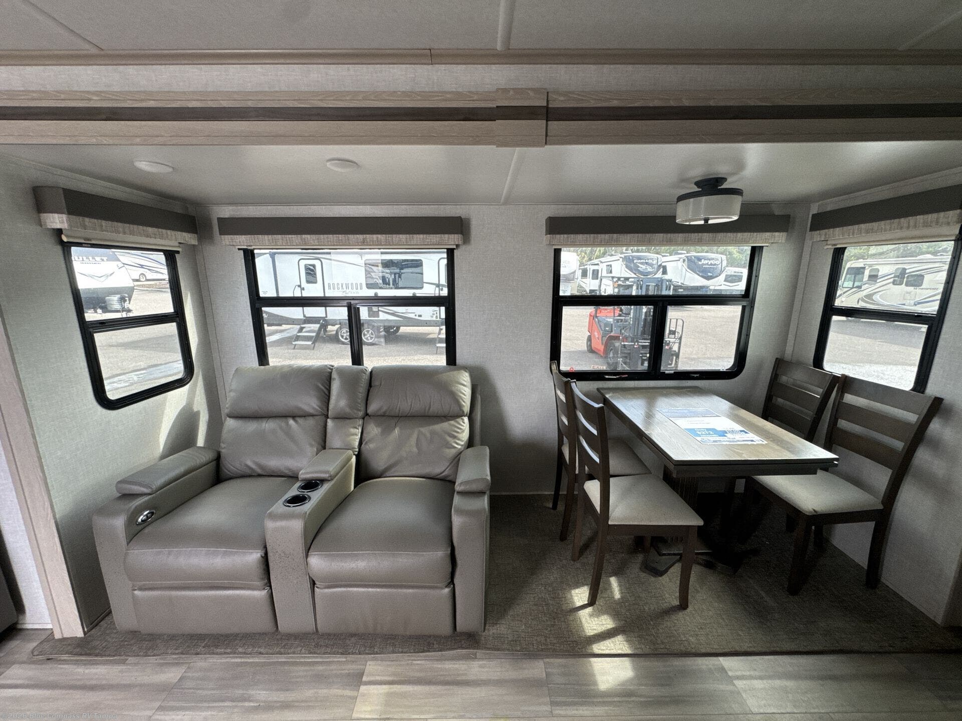Dual entry doors make life go a little smoother in this travel trailer! The rear private bedroom has a king bed slide for more walking space, a wardrobe that is even prepped to add an optional washer and dryer, an area for an optional TV, and an entrance into the dual-entry bathroom. The 60" theater seating is the perfect spot for movie night, and the 60" hide-a-bed sofa allows a guest or two to tag along. You can even transform the 44" booth dinette into a sleeping space for another guest too. The front kitchen has plenty of countertop space for the chef to prepare their best meals, and you can enjoy them outside protected underneath the 21' power awning!