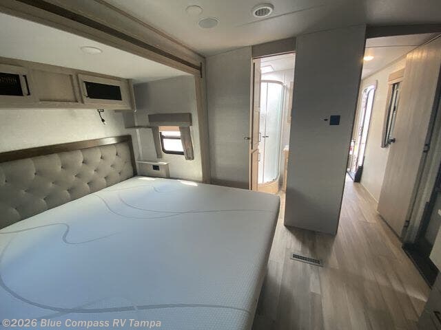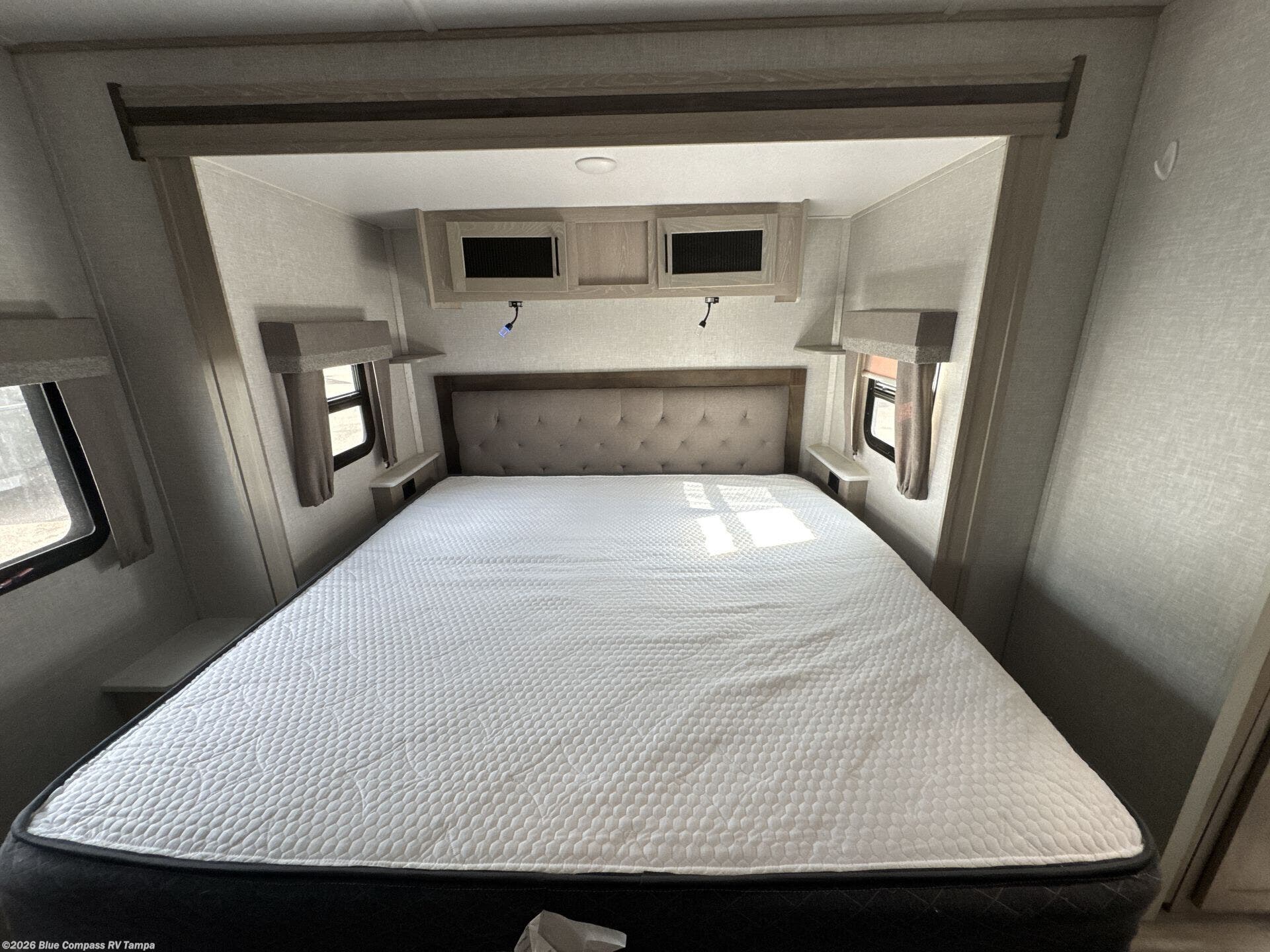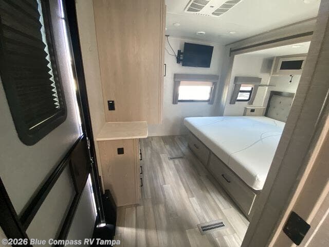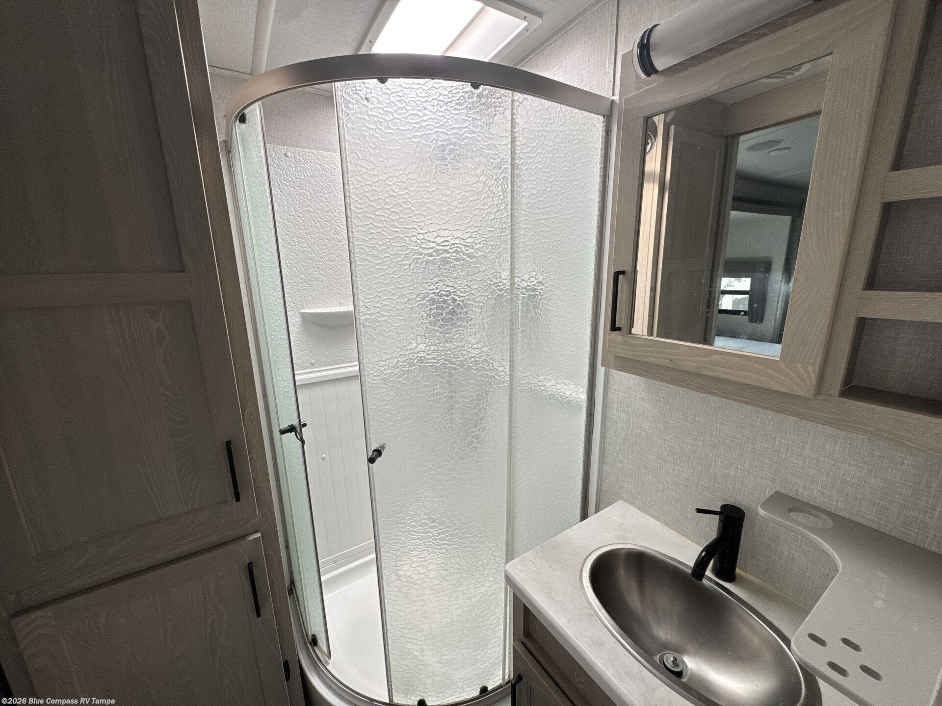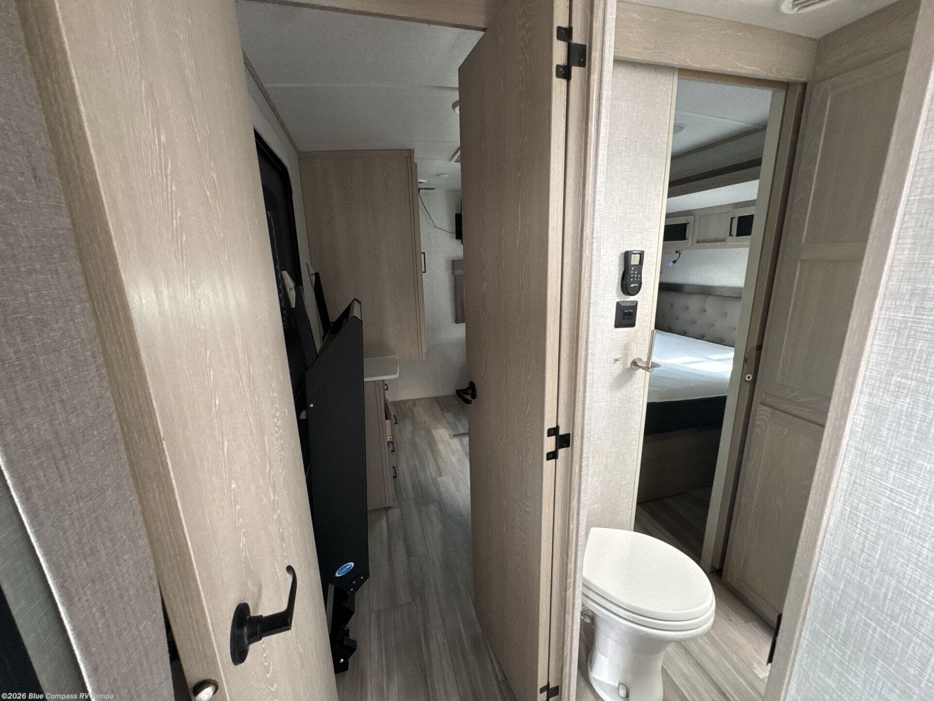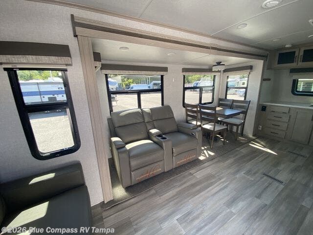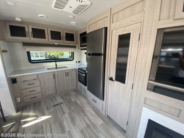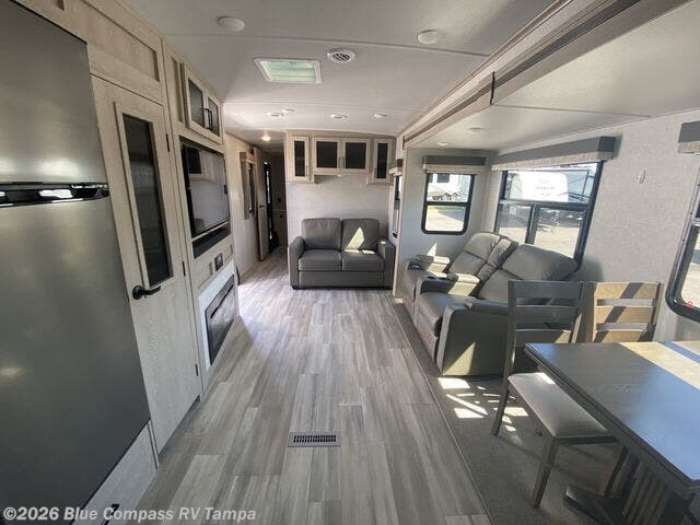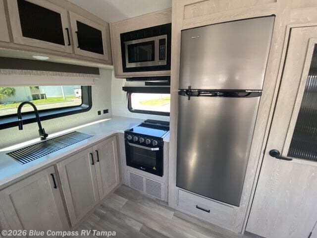 Dual entry doors make life go a little smoother in this travel trailer! The rear private bedroom has a king bed slide for more walking space, a wardrobe that is even prepped to add an optional washer and dryer, an area for an optional TV, and an entrance into the dual-entry bathroom. The 60" theater seating is the perfect spot for movie night, and the 60" hide-a-bed sofa allows a guest or two to tag along. You can even transform the 44" booth dinette into a sleeping space for another guest too. The front kitchen has plenty of countertop space for the chef to prepare their best meals, and you can enjoy them outside protected underneath the 21' power awning!