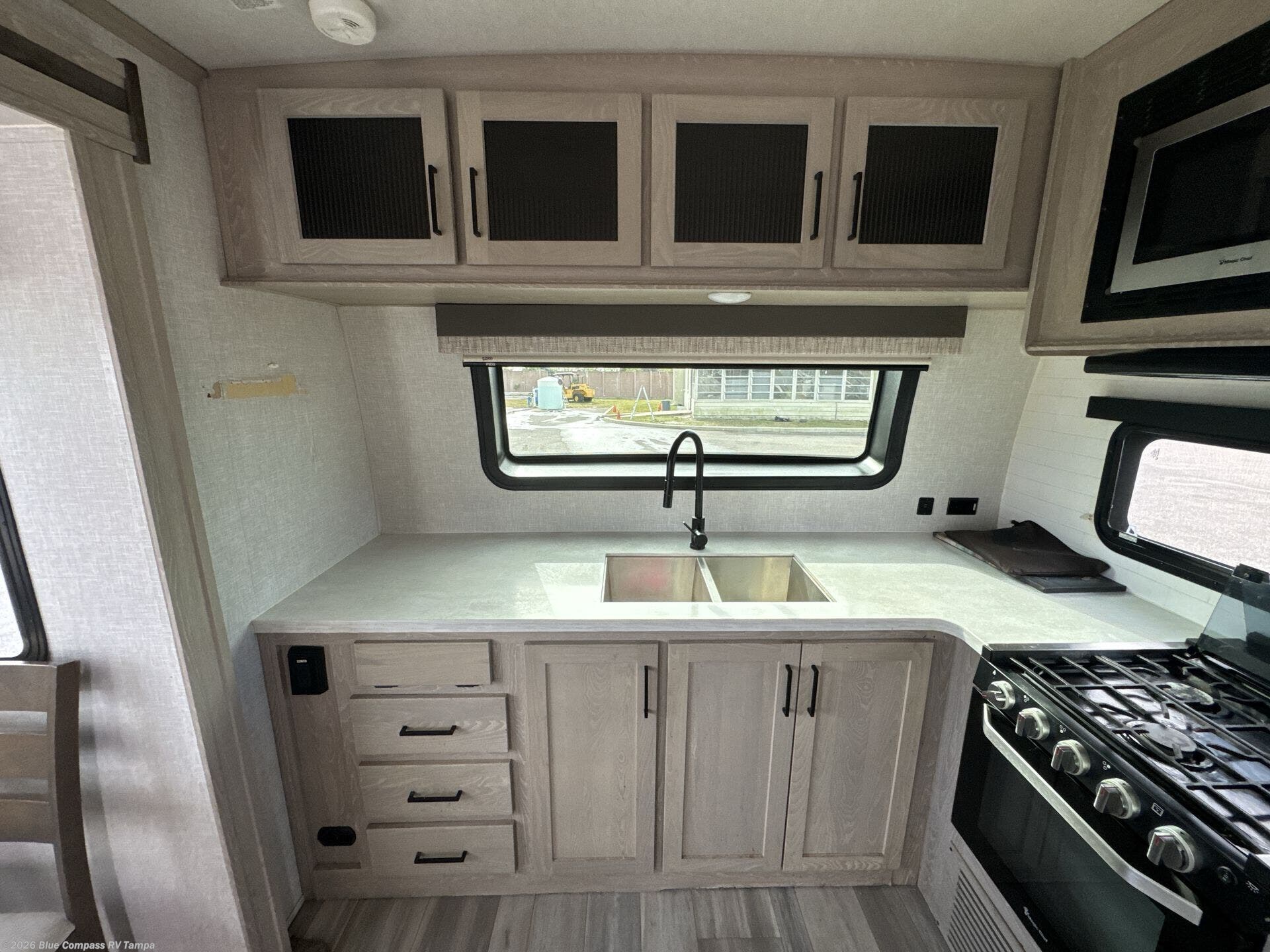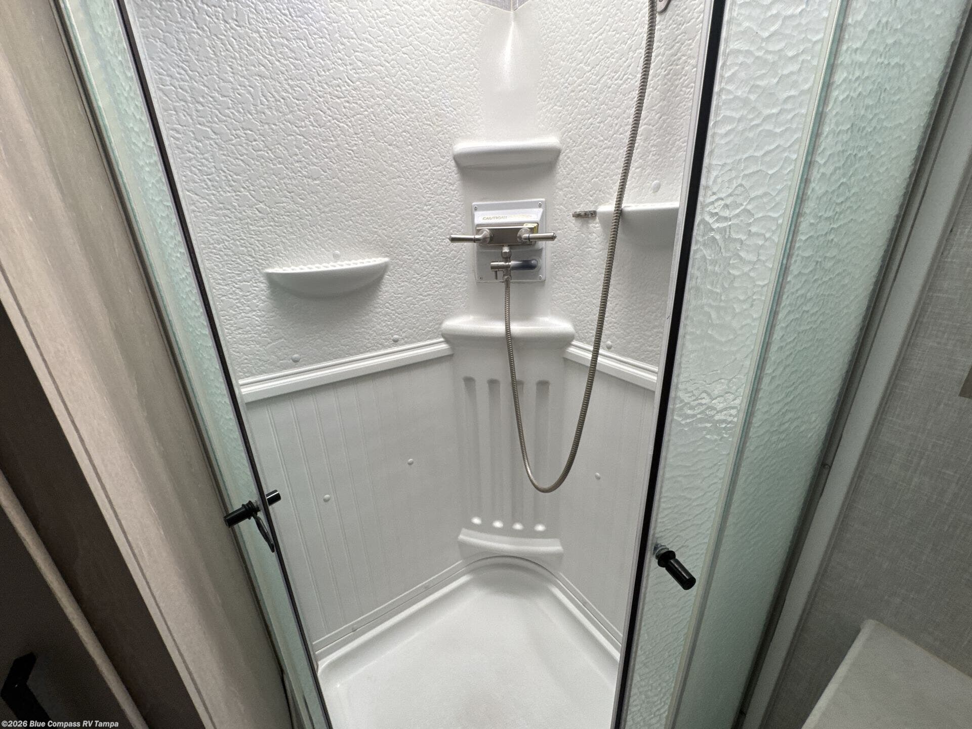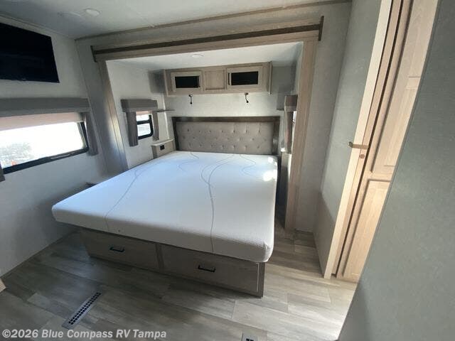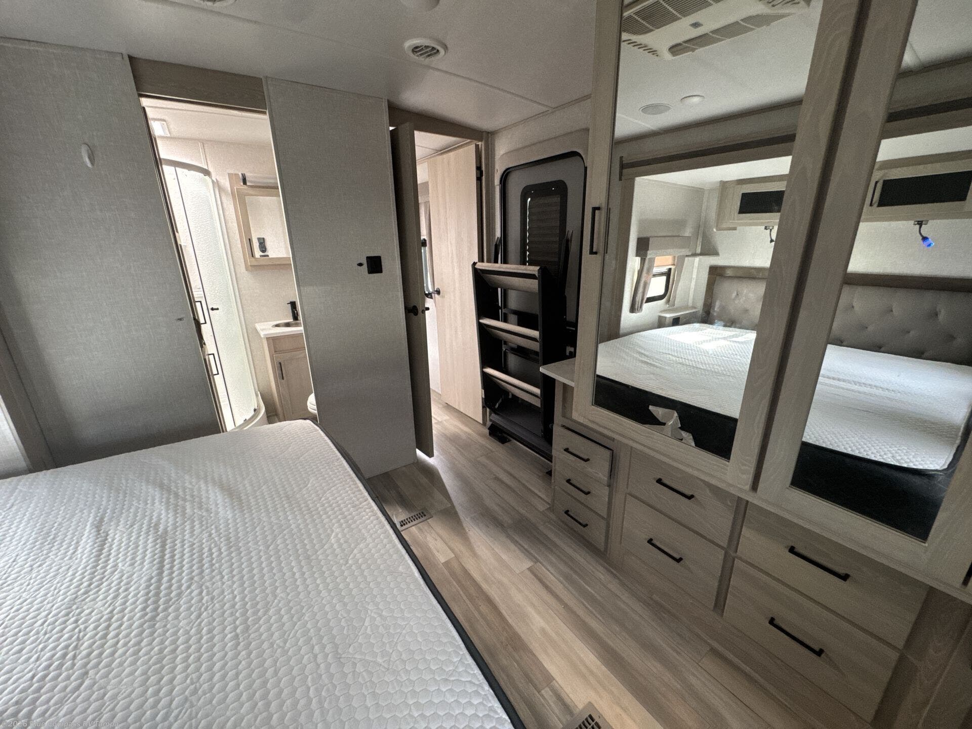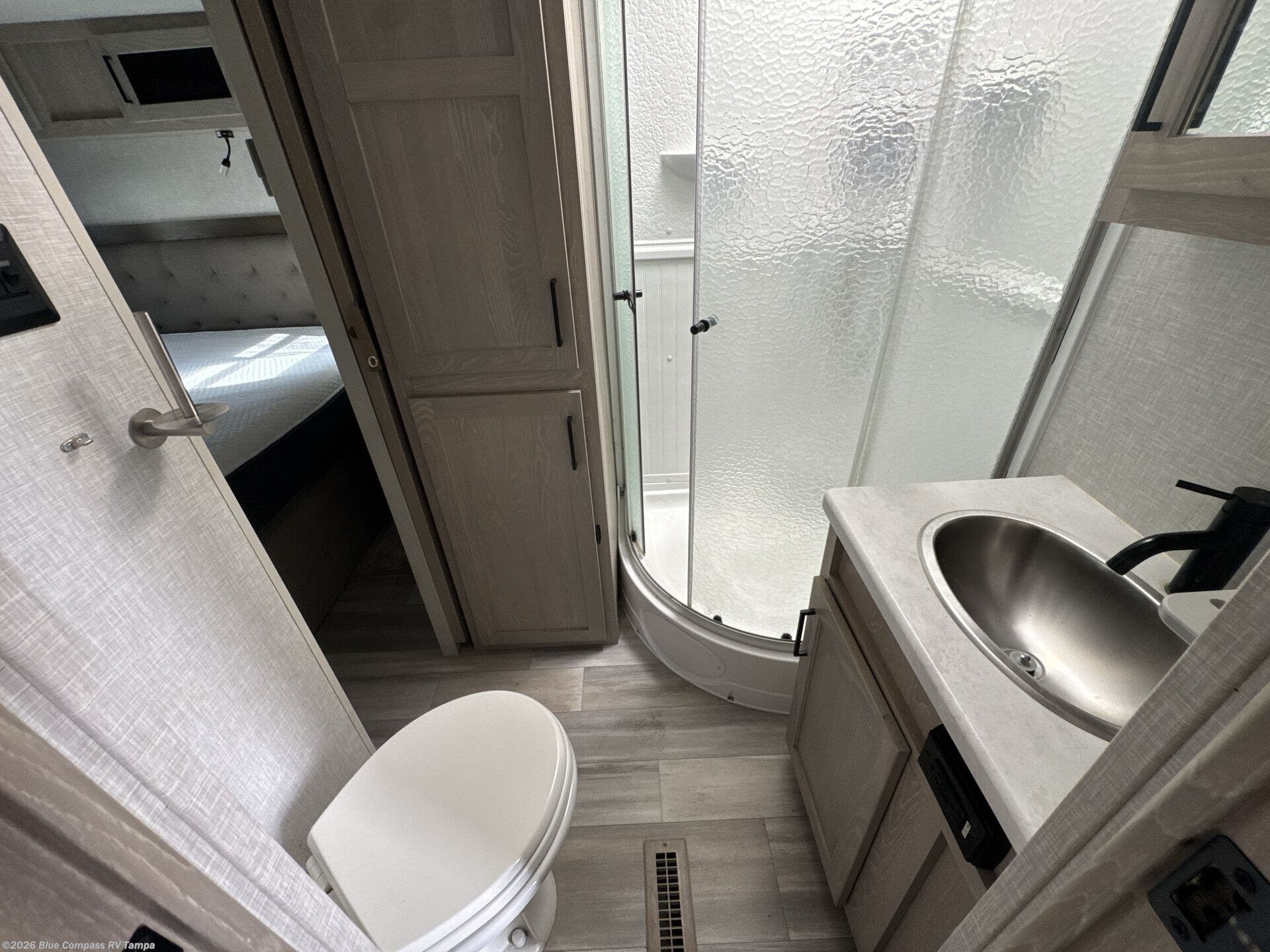 Dual entry doors make life go a little smoother in this travel trailer! The rear private bedroom has a king bed slide for more walking space, a wardrobe that is even prepped to add an optional washer and dryer, an area for an optional TV, and an entrance into the dual-entry bathroom. The 60" theater seating is the perfect spot for movie night, and the 60" hide-a-bed sofa allows a guest or two to tag along. You can even transform the 44" booth dinette into a sleeping space for another guest too. The front kitchen has plenty of countertop space for the chef to prepare their best meals, and you can enjoy them outside protected underneath the 21' power awning!