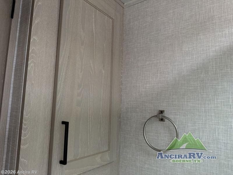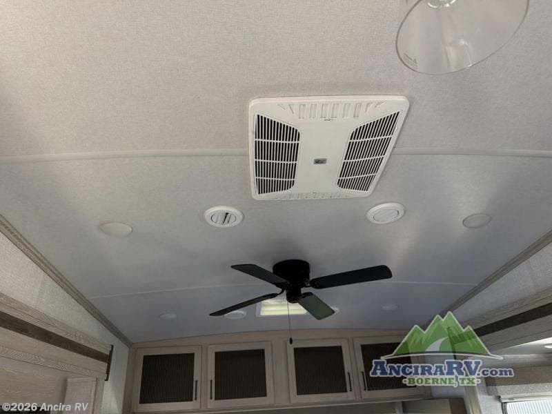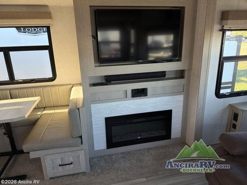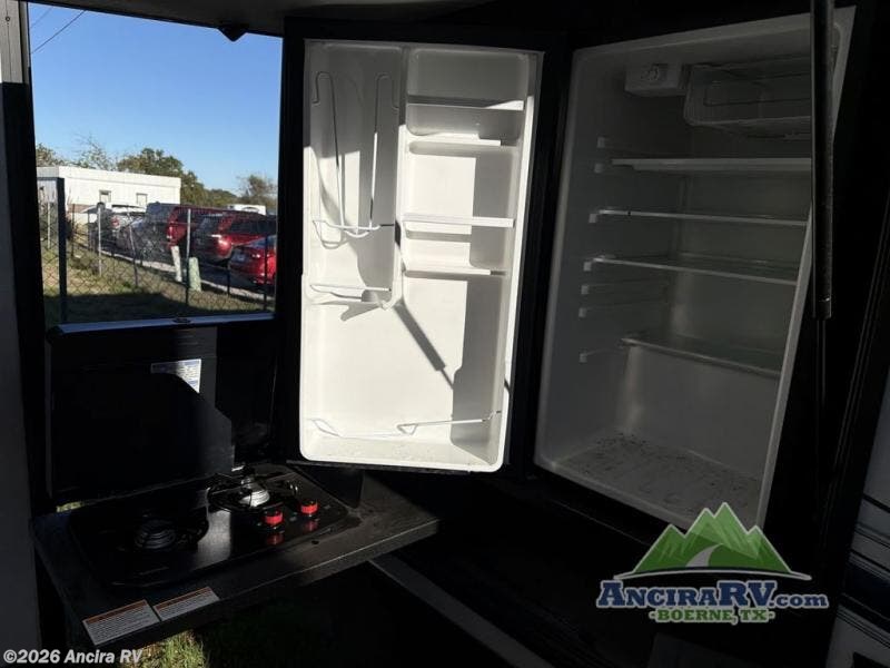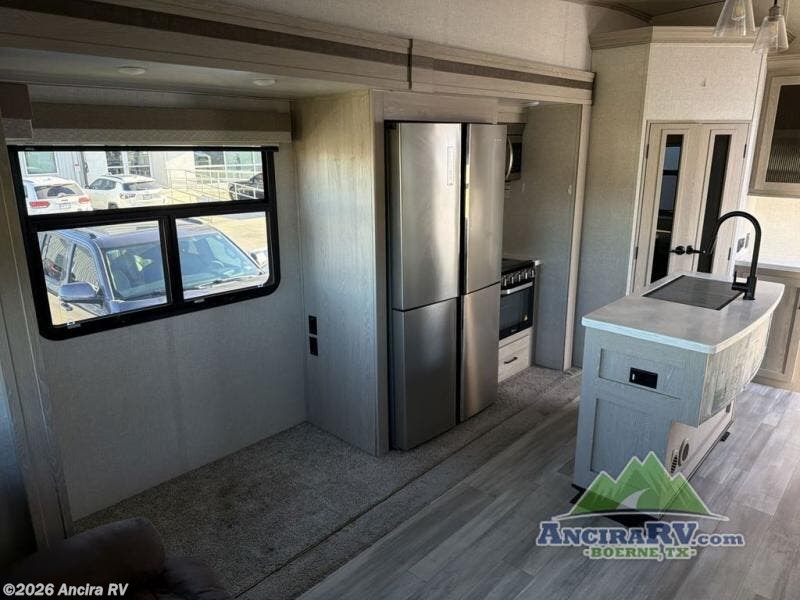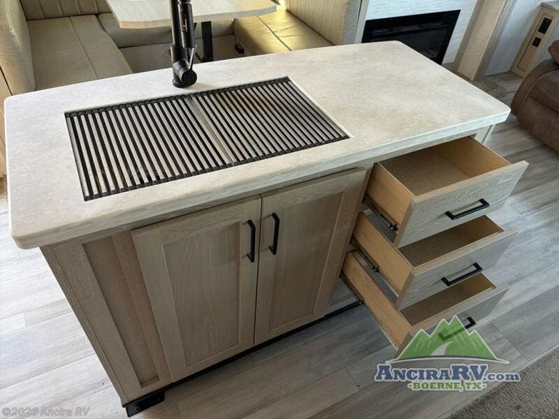Meal prepping is made easy in this fifth wheel with a kitchen island! You can even prepare dinner outdoors at the outside kitchen with a refrigerator to keep your beverages cold while you cook. The 44" King U-shaped dinette is big enough for everyone to gather around for game night, or some can choose to relax on either the rear 76" hide-a-bed sofa or 60" theater seating across from the entertainment center with a fireplace. The full bathroom has a shower with a seat to rinse the sand out of your hair and a linen closet close by to store your towels. Inside the front private bedroom is a king bed slide across from a dresser with the option to add a TV, as well as a front wardrobe with a shirt closet and an area to add an optional washer and dryer!