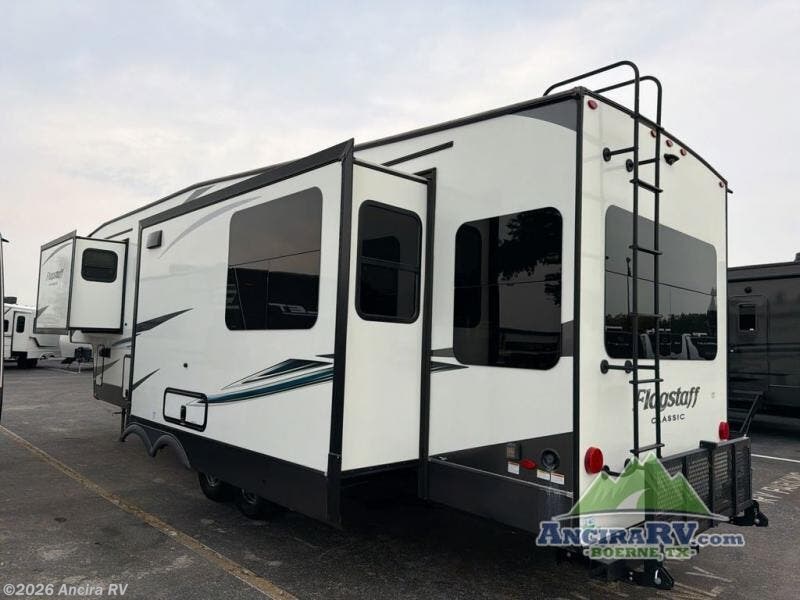 Each one of these Forest River Flagstaff Classic fifth wheels or travel trailers will be your home on wheels! Their quality craftsmanship and attention to detail shines through the surface-coated steel I-beam frame on fifth wheels, the enclosed underbelly, the radius roof with vaulted interior ceilings, and six-sided fully aluminum-framed floor, walls, and roof. Towing your unit will be easy with the torsion axle, Rubber-Ryde suspension, power tongue jack, and nitrogen-filled Goodyear Endurance tires. You will even reduce your use of water with the Showermiser water saving system in the bathroom. A few other convenient features you will enjoy include a control panel with WeRV app control, an upgraded backlit headboard, and an outside shower with hot and cold water. Come choose your favorite one today!