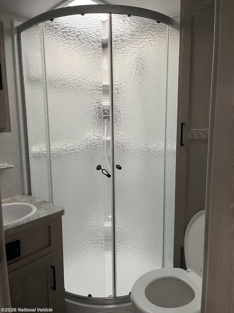 The kitchen is fully equipped with a 3-burner cooktop with oven, microwave, deep sink, and large refrigerator, making meal prep easy wherever you travel. In the rear, the spacious full bathroom includes a shower, vanity, toilet, and linen storage.