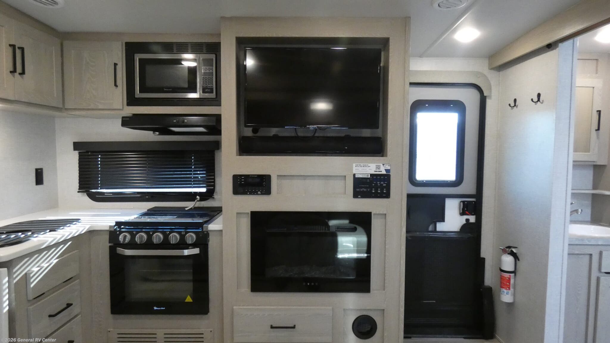 Forest River Flagstaff Micro Lite travel trailer 25FBLS highlights: Rear Bath Private Bedroom Entertainment Center Entryway Closet/Pantry Fireplace Exterior Griddle For the couple who enjoys a weekend camping trip, come choose this Flagstaff Micro Lite travel trailer. This unit features a slide that holds the theater seats with cupholders for your favorite beverage. You'll love relaxing on these in the evening while you enjoy your entertainment center with an LED TV. The private front bedroom includes an RV queen bed and a wardrobe slide. You'll love the cute kitchen with a countertop extension for meal prep and a large pantry to hold your favorite snacks. This trailer also features a drop-frame pass-through storage for your large camping items. Each Flagstaff Micro Lite travel trailer by Forest River features laminated fiberglass sidewalls, sleek tinted frameless windows, and Azdel composite panels for added strength and support. You can easily tow these travel trailers with an SUV since they are so lightweight, and there is a power tongue jack for quick and easy set up. Some of the convenient amenities you will enjoy are the Teton All-In-One WiFi booster/LTE prep and antenna, the double battery boxes, Key-Alike locks, plus a Maxxair fan with a cover to keep the fresh air moving in your RV. You will love the modern look of the Newport Ash or Autumn Wood cabinetry, plus there are solid wood cabinet doors, solid surface kitchen countertops, and a Showermiser water saving system in the bathroom. Choose a Flagstaff Micro Lite travel trailer and you won't be disappointed!