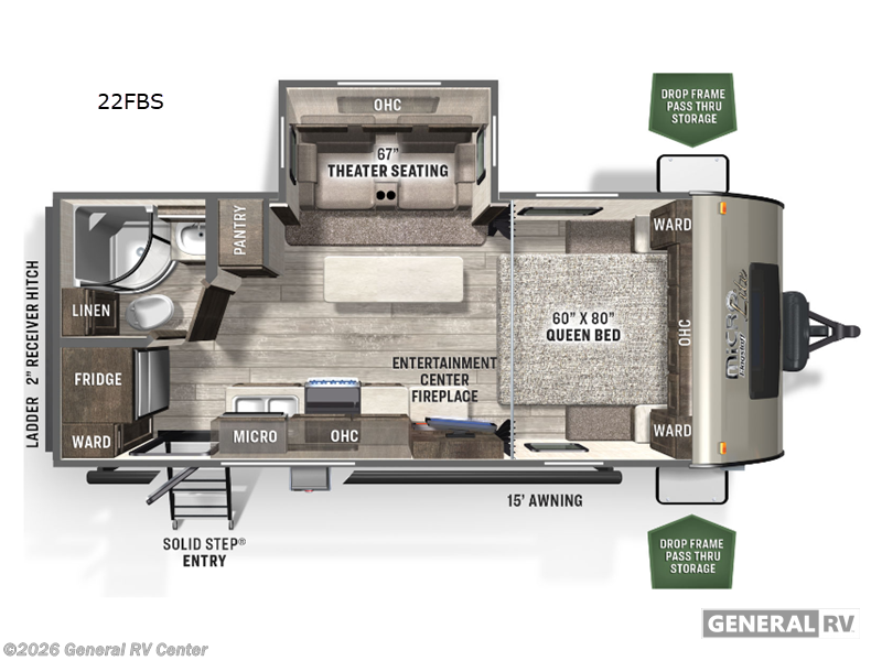 Forest River Flagstaff Micro Lite travel trailer 22FBS highlights: 67" Theater Seat Queen-Size Bed Pass-Through Storage Fireplace Entryway Closet Make your vacations everything you've always wanted them to be with this Flagstaff Micro Lite travel trailer! A full bathroom with a radius shower, linen closet, and skylight will allow you to stay clean without having to find a public rest stop. There is also a three-burner range, a gas oven, and a 12 volt refrigerator will allow you to eat more than just fast food while you are away from home. You can even sleep just as comfortably as you do at home because the queen-size bed up front will provide peaceful dreams each and every night. Each Flagstaff Micro Lite travel trailer by Forest River features laminated fiberglass sidewalls, sleek tinted frameless windows, and Azdel composite panels for added strength and support. You can easily tow these travel trailers with an SUV since they are so lightweight, and there is a power tongue jack for quick and easy set up. Some of the convenient amenities you will enjoy are the Teton All-In-One WiFi booster/LTE prep and antenna, the double battery boxes, Key-Alike locks, plus a Maxxair fan with a cover to keep the fresh air moving in your RV. You will love the modern look of the Newport Ash or Autumn Wood cabinetry, plus there are solid wood cabinet doors, solid surface kitchen countertops, and a Showermiser water saving system in the bathroom. Choose a Flagstaff Micro Lite travel trailer and you won't be disappointed!