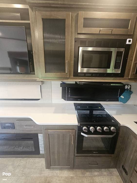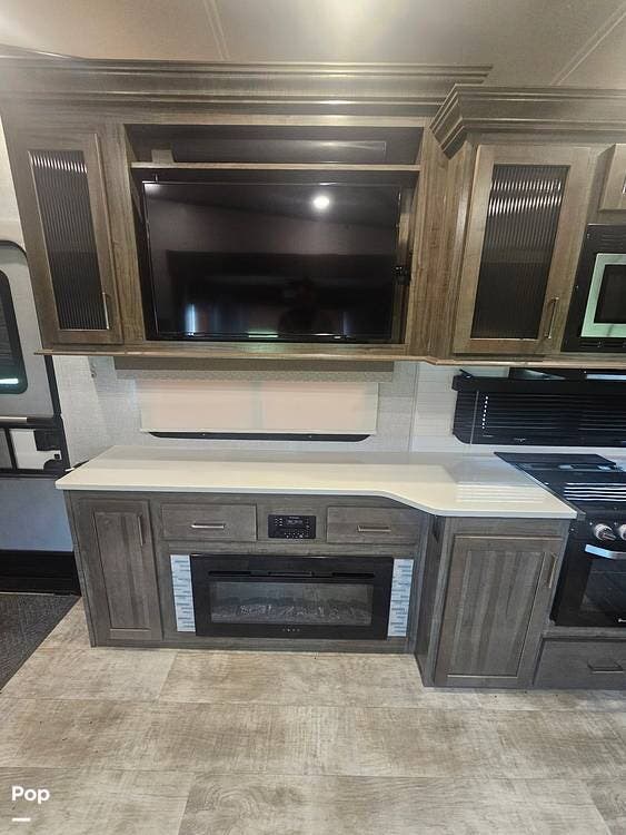 The floor plan is open and spacious with a large living area and rear kitchen area. The large entertainment center features a large flat-screen TV over the stereo and electric fireplace, which can be used for heating or just for ambiance.