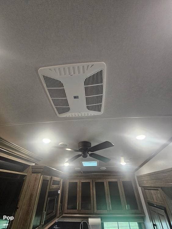 The high ceilings and ceiling fan help circulate the air, and the unit is equipped with two roof-mounted AC units that keep it cool on the warmest days, a propane-fueled furnace that keeps it warm on cold winter nights, and an electric fireplace, too!