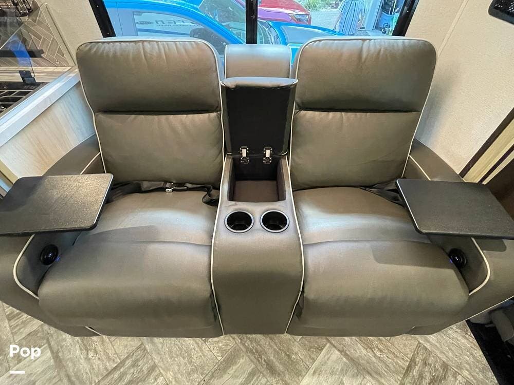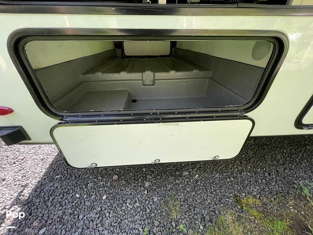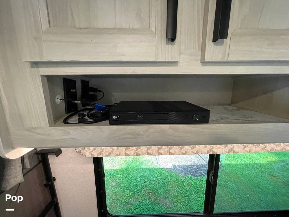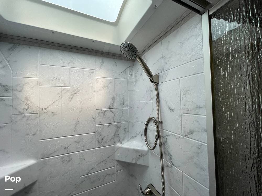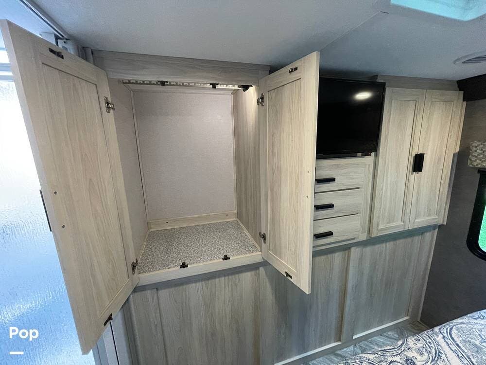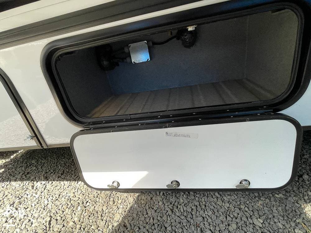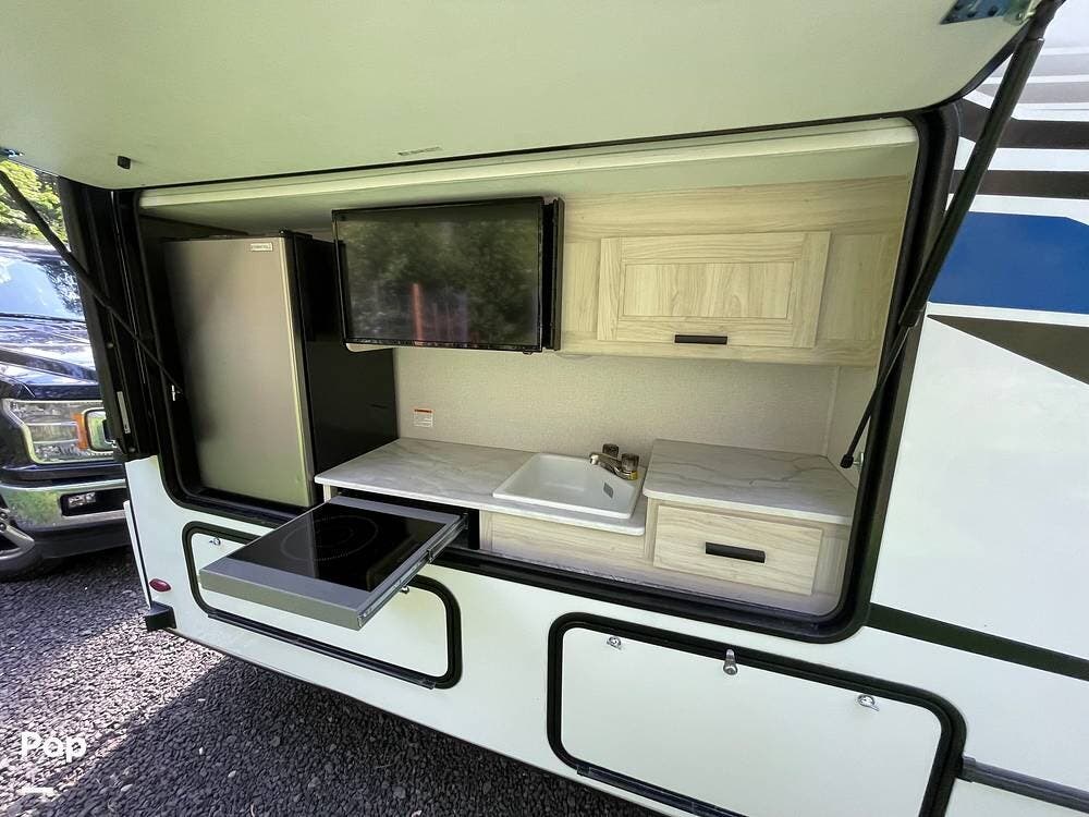 On the exterior, the Forester 2861DS is equipped with an outdoor kitchen that includes a small refrigerator, sink, and prep area, useful for those who enjoy spending time outdoors. The exterior also features a TV, marine-grade speakers, and ample storage compartments for gear.