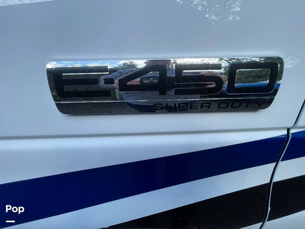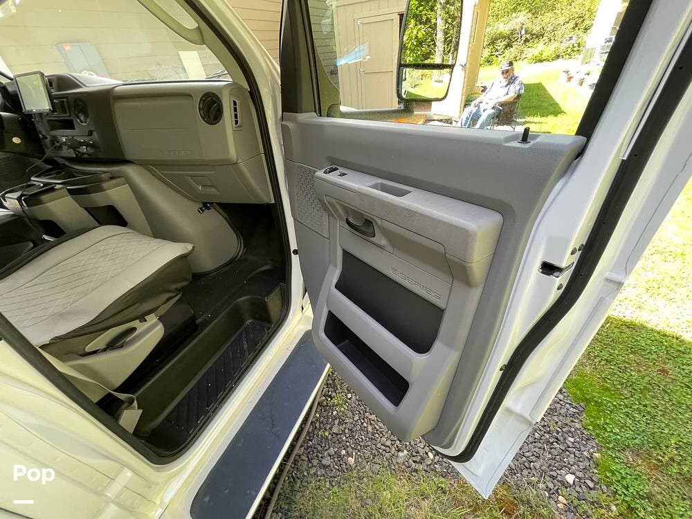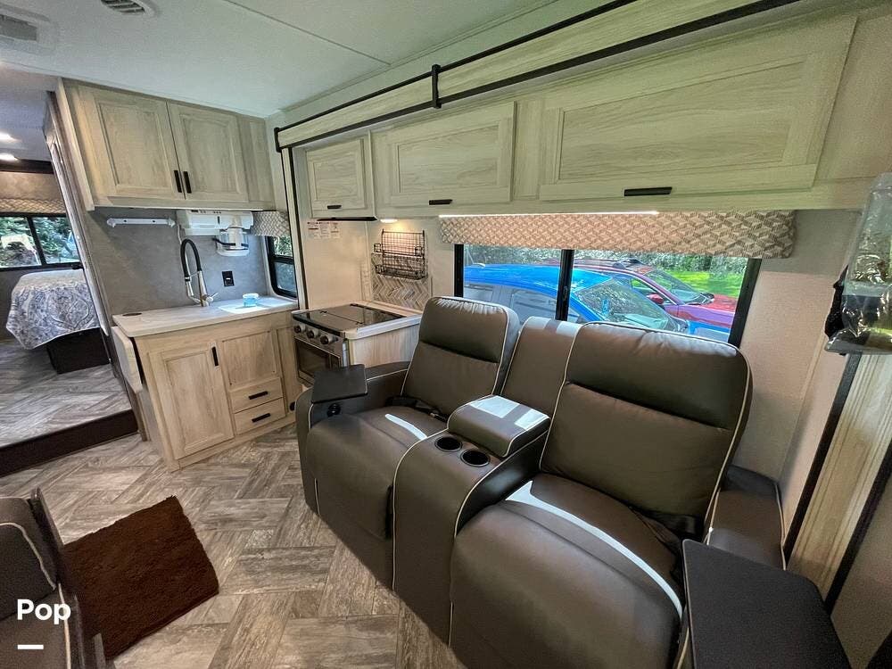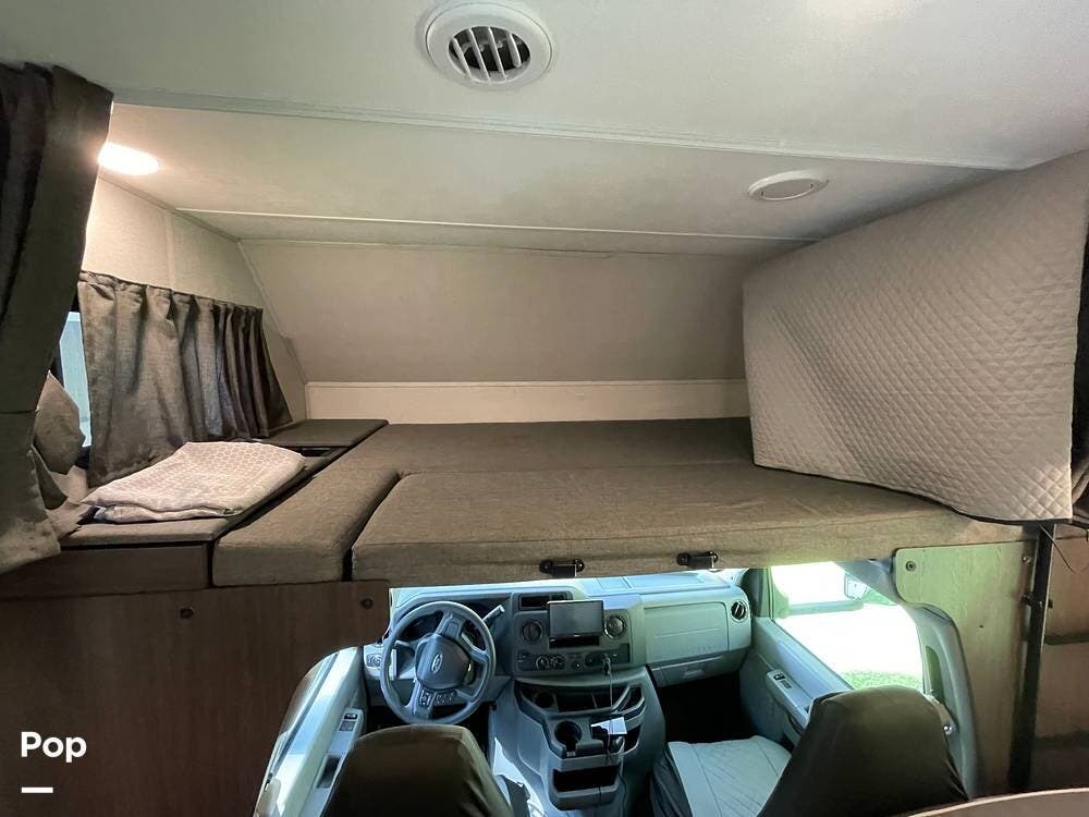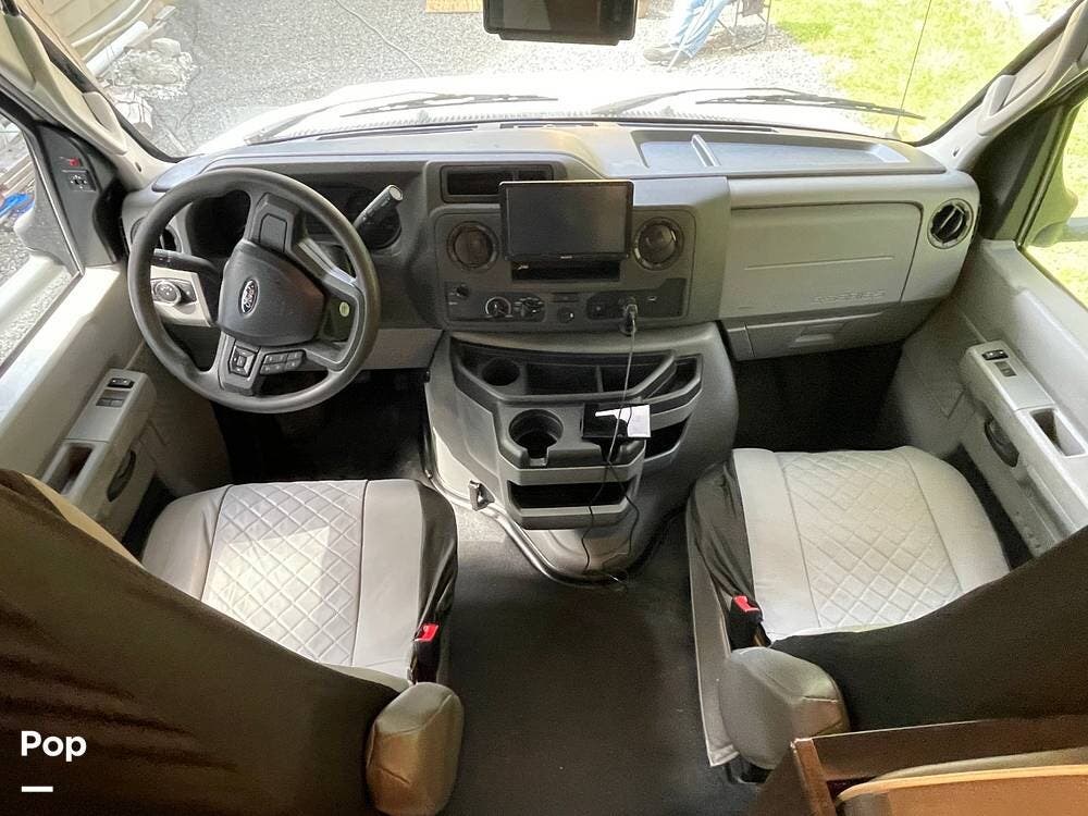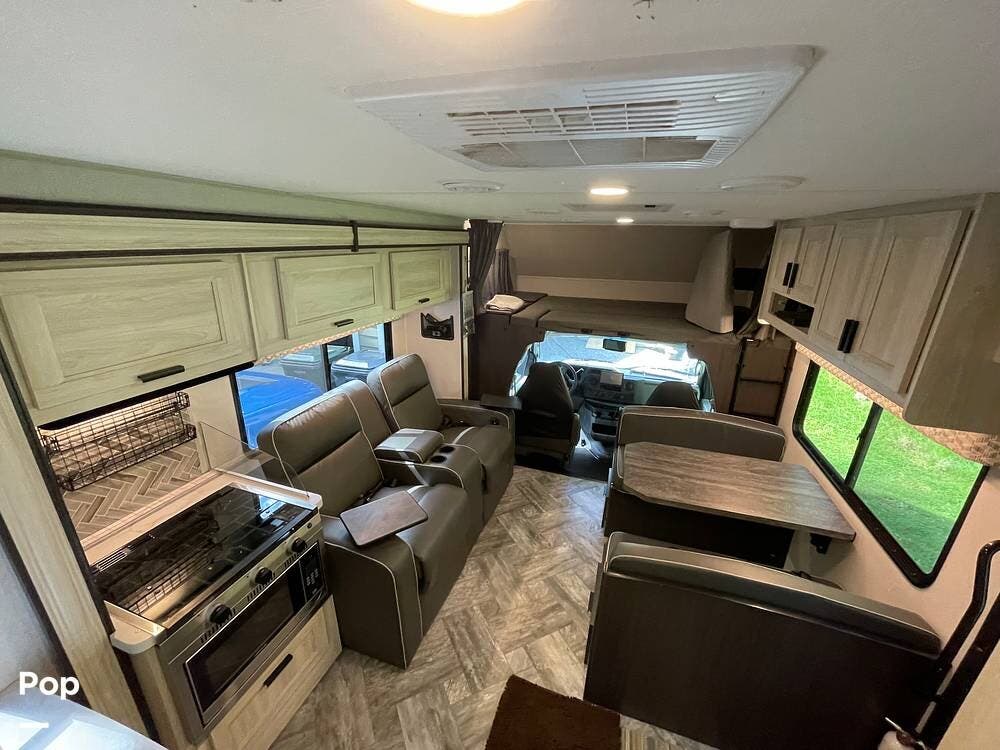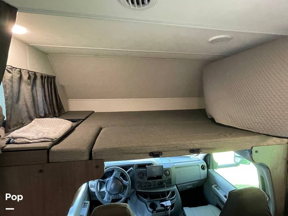 Built on a Ford E-450 chassis, this Class C motorhome includes dual slide-outs that enhance interior space, offering room to move comfortably throughout the cabin. In the main living area, a sofa and dinette provide seating for meals or relaxing, and the kitchen features a three-burner range, microwave, double-door refrigerator, and a deep sink with ample counter space.