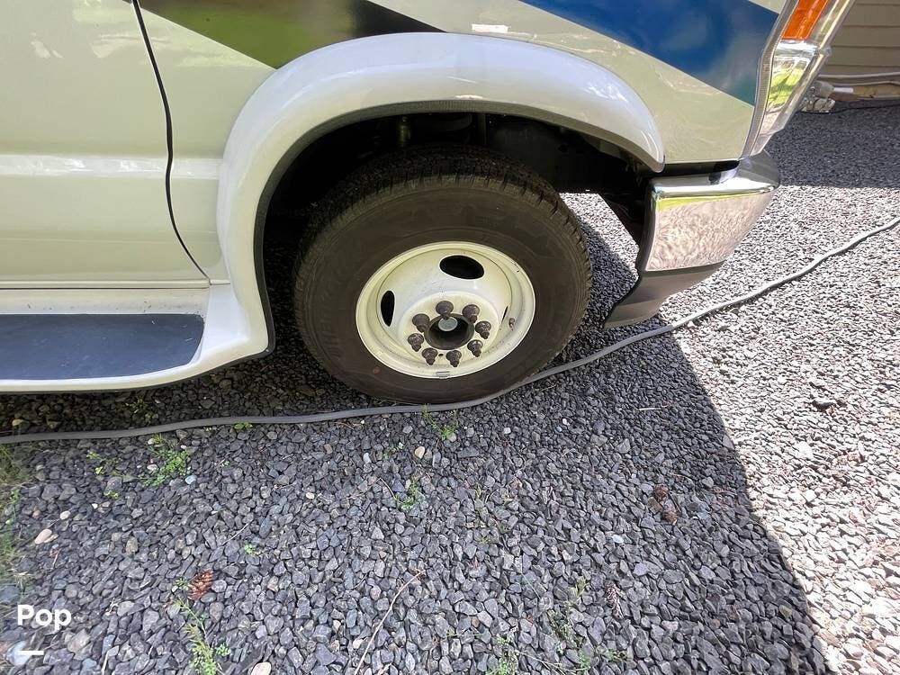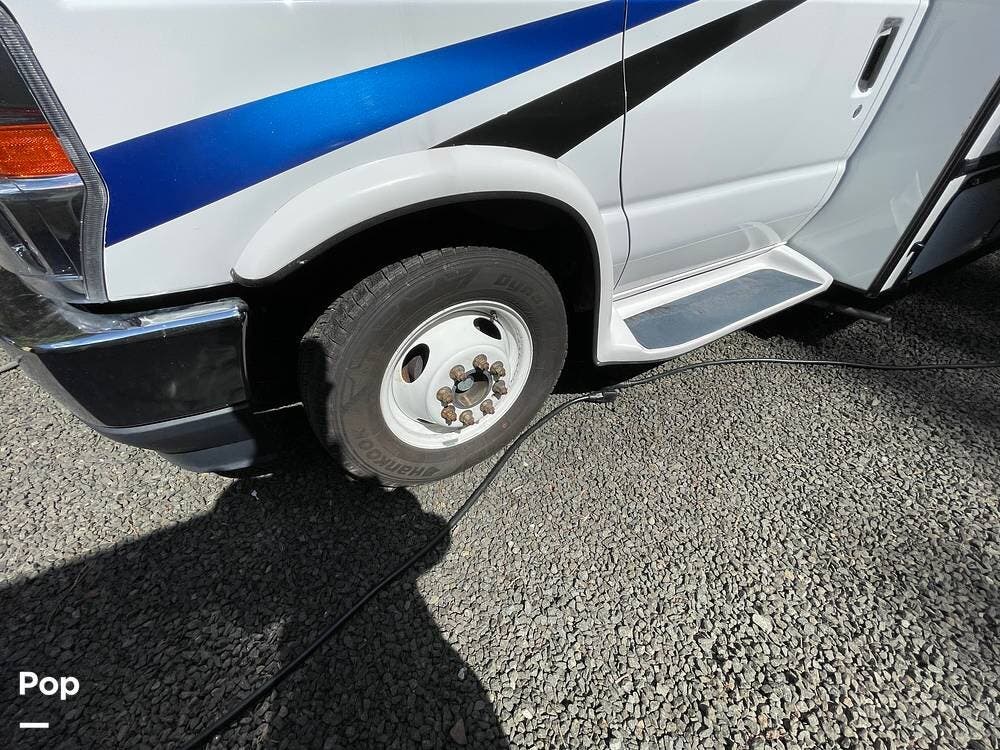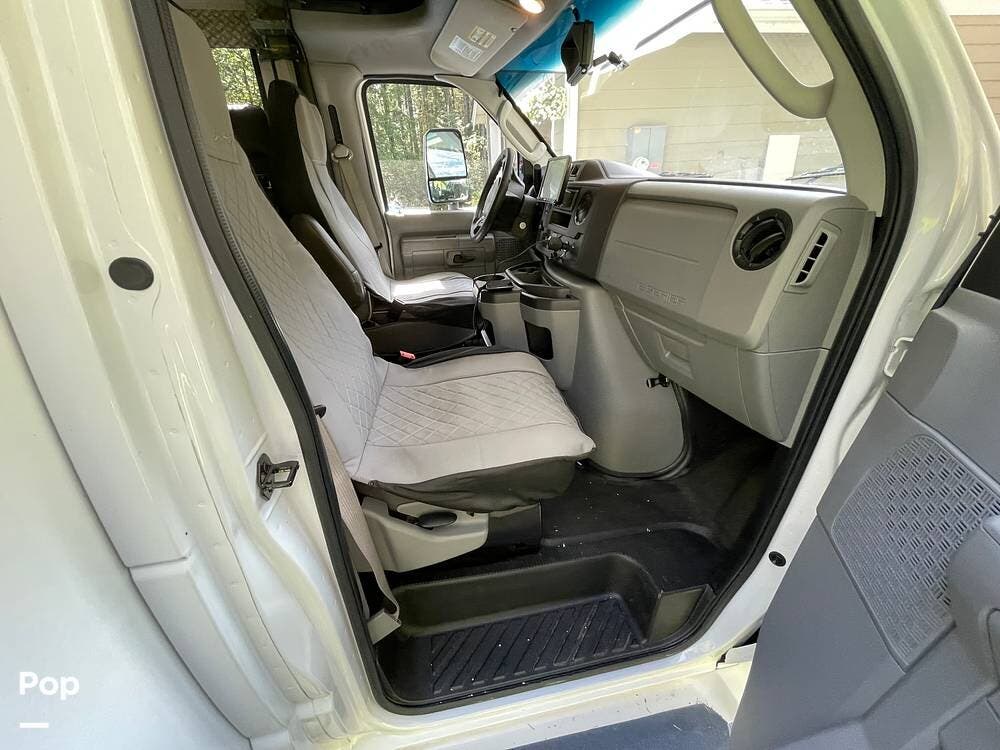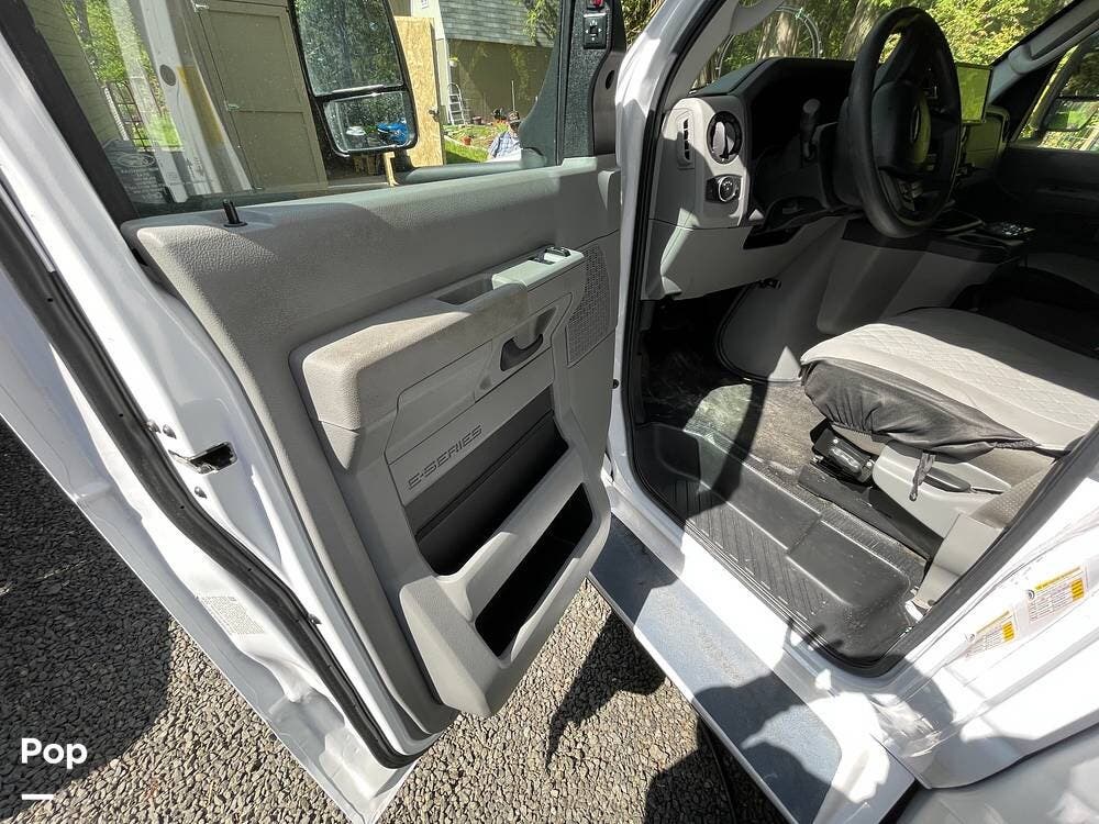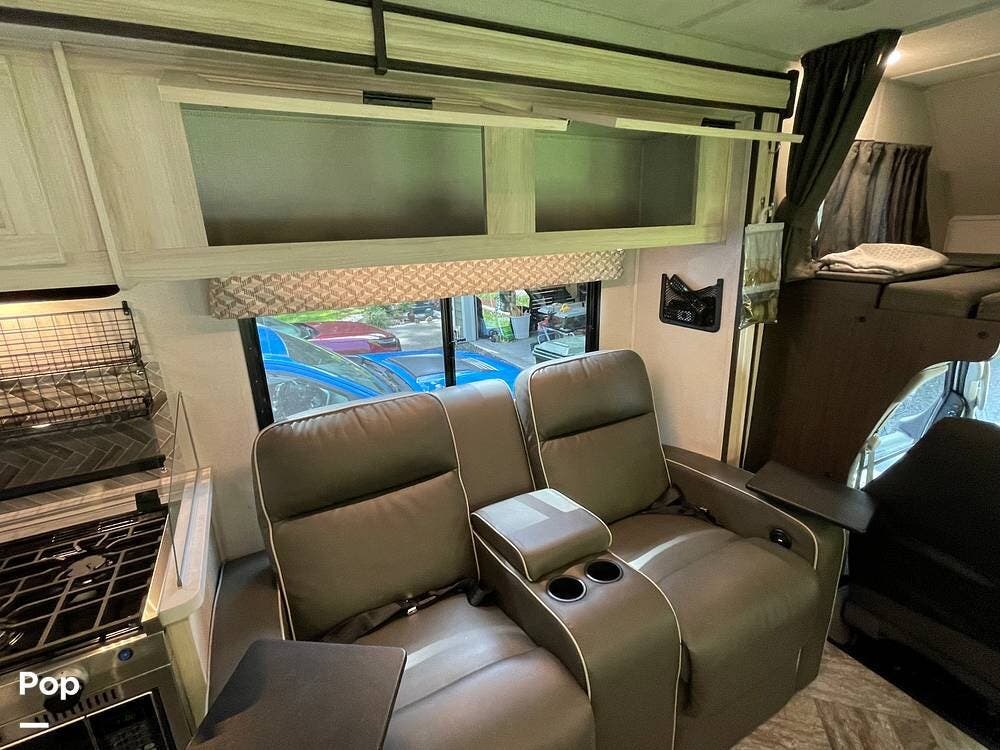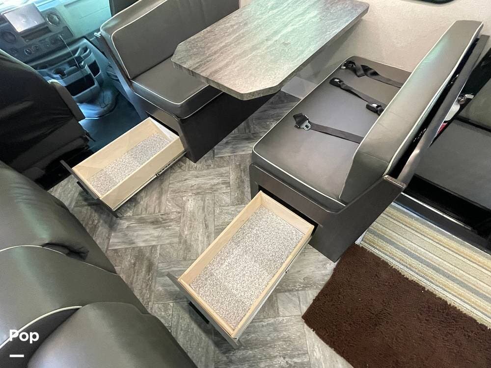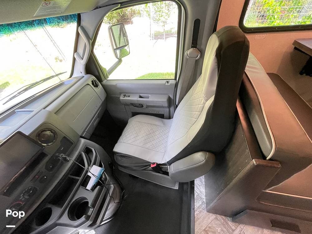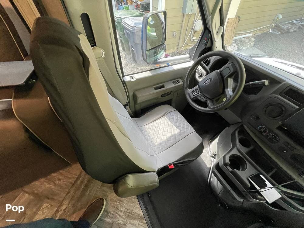 Built on a Ford E-450 chassis, this Class C motorhome includes dual slide-outs that enhance interior space, offering room to move comfortably throughout the cabin. In the main living area, a sofa and dinette provide seating for meals or relaxing, and the kitchen features a three-burner range, microwave, double-door refrigerator, and a deep sink with ample counter space.