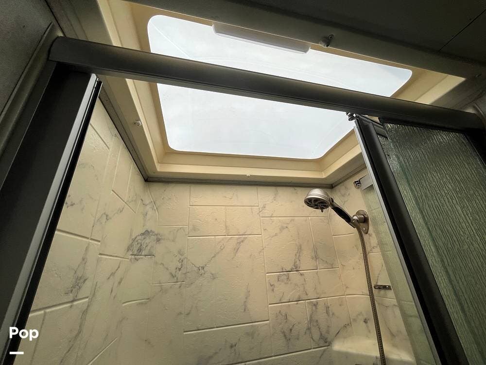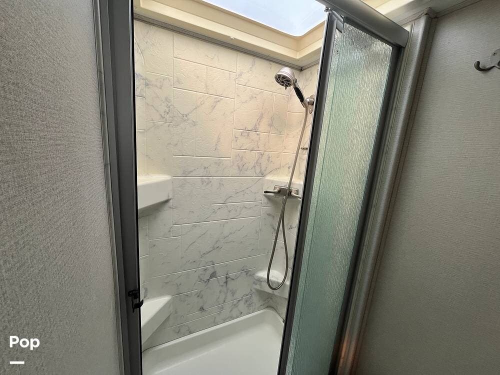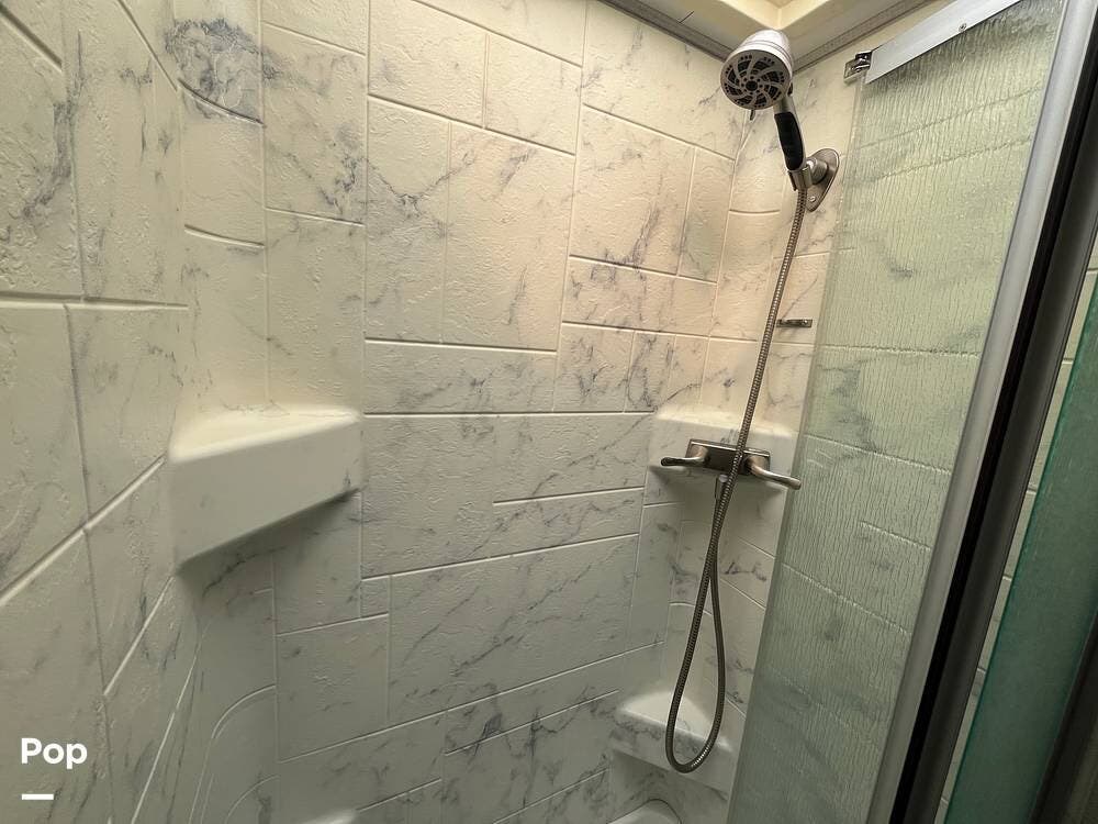 The mid-coach bathroom provides a large shower with glass doors and a sink vanity.