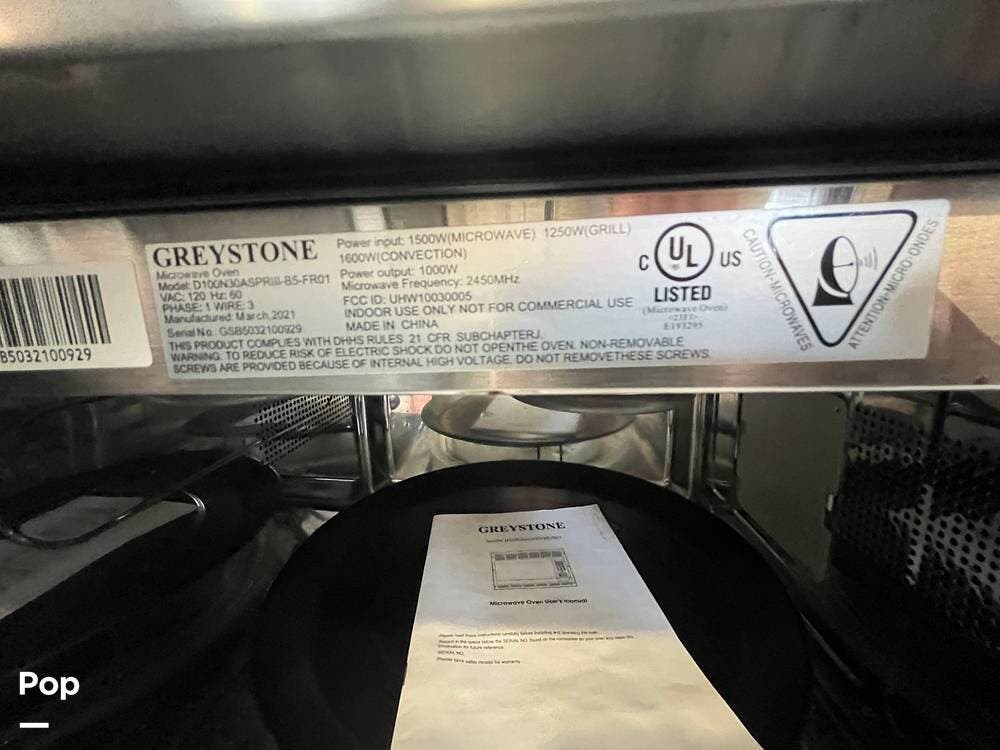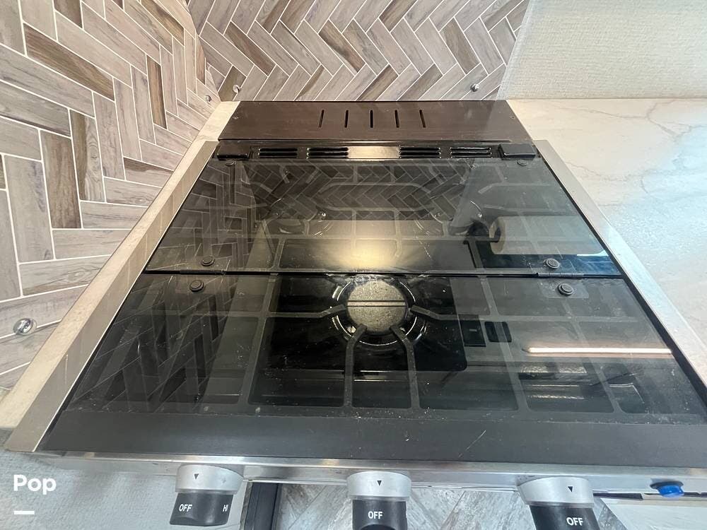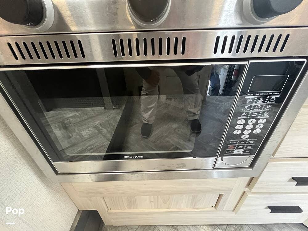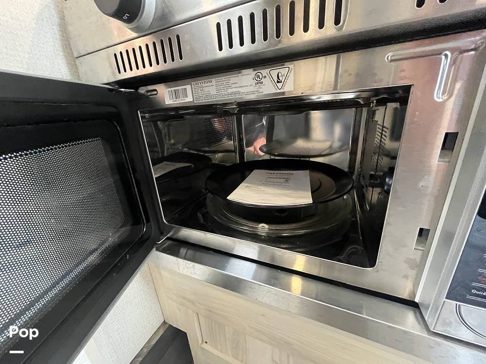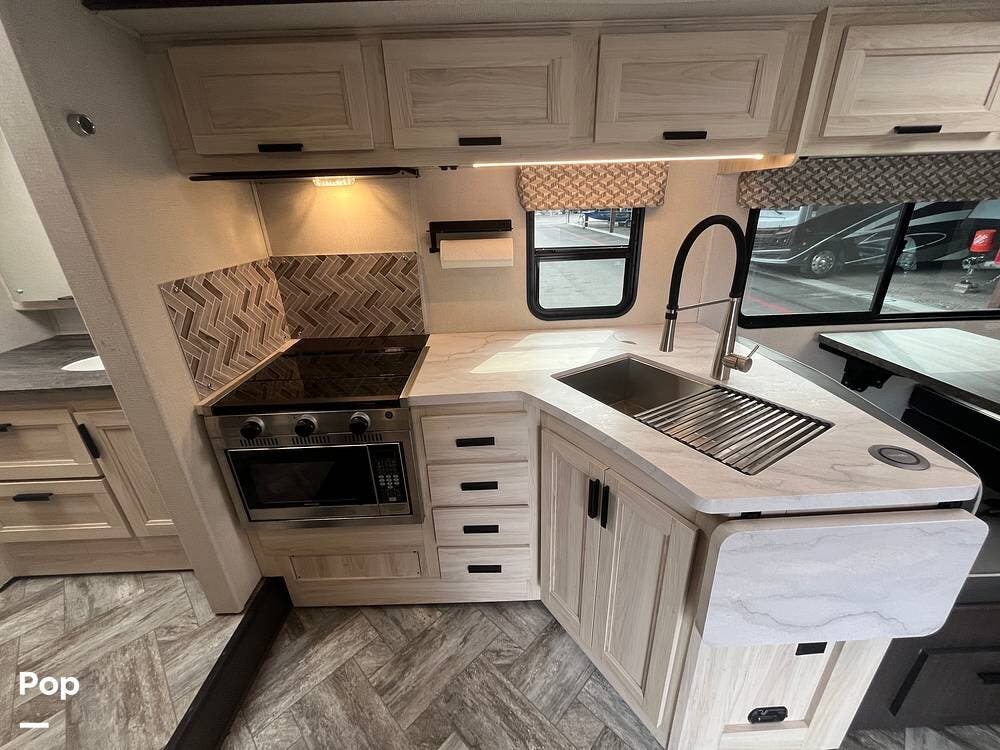 The kitchen includes a booth dinette, an angled kitchen sink with a countertop extension, a 3-burner cooktop, a microwave convection oven, a 10-cubic-foot stainless steel refrigerator/freezer, and a pantry. The overhead cabinets provide plenty of storage for all your kitchen items.