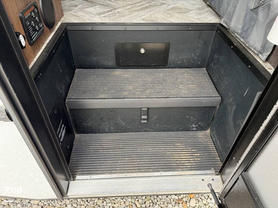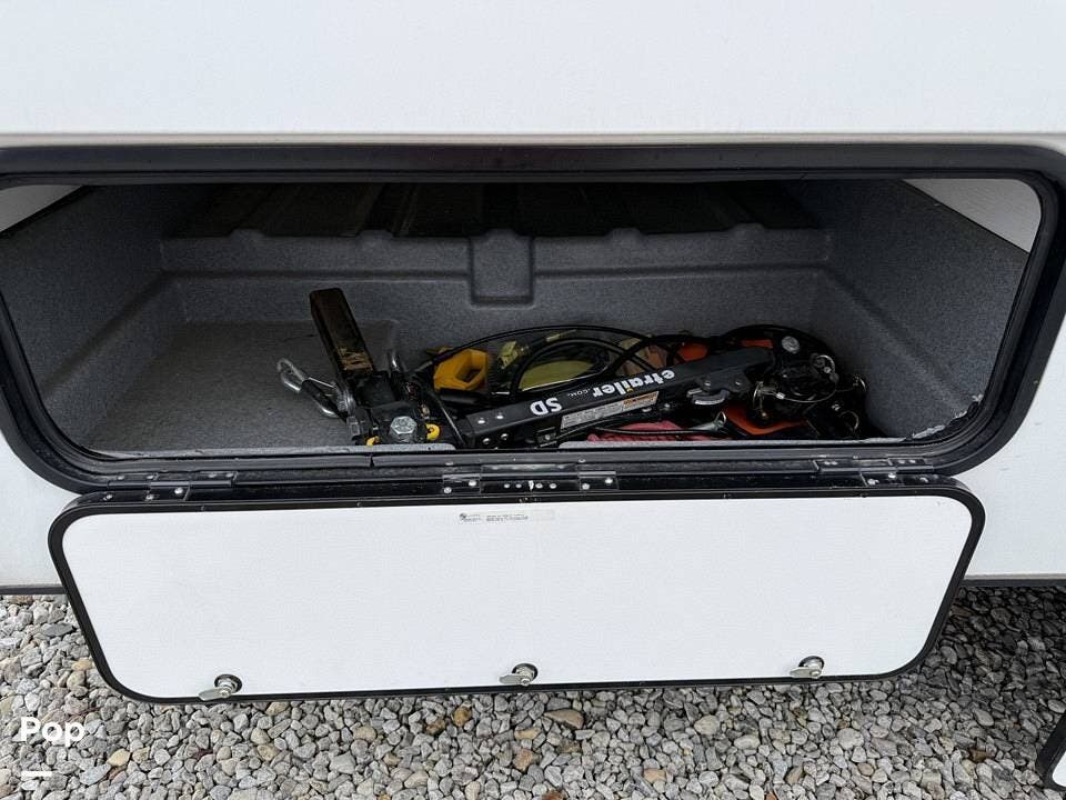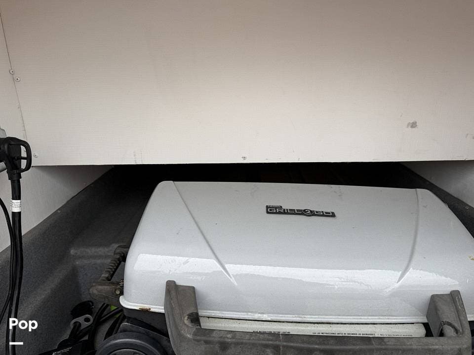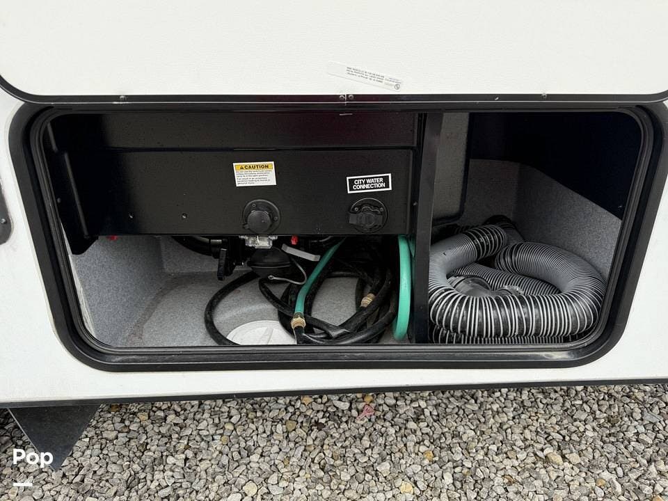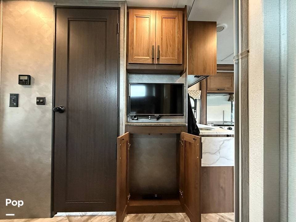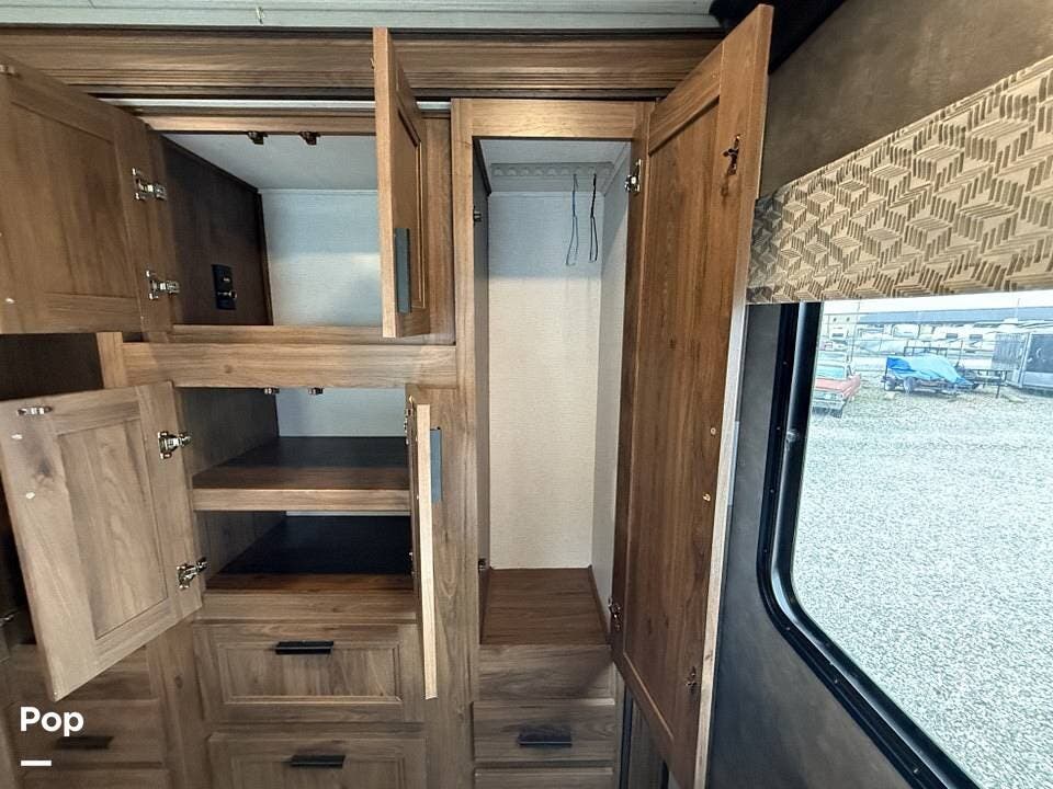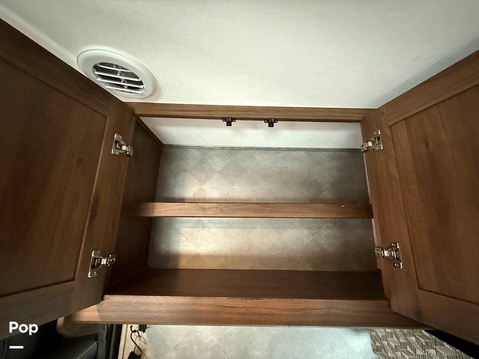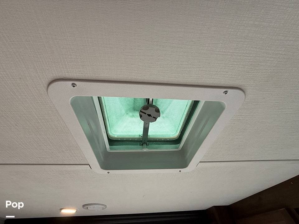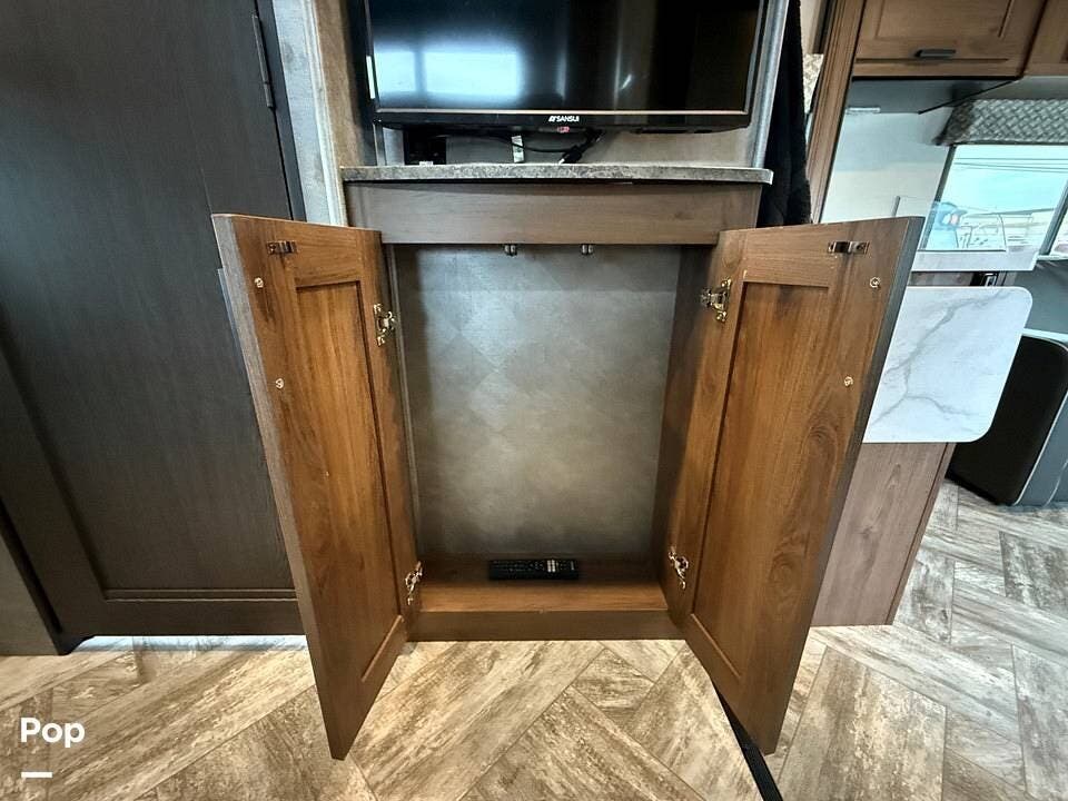 Comfort features include a 15,000 BTU ceiling-mounted ducted AC unit, a 30,000 BTU forced air furnace, and continuous hot water. Additional features include backup and side-view cameras for added safety while driving and parking, slide toppers to protect your slide-outs, a Wingard antenna with a Wi-Fi booster for staying connected, a roof ladder for access to the top of the coach, and a bumper-mounted storage rack for extra gear.