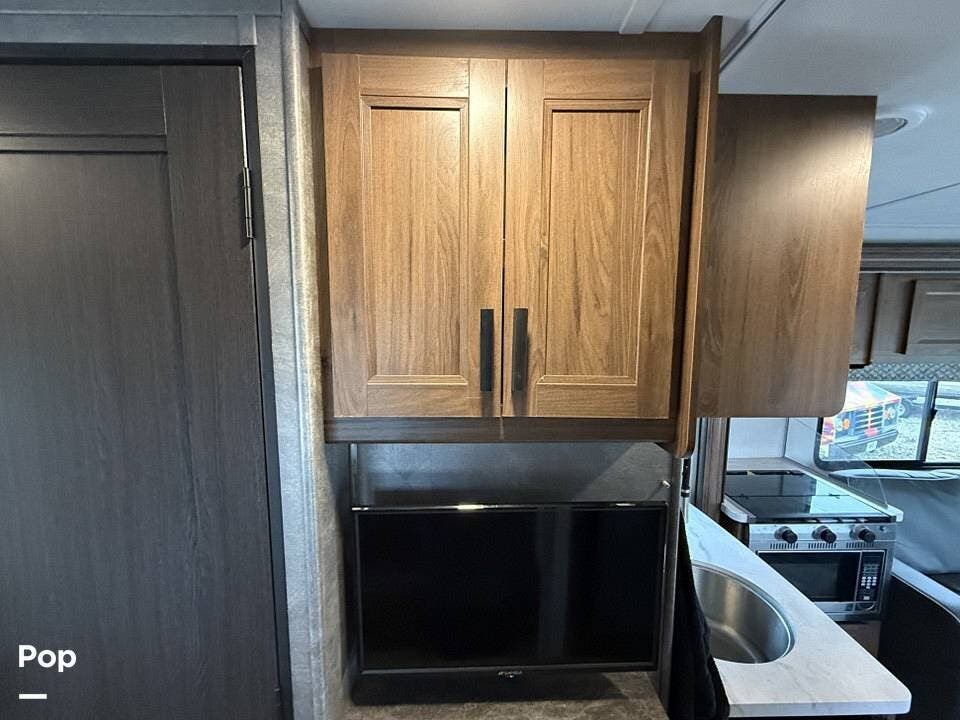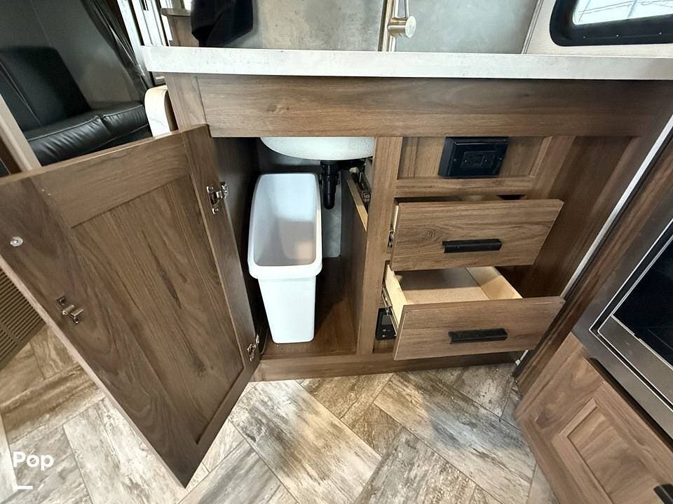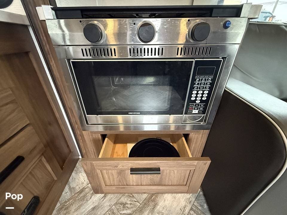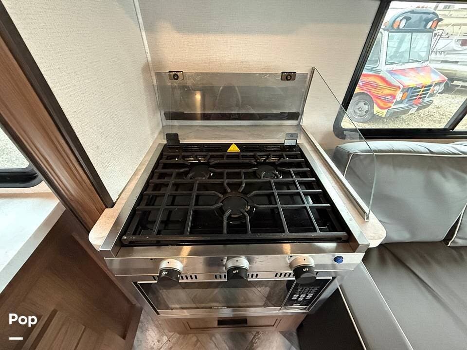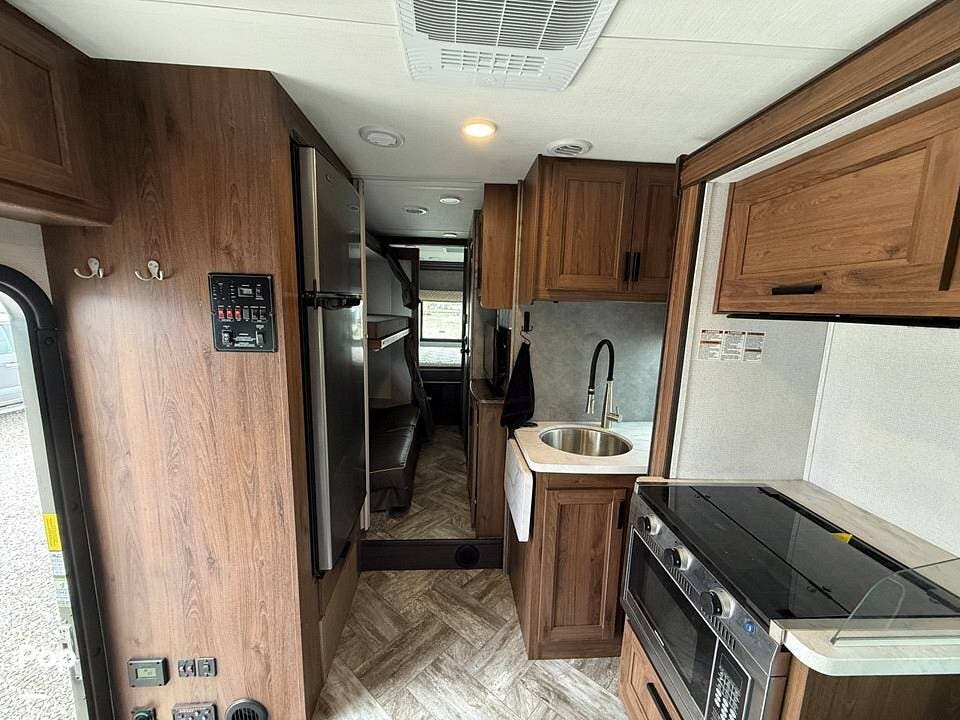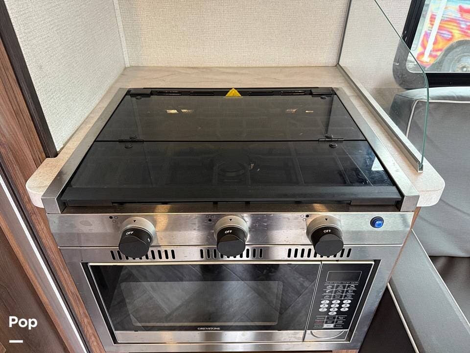 The galley kitchen is thoughtfully designed with a residential-sized refrigerator, a three-burner stove, a convection microwave oven, a deep sink, and a generous prep area--perfect for cooking meals on the road.