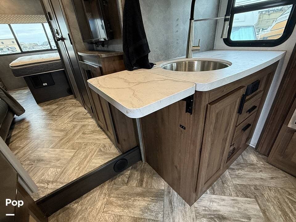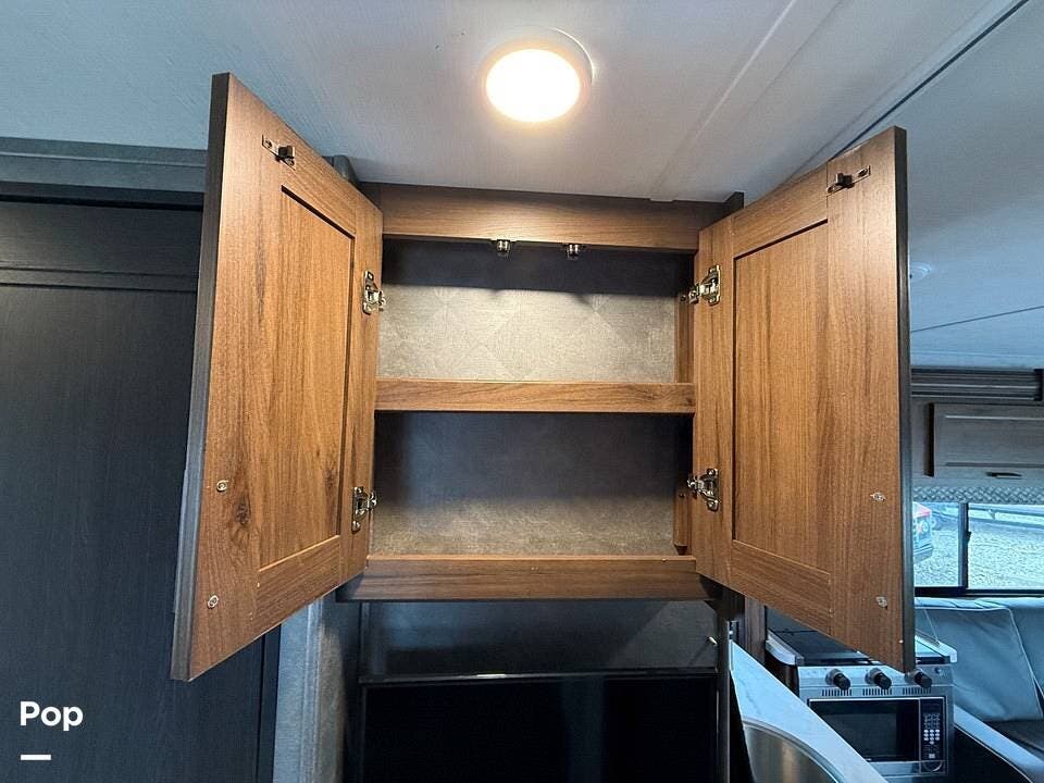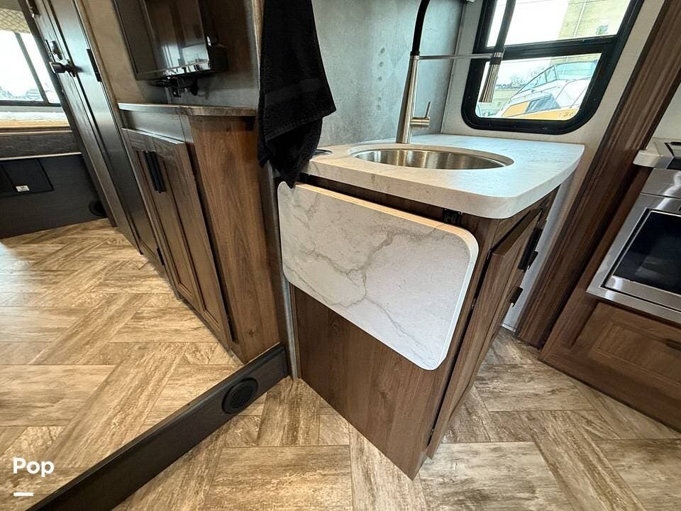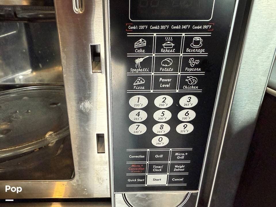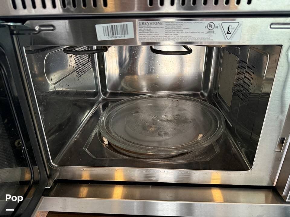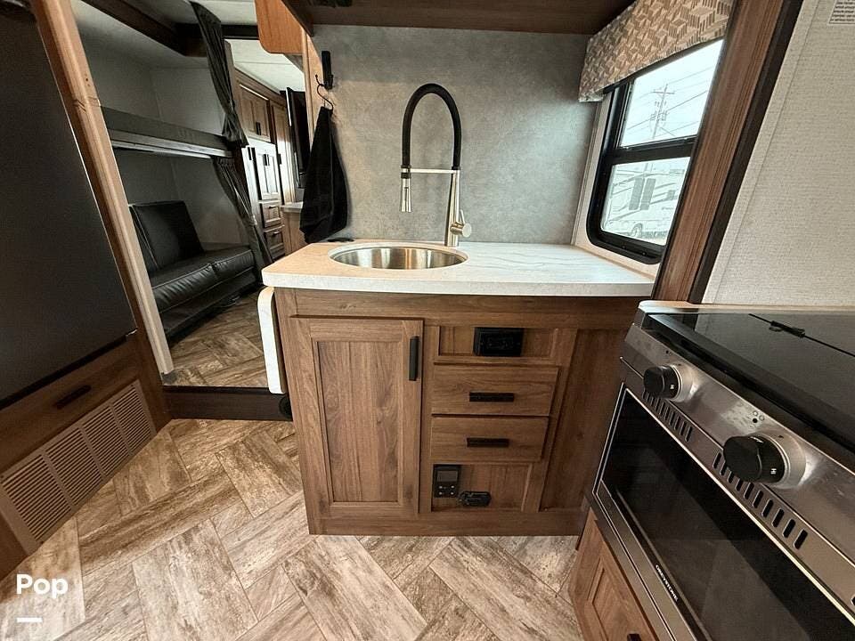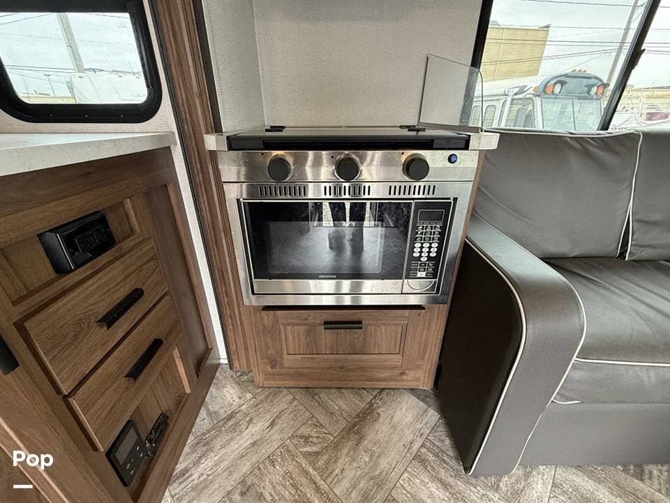 The galley kitchen is thoughtfully designed with a residential-sized refrigerator, a three-burner stove, a convection microwave oven, a deep sink, and a generous prep area--perfect for cooking meals on the road.