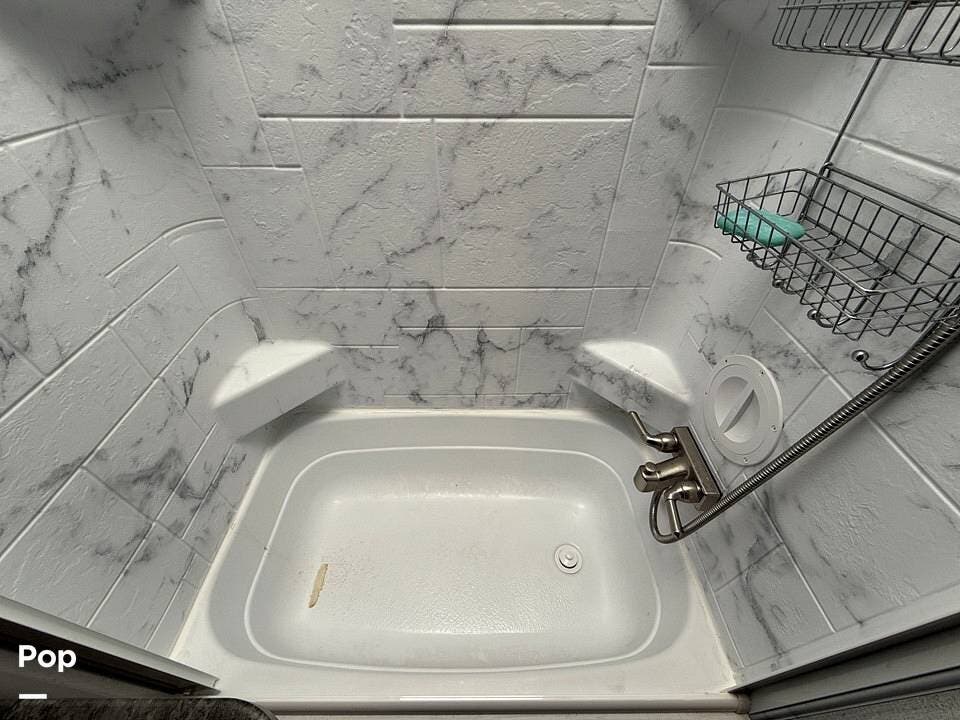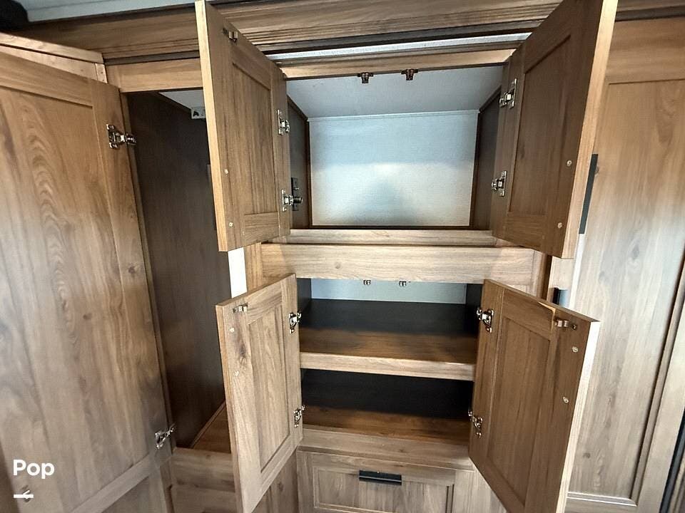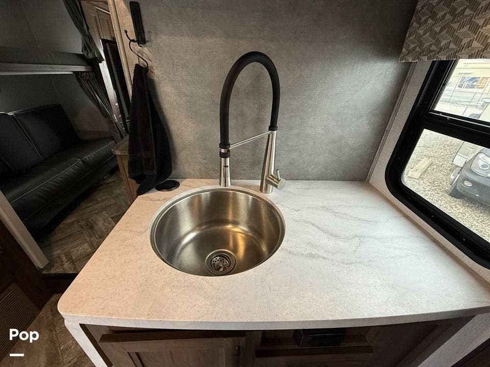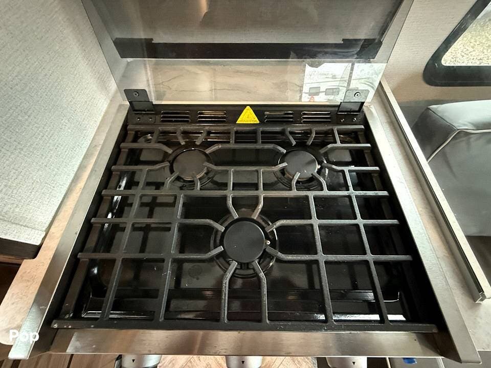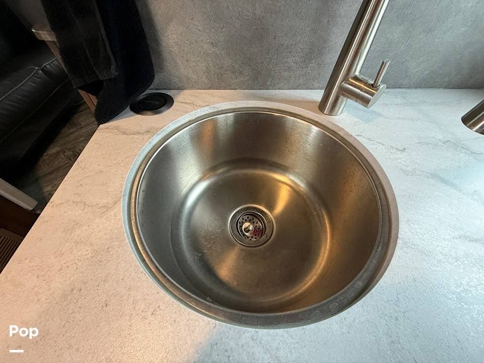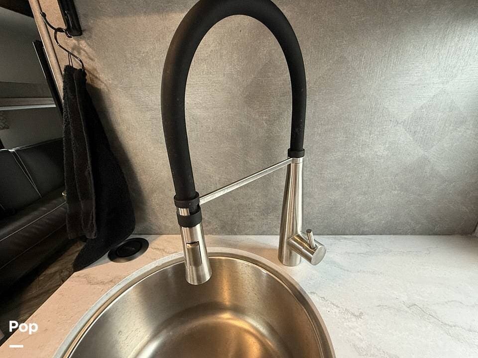 The galley kitchen is thoughtfully designed with a residential-sized refrigerator, a three-burner stove, a convection microwave oven, a deep sink, and a generous prep area--perfect for cooking meals on the road.