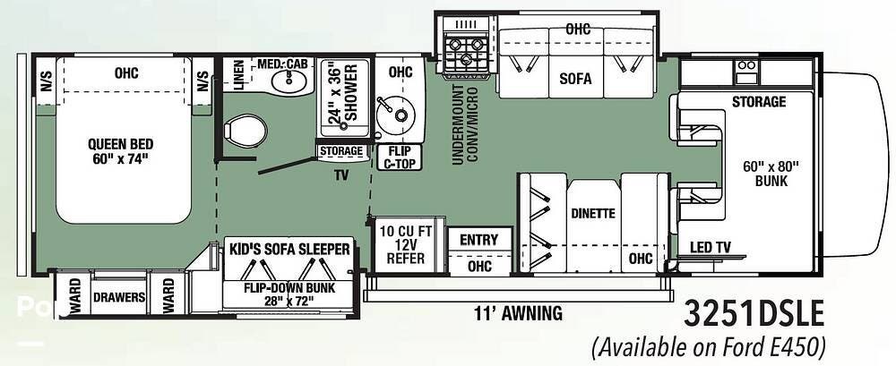 This coach offers a smooth ride and plenty of power. It is built on a Ford E-450 chassis and powered by a 7.3L Triton V8 engine that produces 350 horsepower. The 6-speed TorqShift transmission ensures responsive handling, while its impressive 7,500 lb. towing capacity means you can easily bring along a trailer, towed vehicle, or recreational gear. A 4.0kW generator provides plenty of off-grid power.