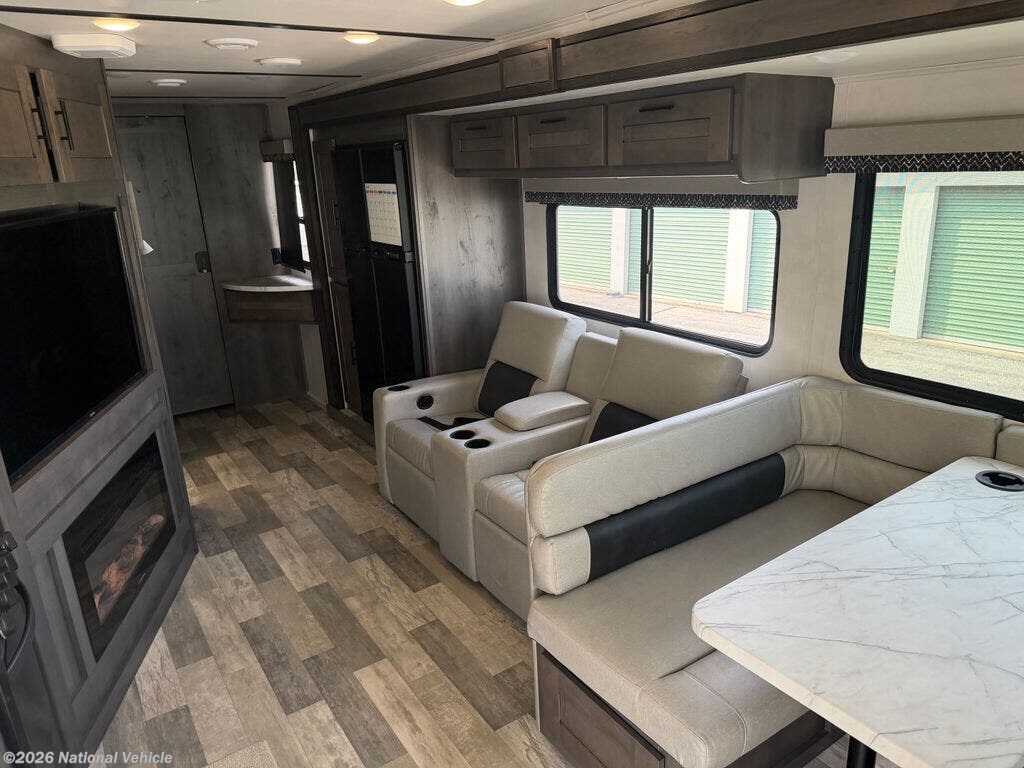 Inside, you?ll immediately notice the premium finishes, including beautiful Corian solid-surface countertops, abundant cabinetry, and thoughtful design throughout. The living area is built for relaxation with plush theater seating, an inviting electric fireplace, and entertainment at every turn.