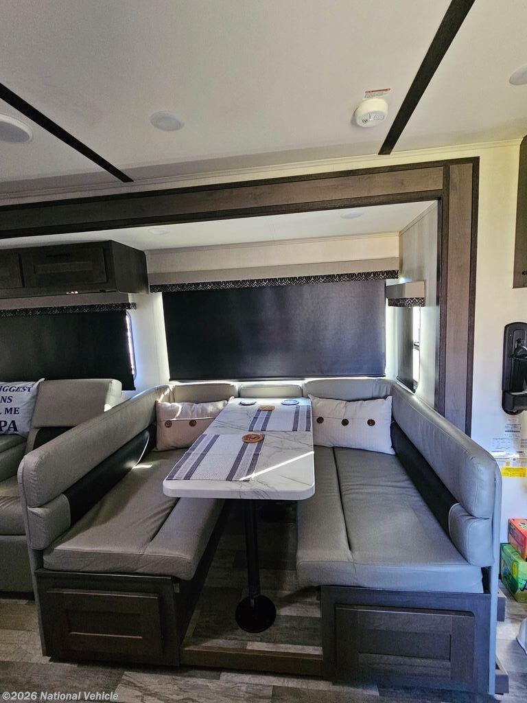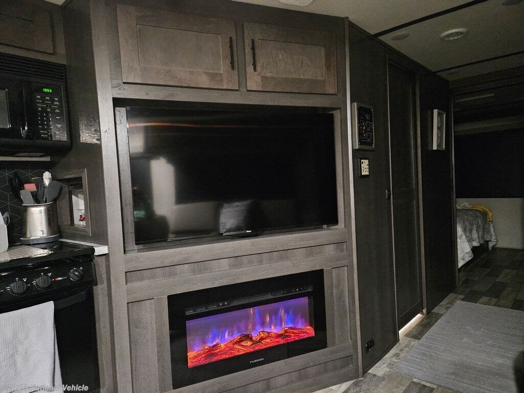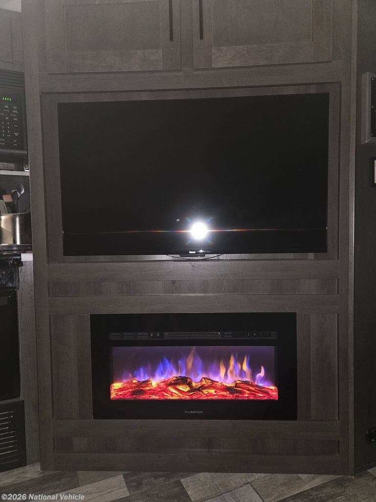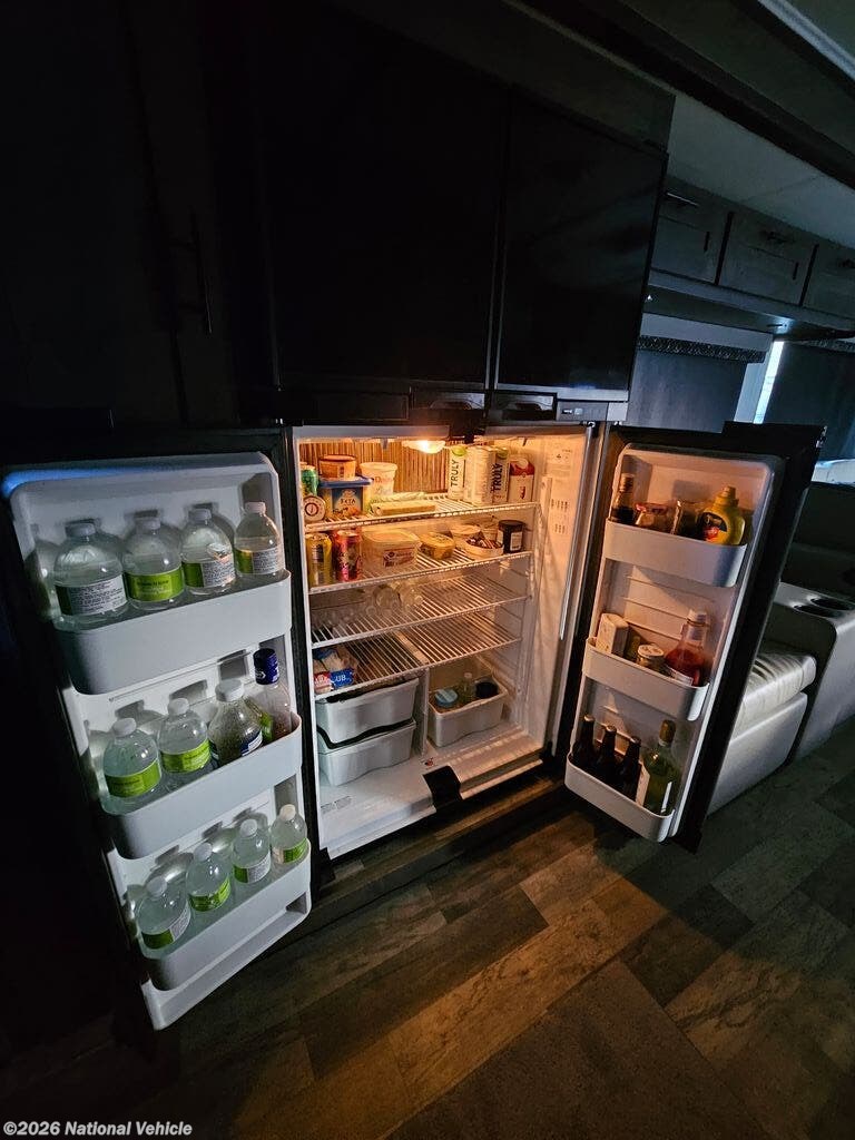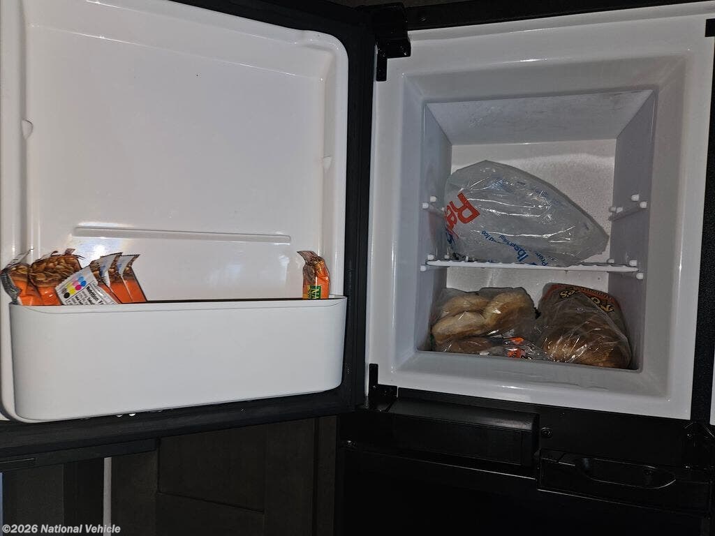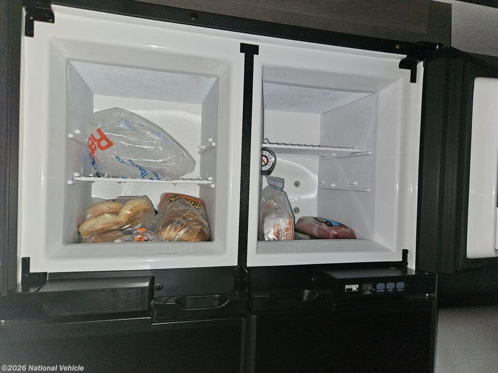 Enjoy the 12-cu. ft. four-door refrigerator (propane or 110V) to stock up on ingredients, snacks, and beverages for when the kids join you in this FR3. Everyone can dine at the wrap-around booth dinette and at the cockpit table with captain's chairs on each side, or maybe everyone decides to dine outside under the power awning on your own camping chairs. There is a TV along the exterior to watch and plenty of storage compartments to store your camping gear. Back inside, the full bathroom will keep you refreshed and ready for whatever is next. You can retire to the master bedroom's king-size bed while others sleep on the furniture and power overhead bunk.