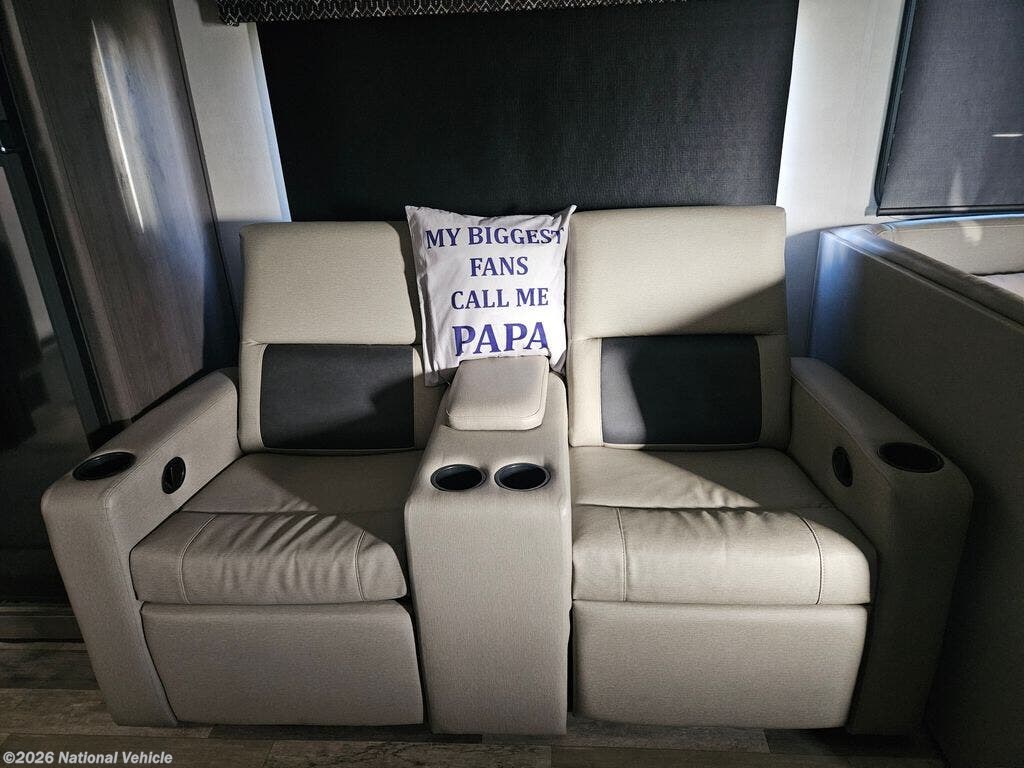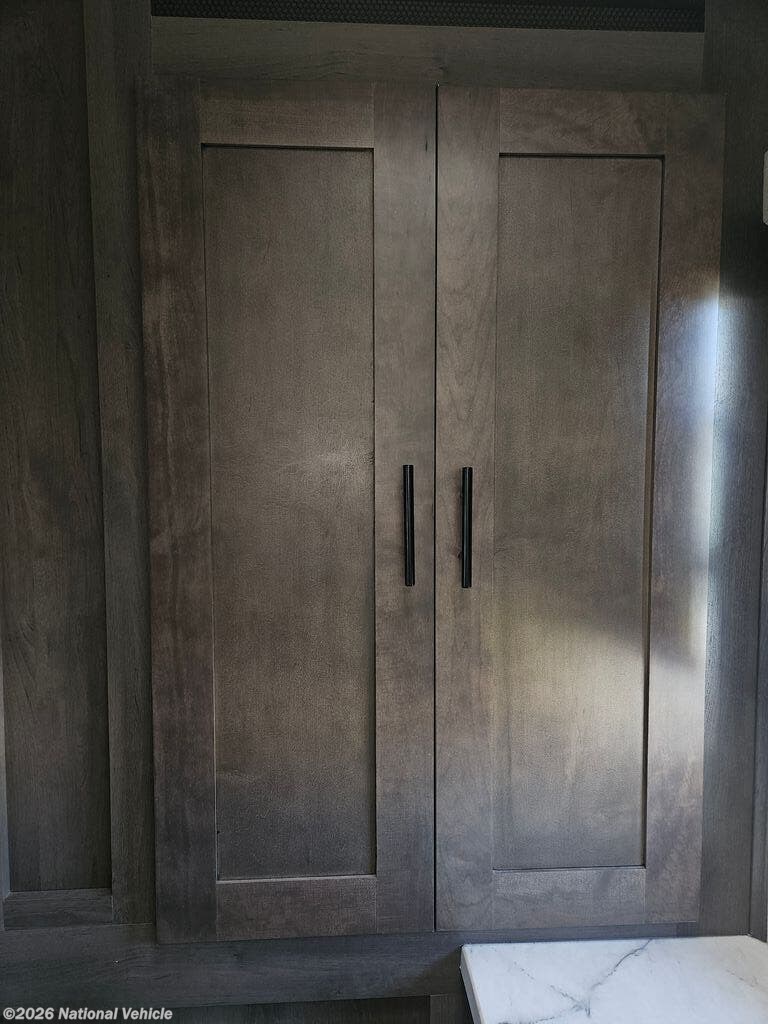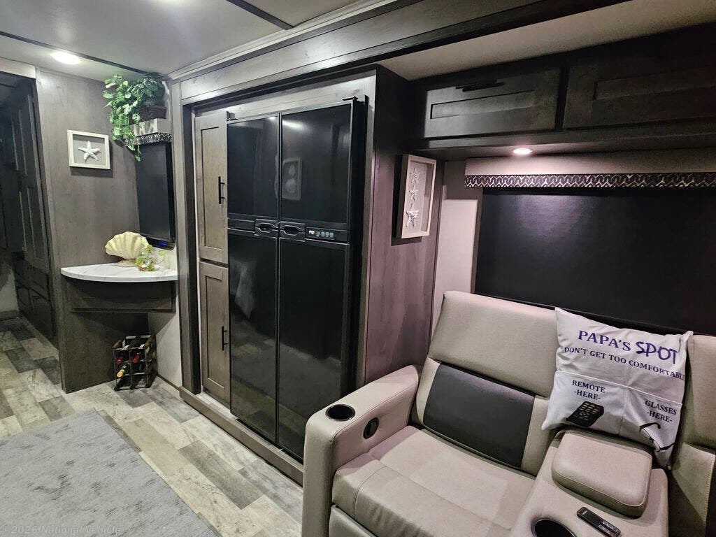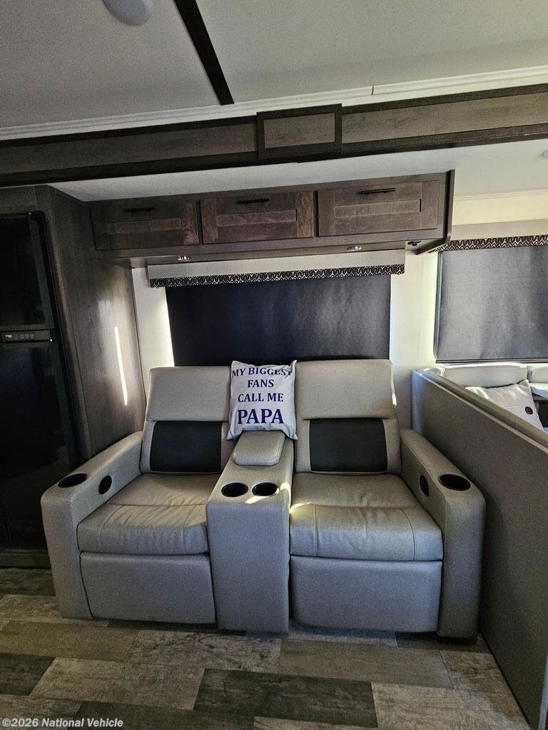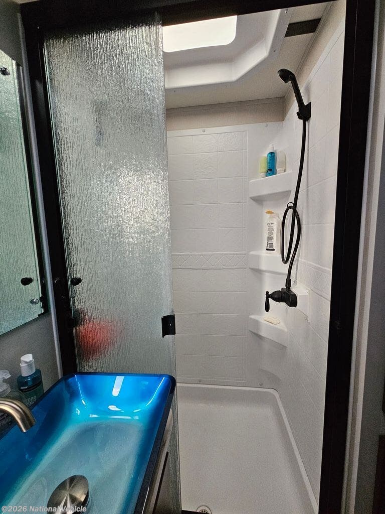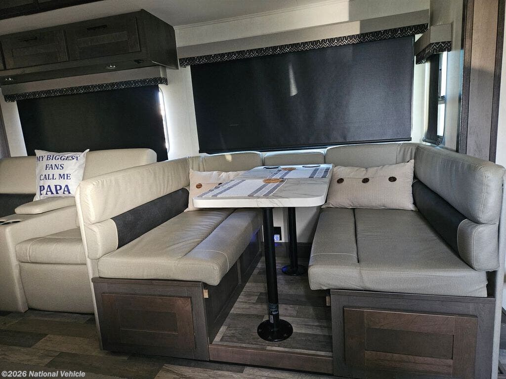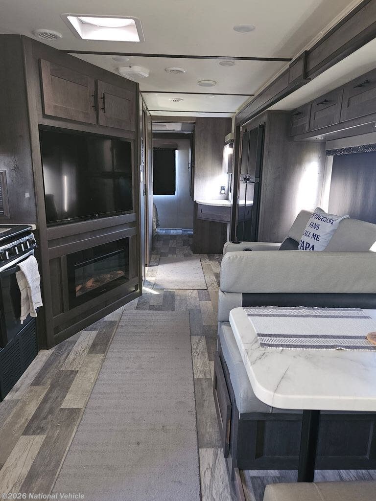 Enjoy the 12-cu. ft. four-door refrigerator (propane or 110V) to stock up on ingredients, snacks, and beverages for when the kids join you in this FR3. Everyone can dine at the wrap-around booth dinette and at the cockpit table with captain's chairs on each side, or maybe everyone decides to dine outside under the power awning on your own camping chairs. There is a TV along the exterior to watch and plenty of storage compartments to store your camping gear. Back inside, the full bathroom will keep you refreshed and ready for whatever is next. You can retire to the master bedroom's king-size bed while others sleep on the furniture and power overhead bunk.