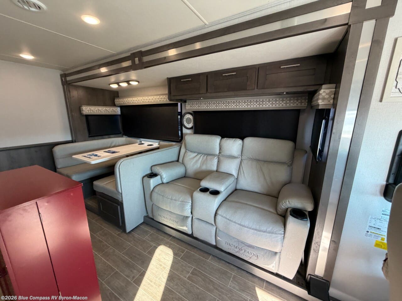 You won't believe all that this motorhome has to offer! Starting with the two full bathrooms, one of which creates a master suite. Inside the master suite, you will find a 72" x 80" king bed slide across from a dresser with a 32" LED TV and wardrobes on either side, as well as access to the full rear bathroom which has a shower with a seat and a wardrobe that is prepped to add an optional washer and dryer. The set of bunk beds are conveniently across from the second full bathroom which has an angled shower. As if that wasn't enough sleeping spaces, there is also a 42" x 80" P2K Euro loft power bunk over cab and the Dream Dinette and hide-a-bed sofa can also transform into extra sleeping spaces, but if you don't need that much sleeping area then you can switch out the sofa for the optional Thomas Payne theater seating with heat and massage for a truly relaxing evening in front of the 40" LED TV!