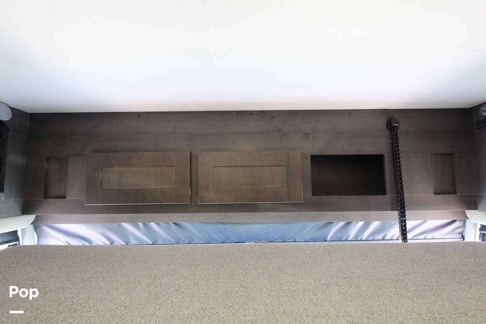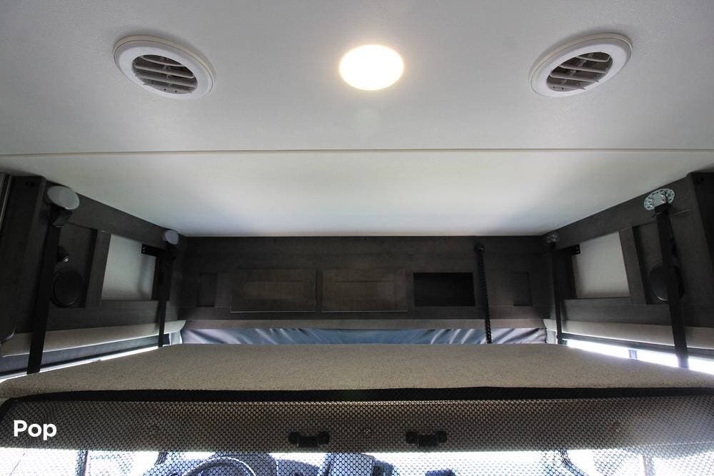 The front living space has an open feel, with a light-colored interior and plenty of cabinet/storage space. In addition to the convertible dinette, there's a cab-over full bed!