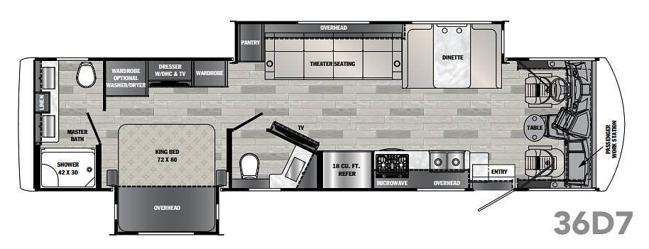 The GT7 series Georgetown features a beautiful shine throughout the cabinetry. It features a comfortable layout ideal for full-time living or traveling the country. This coach features a 1.5 bath, a washer and dryer, and a huge, comfortable sofa to relax on.